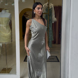 Abito lungo dal fascino raffinato e contemporaneo, caratterizzato da una linea fluida che accarezza la silhouette con eleganza. Il design monospalla dona un tocco moderno e ricercato, esaltando la figura.