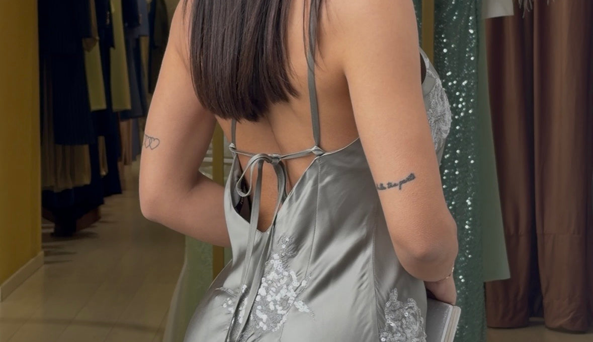 La vestibilità morbida accompagna ogni movimento con grazia, rendendo questo abito ideale per cerimonie, eventi speciali o serate eleganti. Un capo che unisce femminilità, stile e raffinatezza in un equilibrio perfetto.