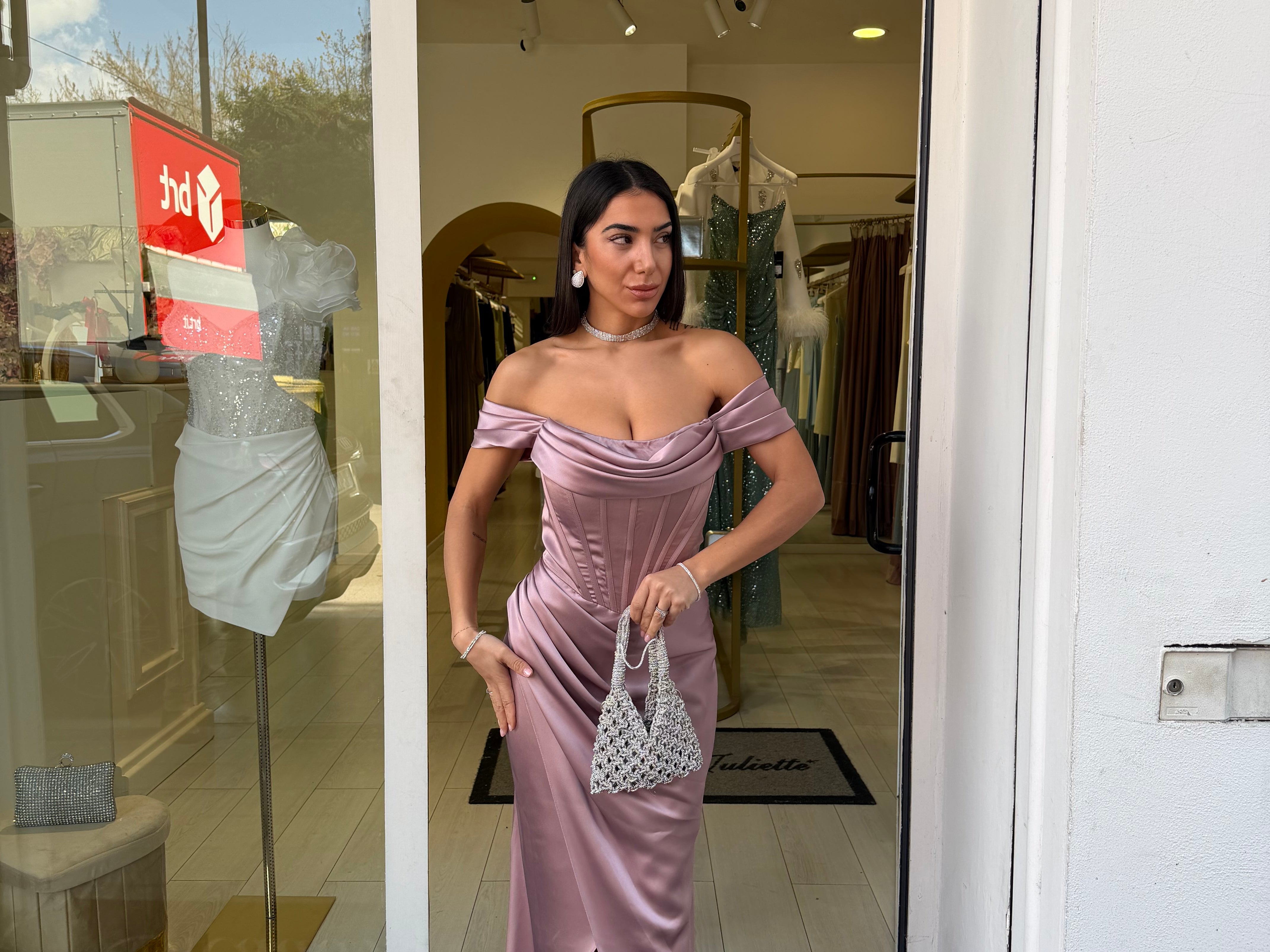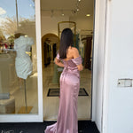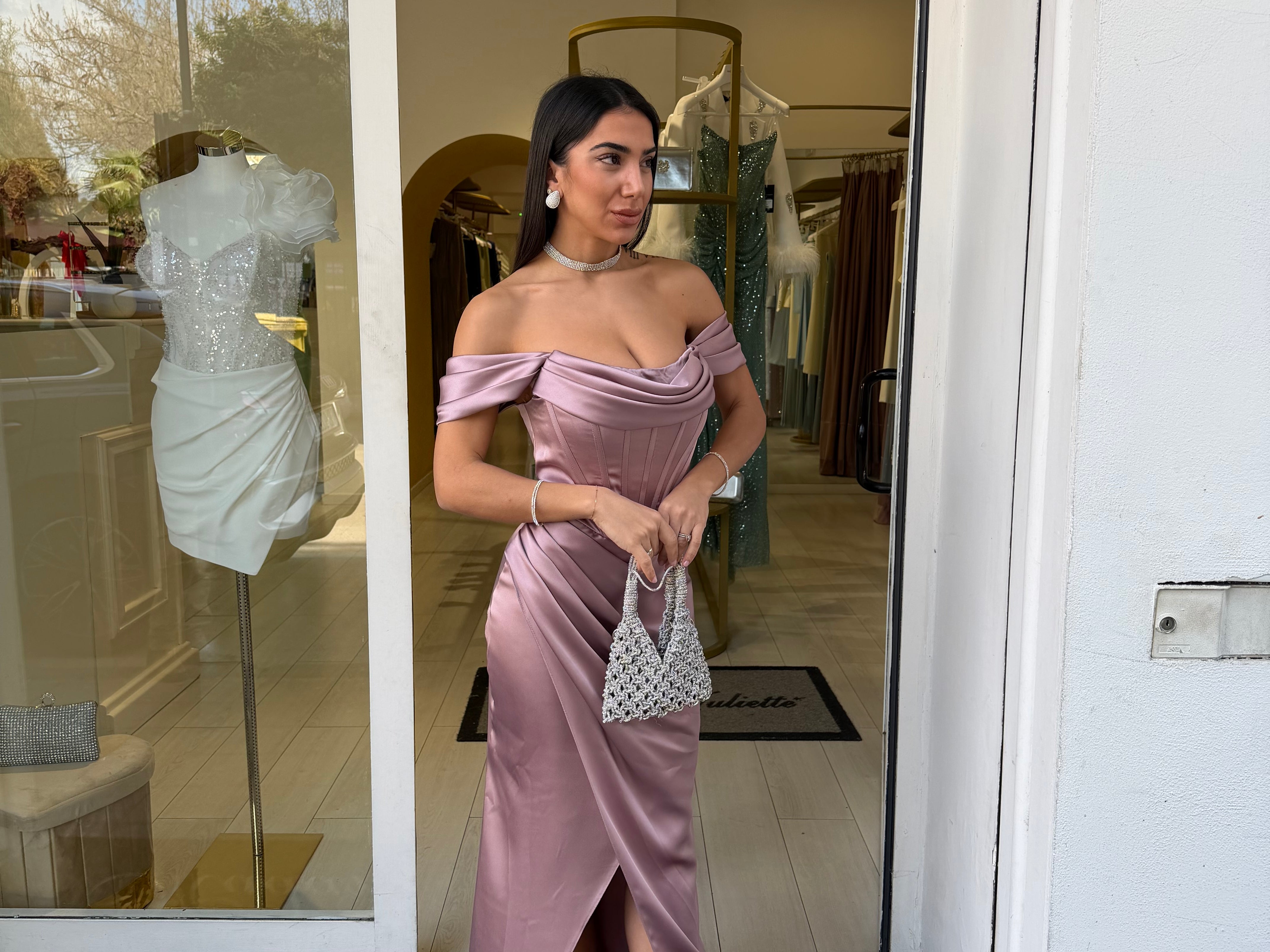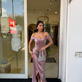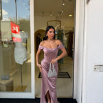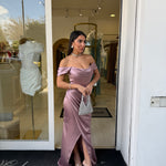 Il design off-shoulder con drappeggio sul décolleté dona un tocco sofisticato, mentre la gonna avvolgente con spacco frontale slancia la figura con sensualità.