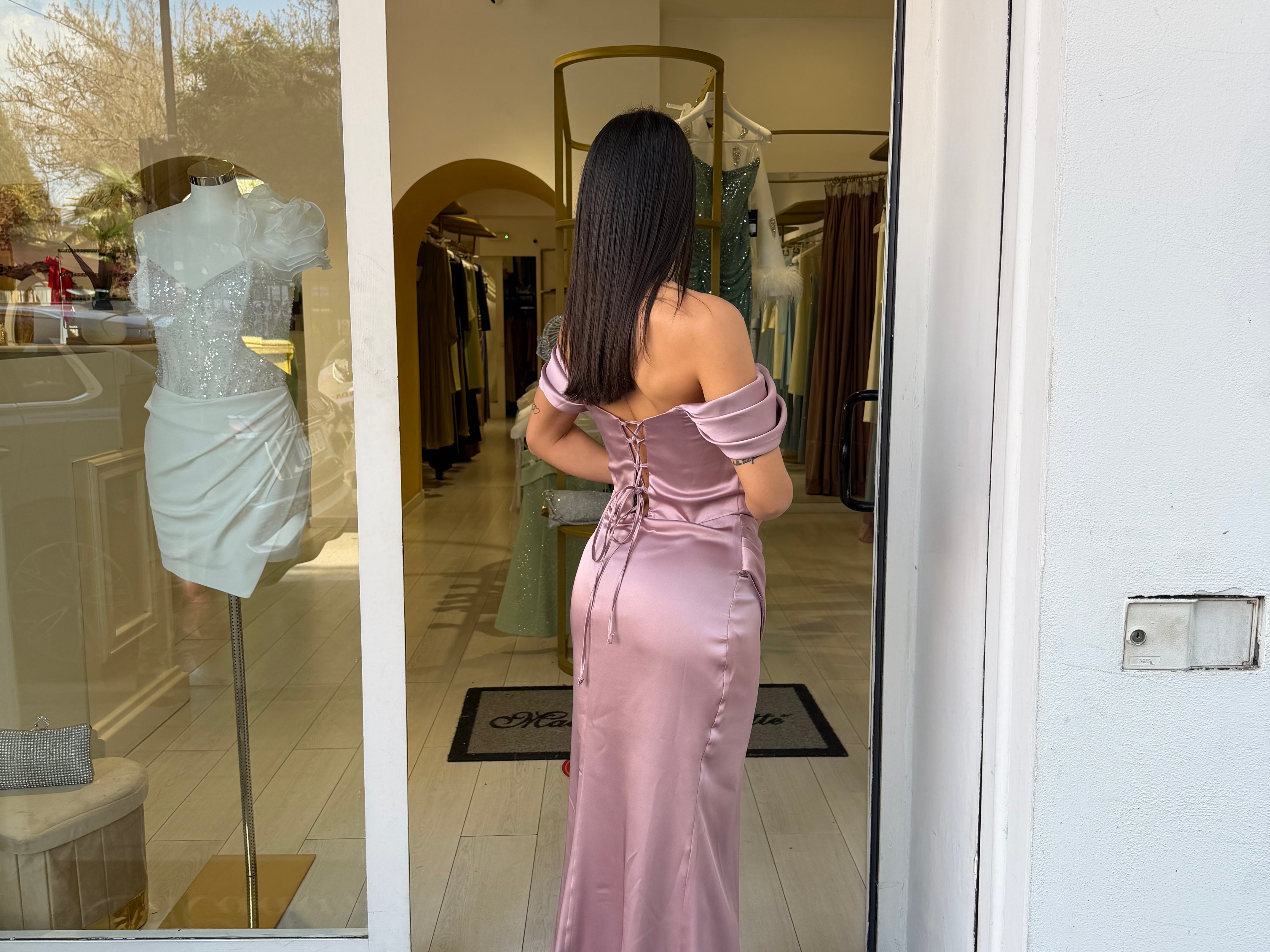 Abito lungo in satin dal fascino raffinato e femminile, caratterizzato da una linea aderente che esalta la silhouette con eleganza.