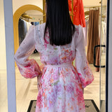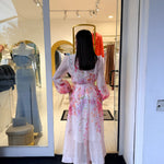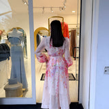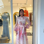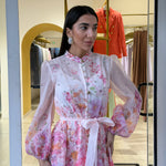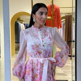 abito caratterizzato da una stampa floreale è delicata nei toni del rosa lilla e pesca sul fondo chiaro!