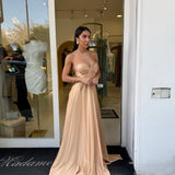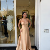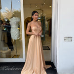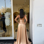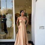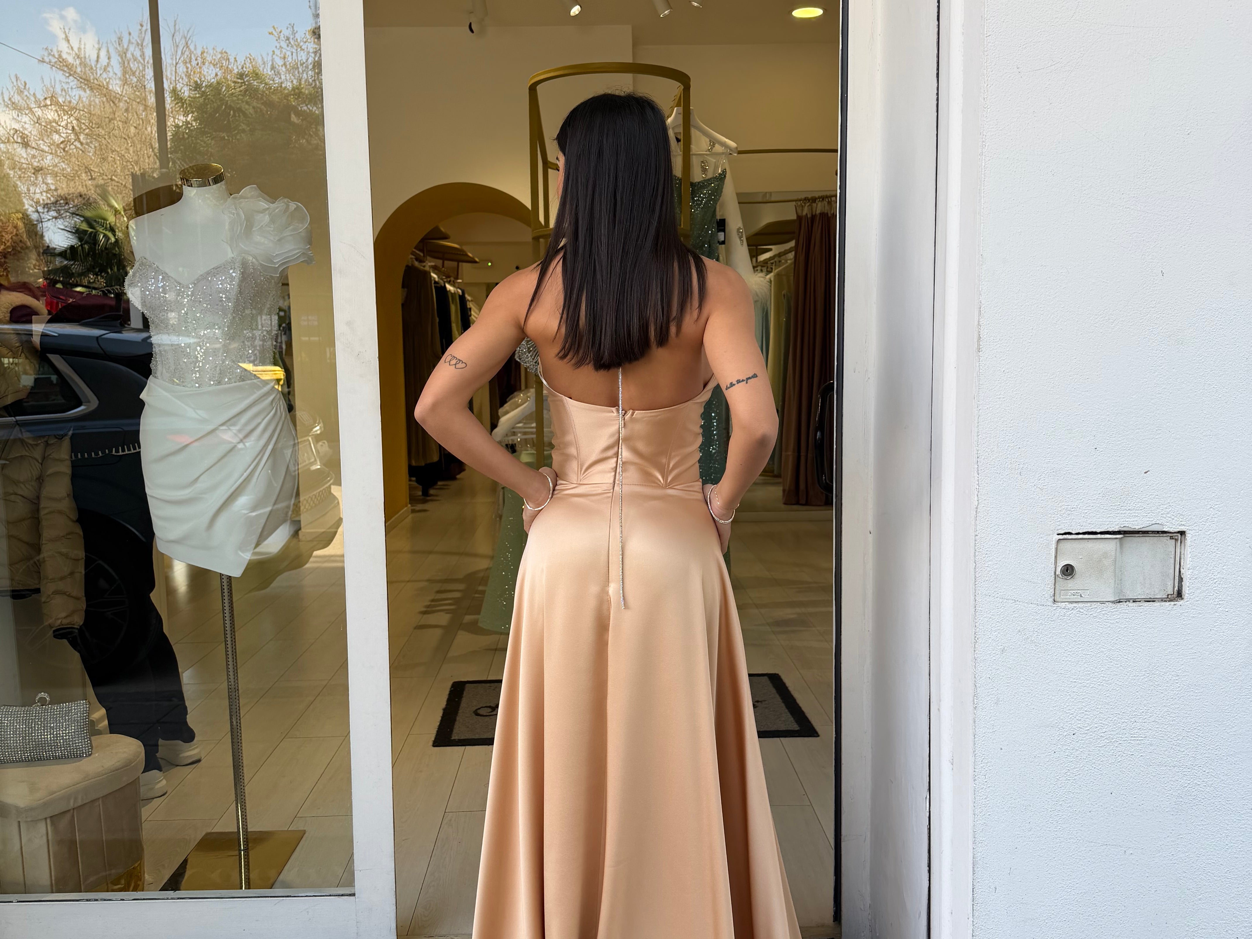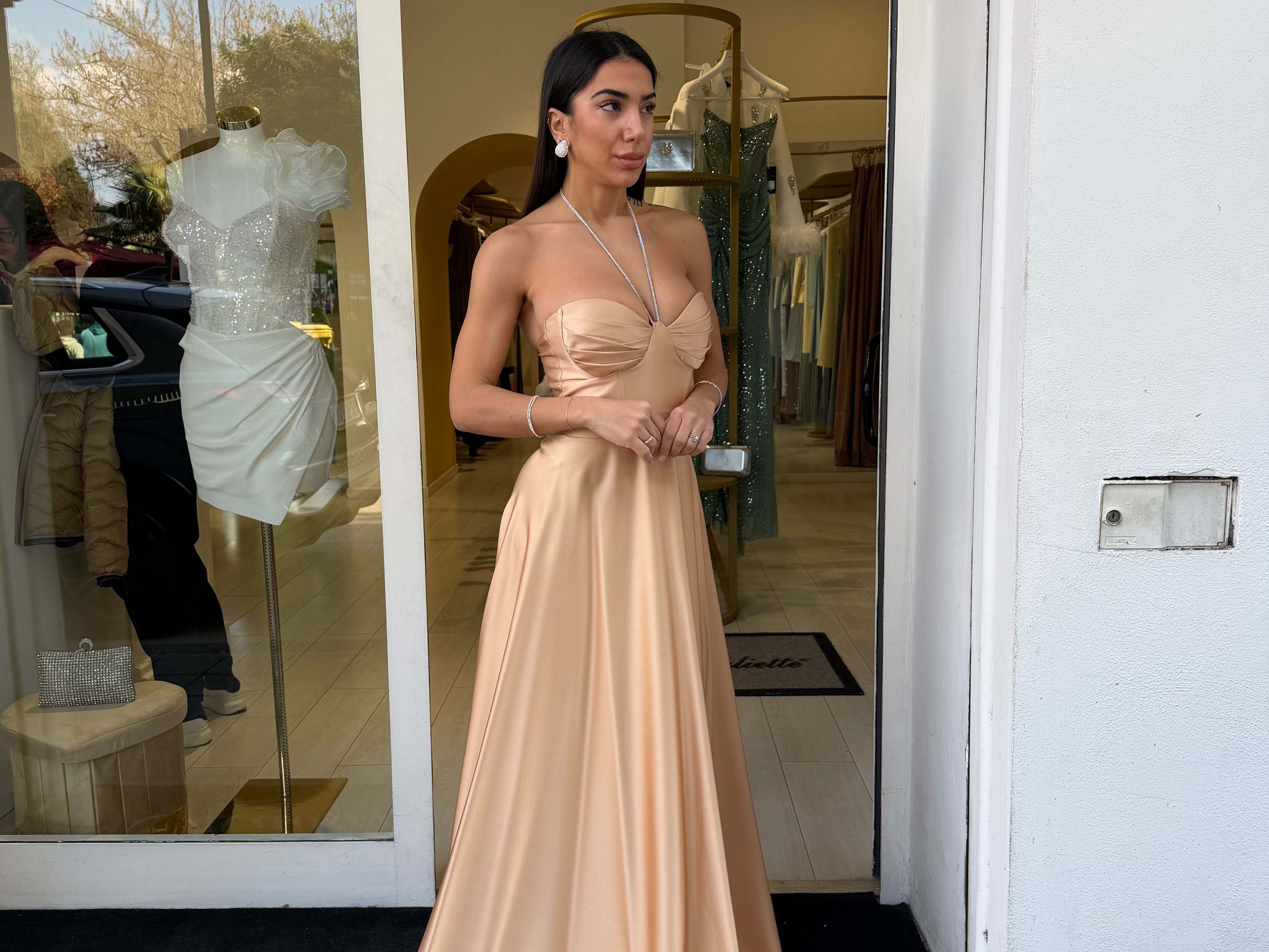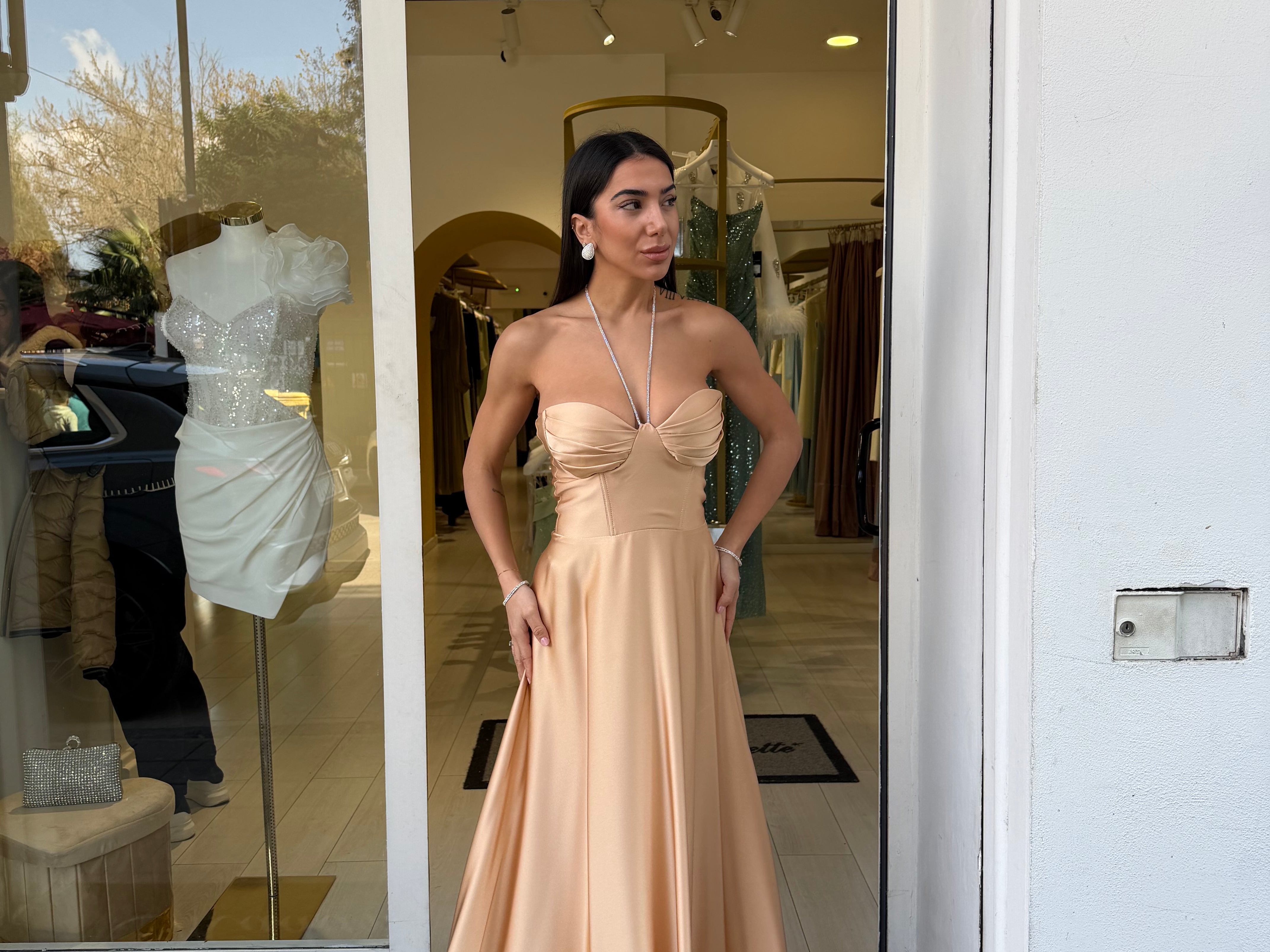 Il corpetto strutturato con scollo a cuore valorizza il décolleté, mentre il dettaglio con laccetti al collo aggiunge un tocco moderno e sofisticato. La gonna ampia e fluida crea movimento ed eleganza ad ogni passo, rendendolo perfetto per cerimonie, eventi e occasioni speciali.