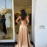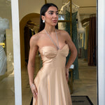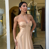 Abito lungo dal design essenziale e raffinato, realizzato in tessuto satinato effetto seta che scivola delicatamente sulla silhouette.