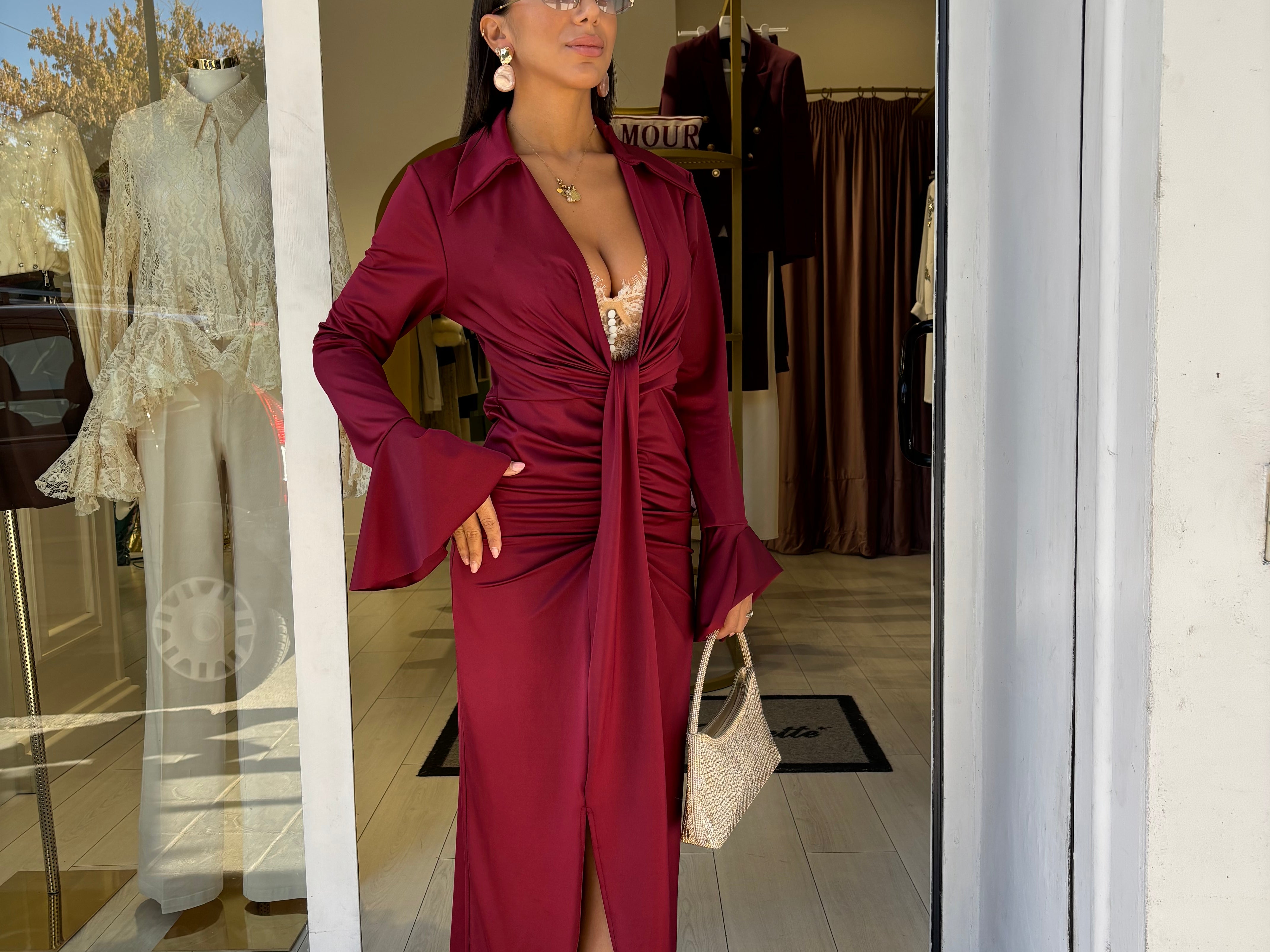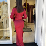 Abito longuette a tubino in tessuto elasticizzato profondo scollo a V, drappeggio sulla gonna