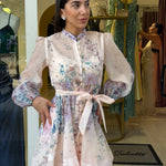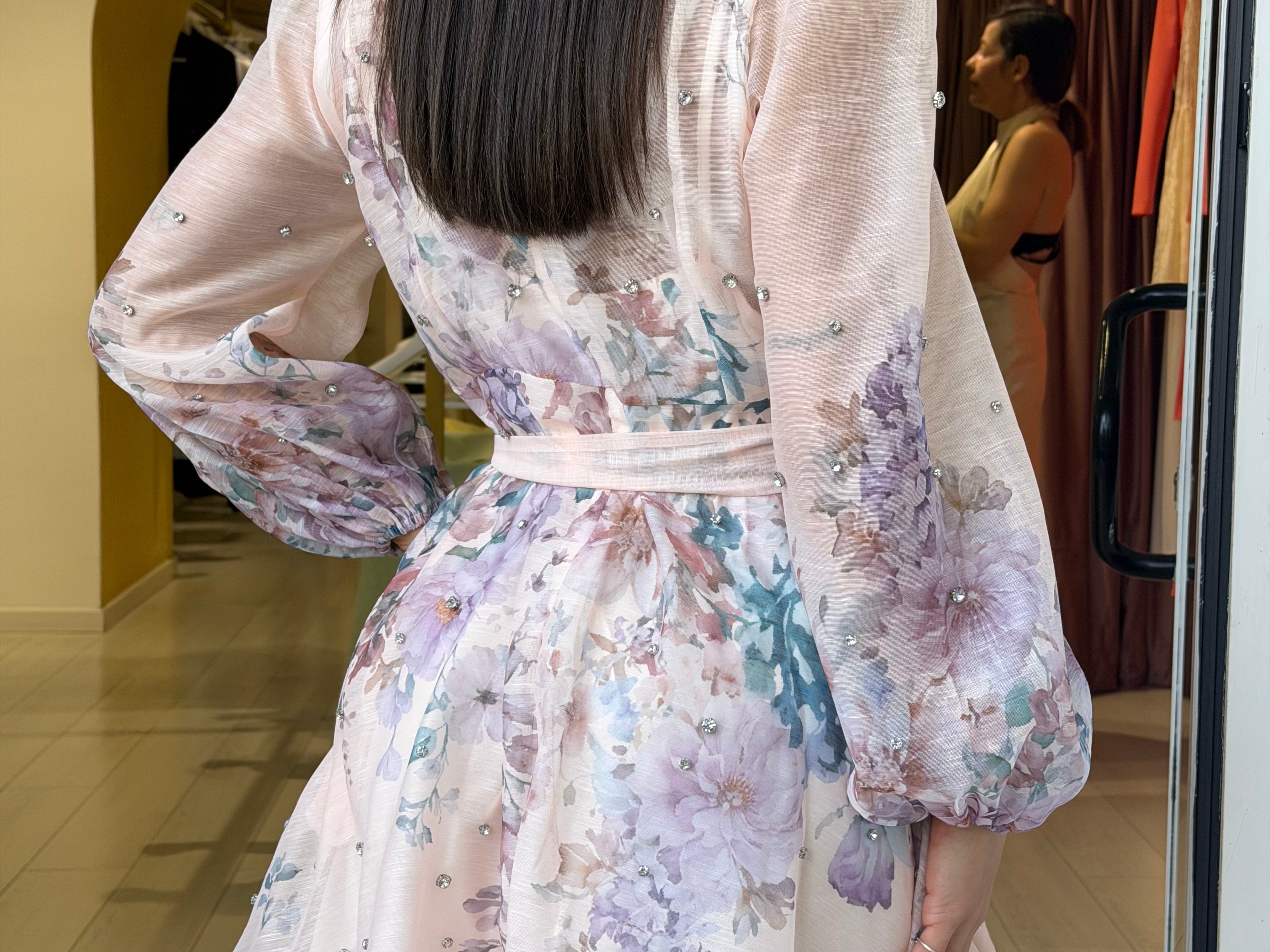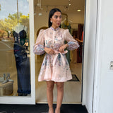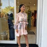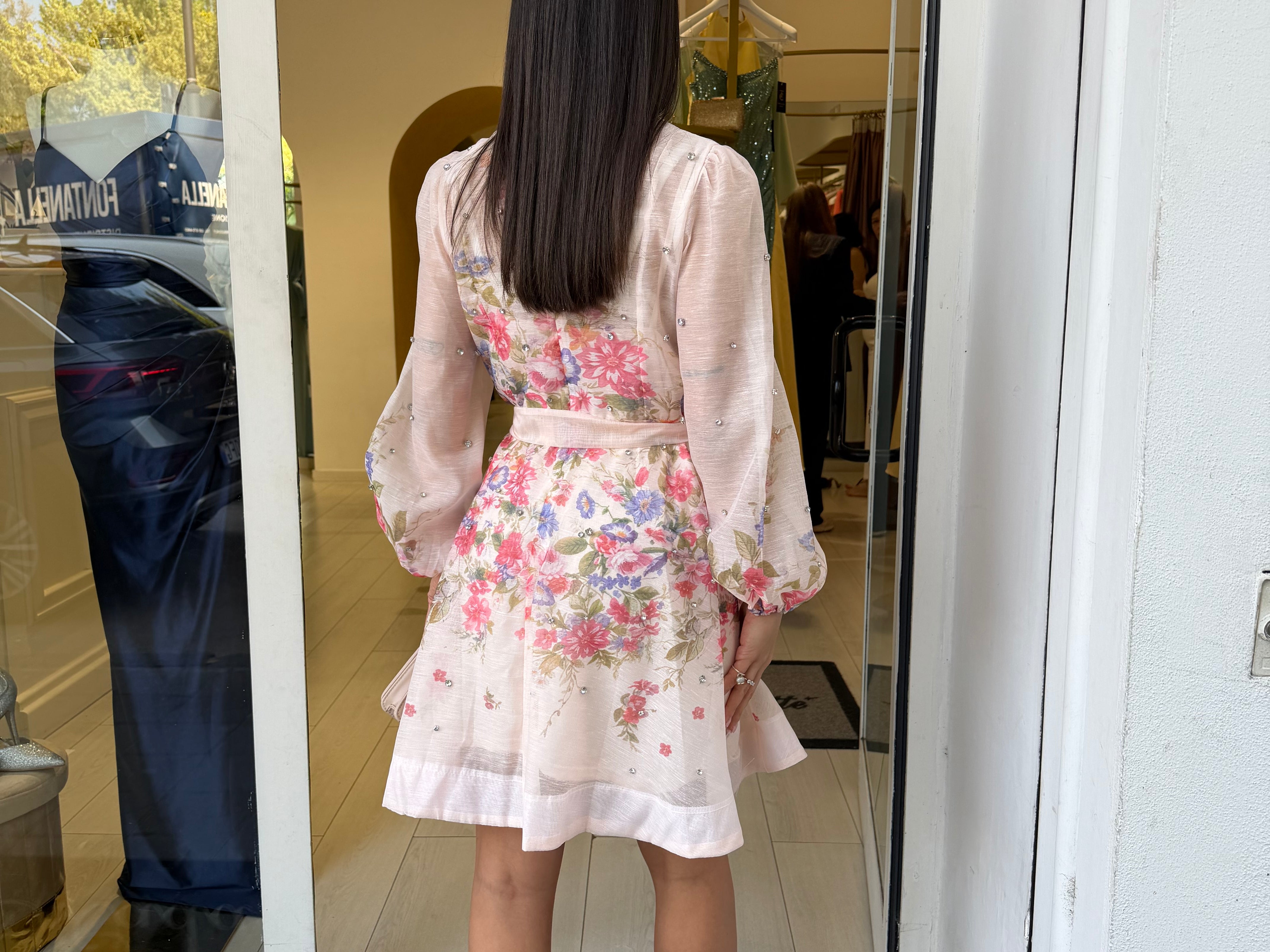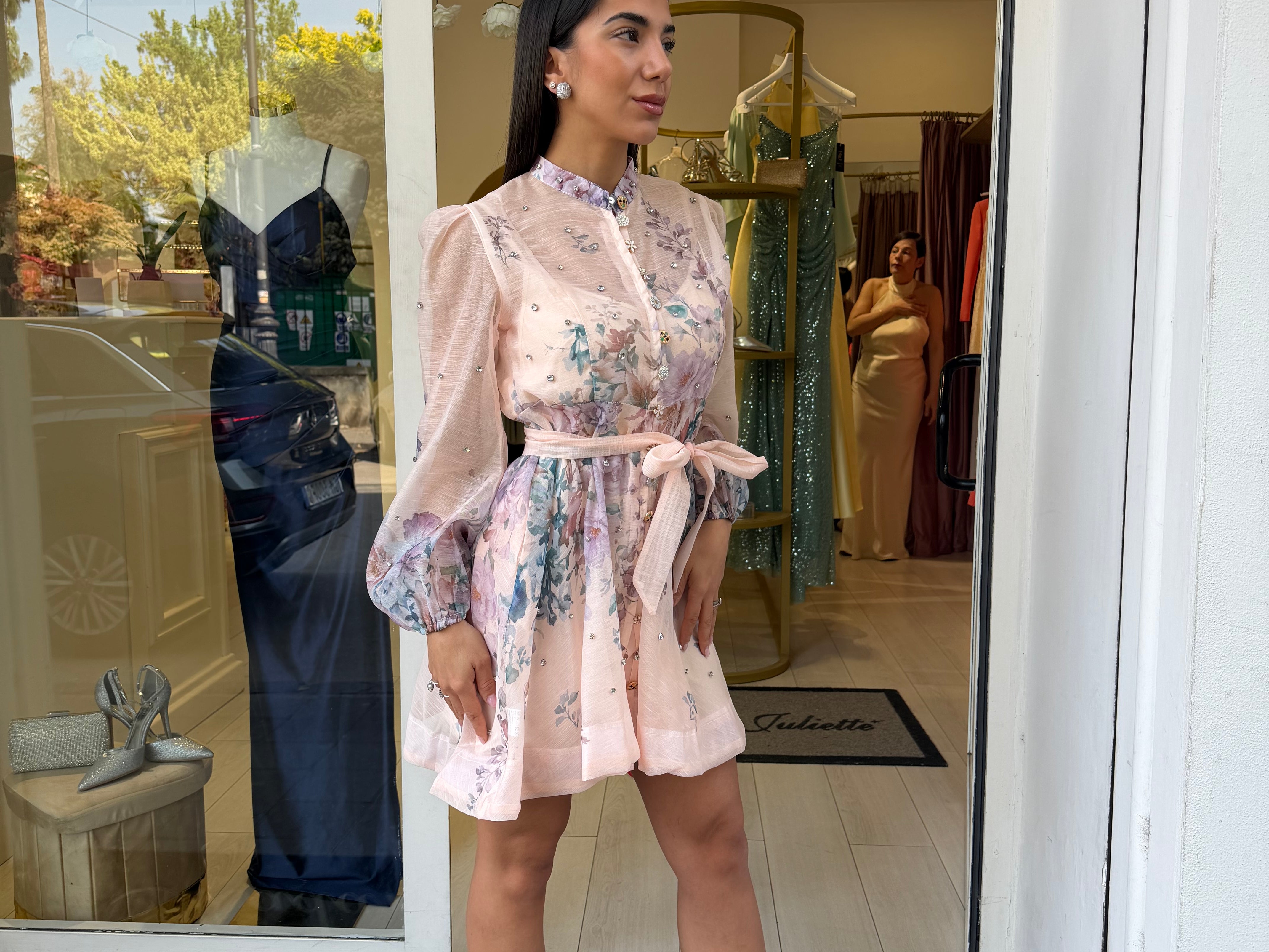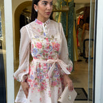 Mini dress presenta un colletto alla coreana e una chiusura frontale con bottoni in gioiello che percorrono il busto! Le maniche sono leggermente a sbuffo e il punto vita viene modellato da una fusciacca coordinata annodata!