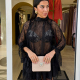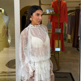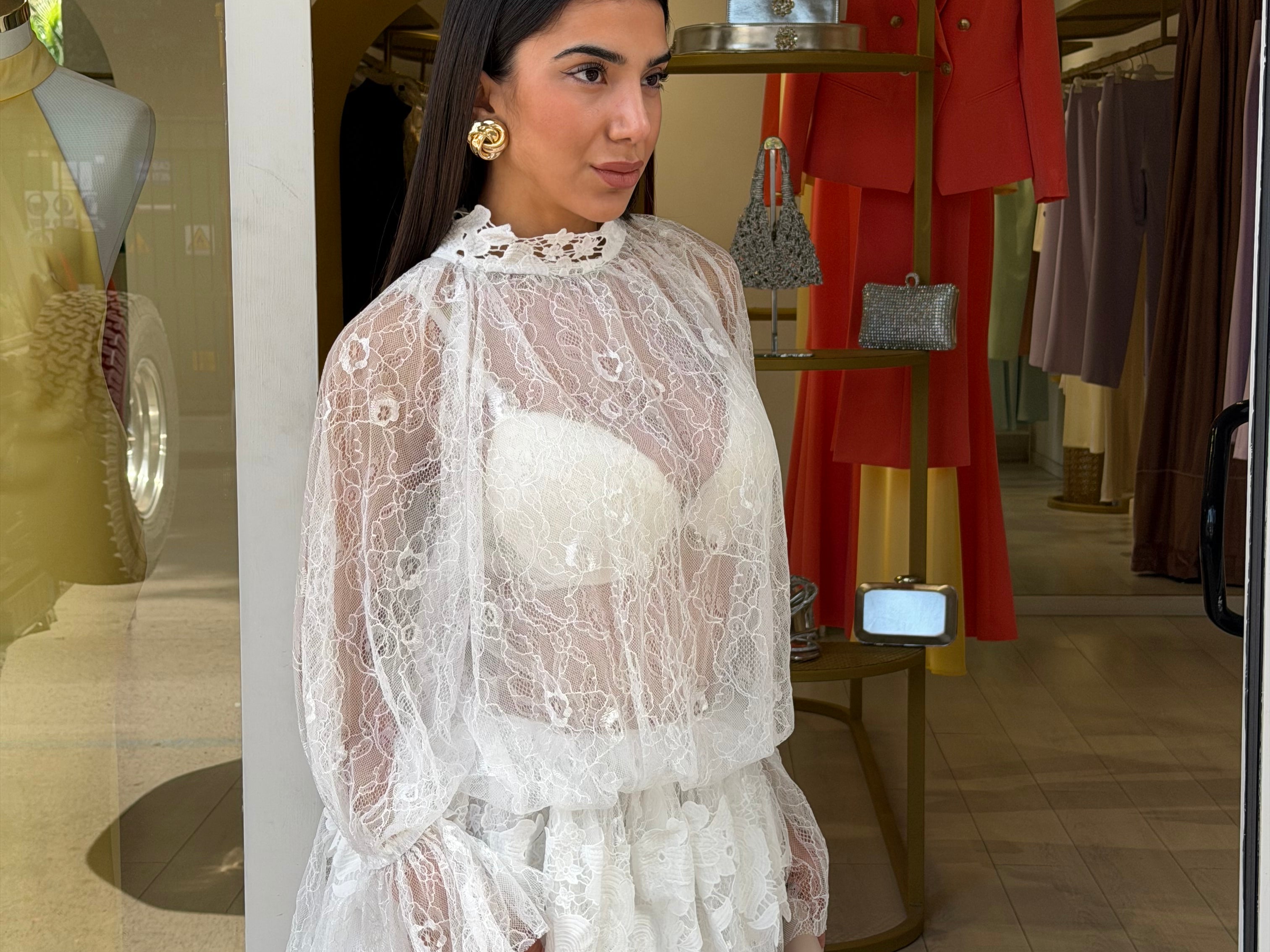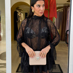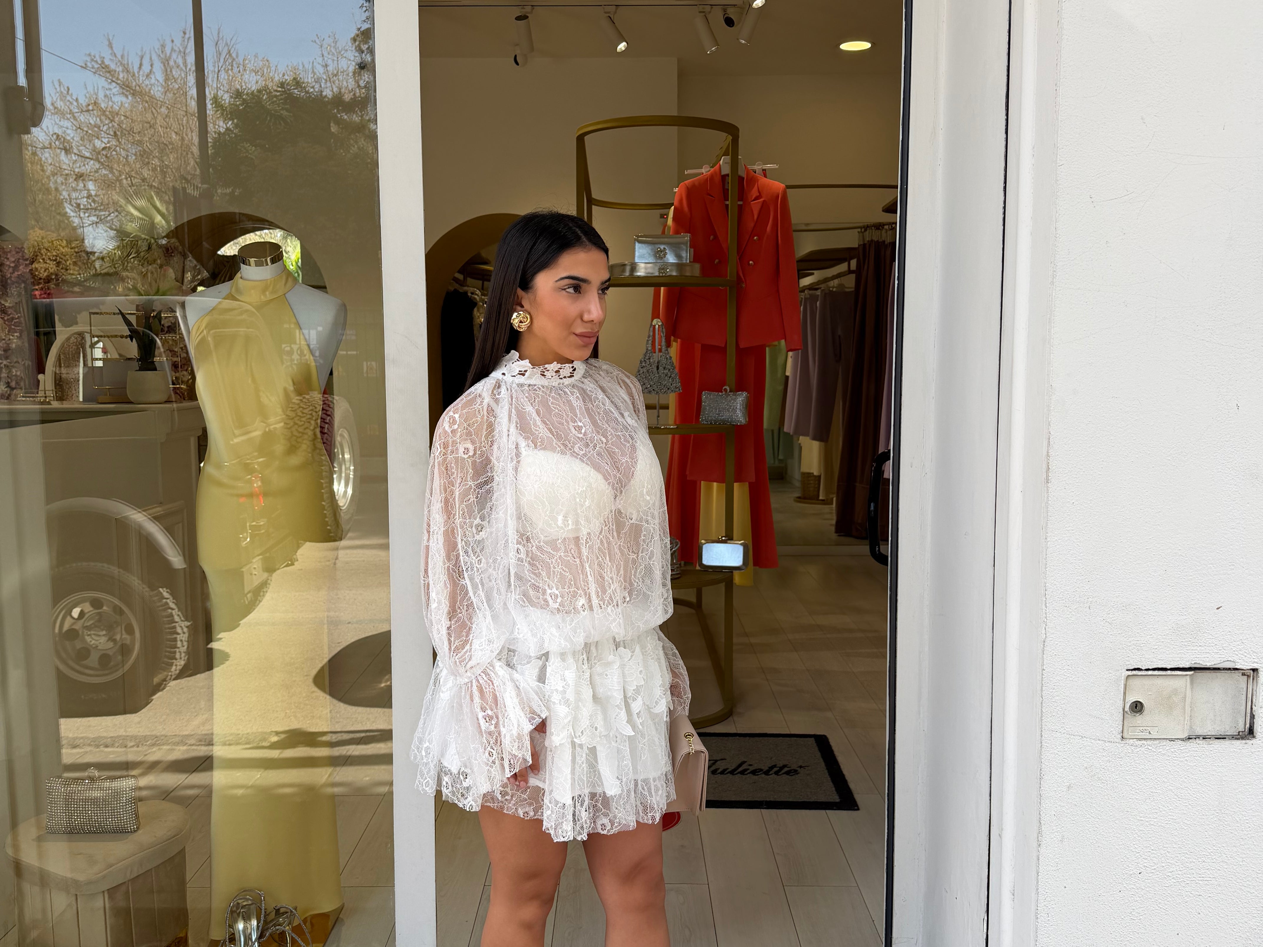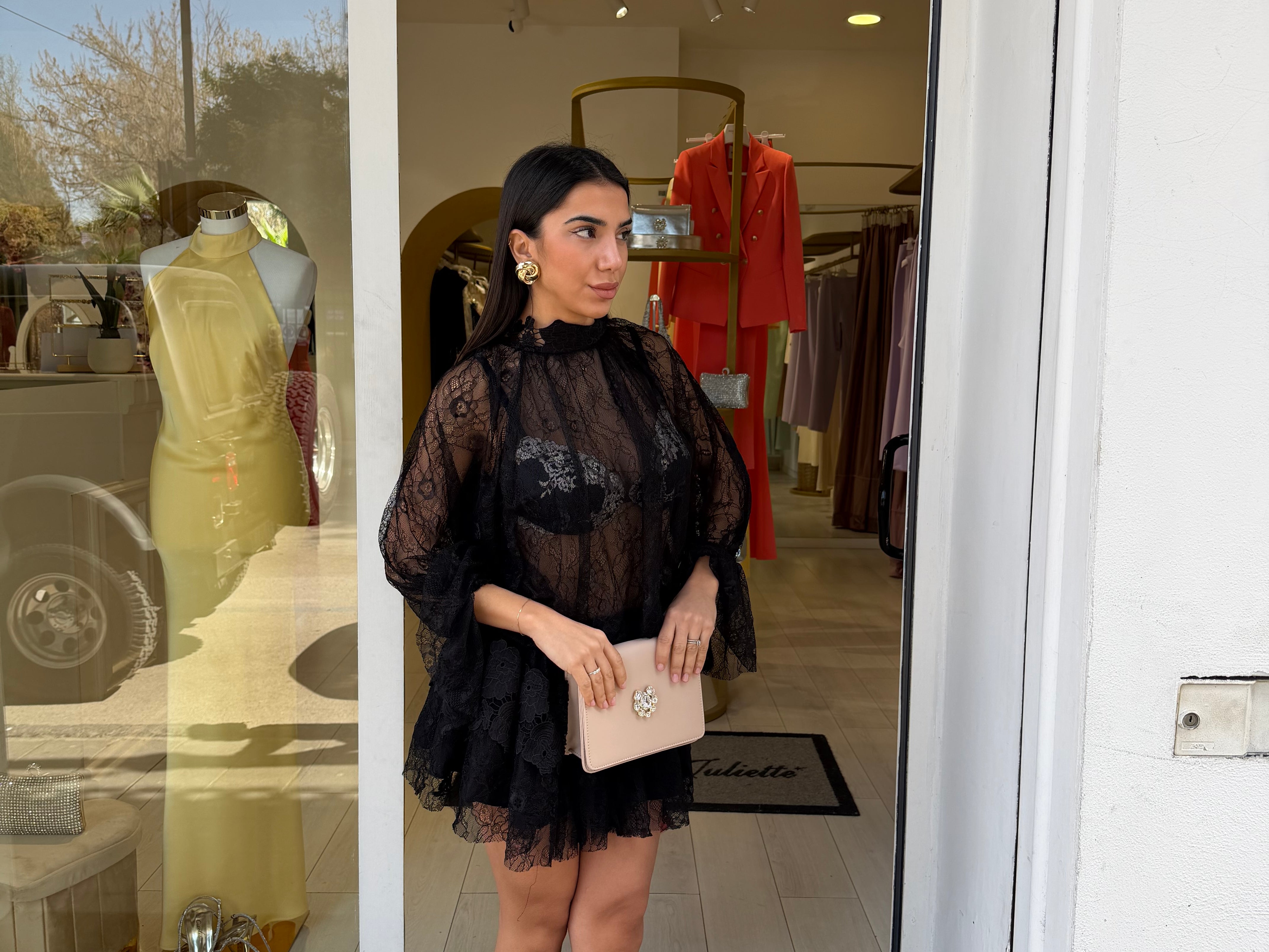 Abito corto caratterizzato da un tessuto in pizzo con dettagli trasparenti che donano eleganza e sensualità al look!