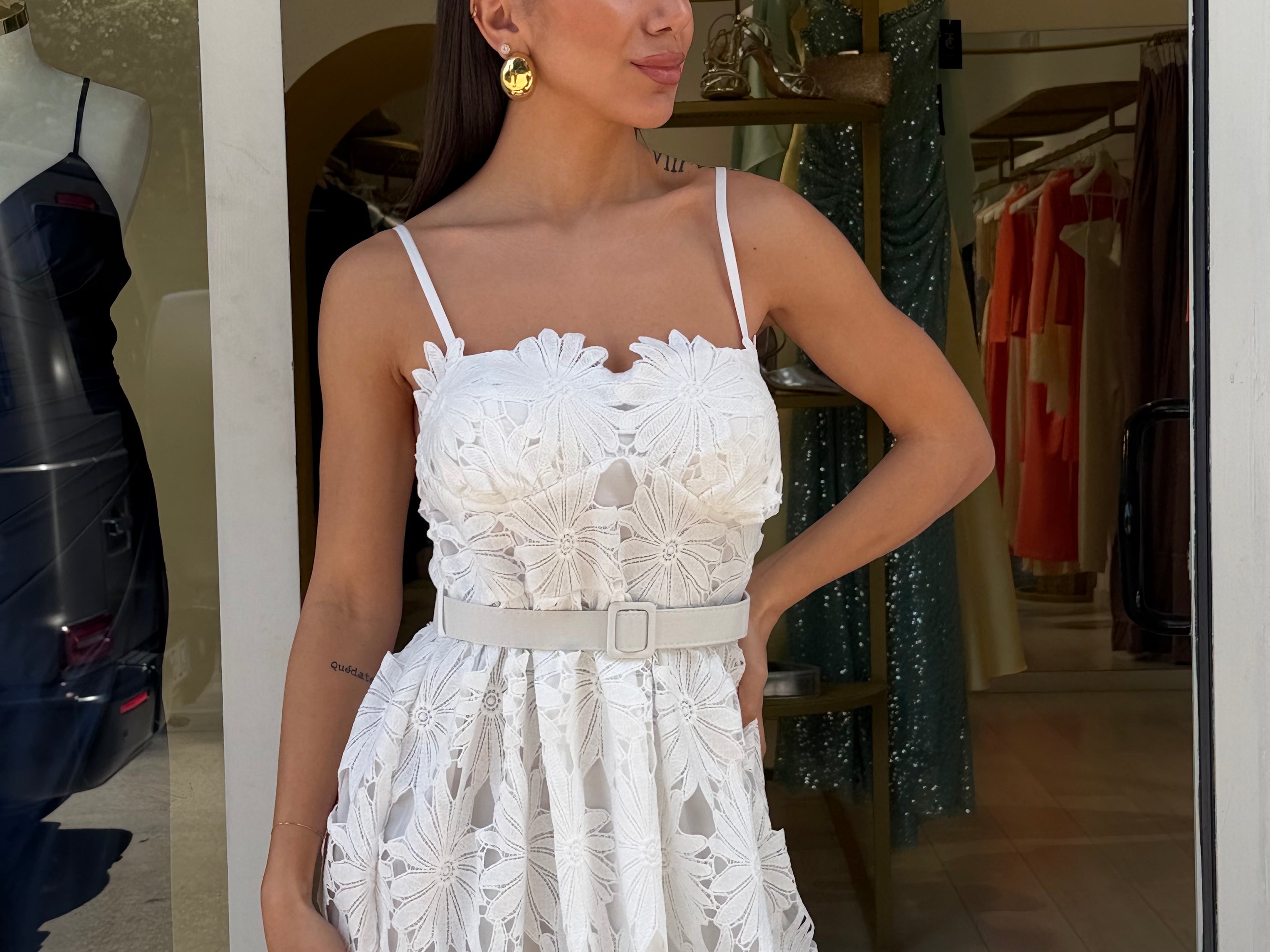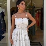 Abito bianco in pizzo, caratterizzato da un design romantico e dettagliato!