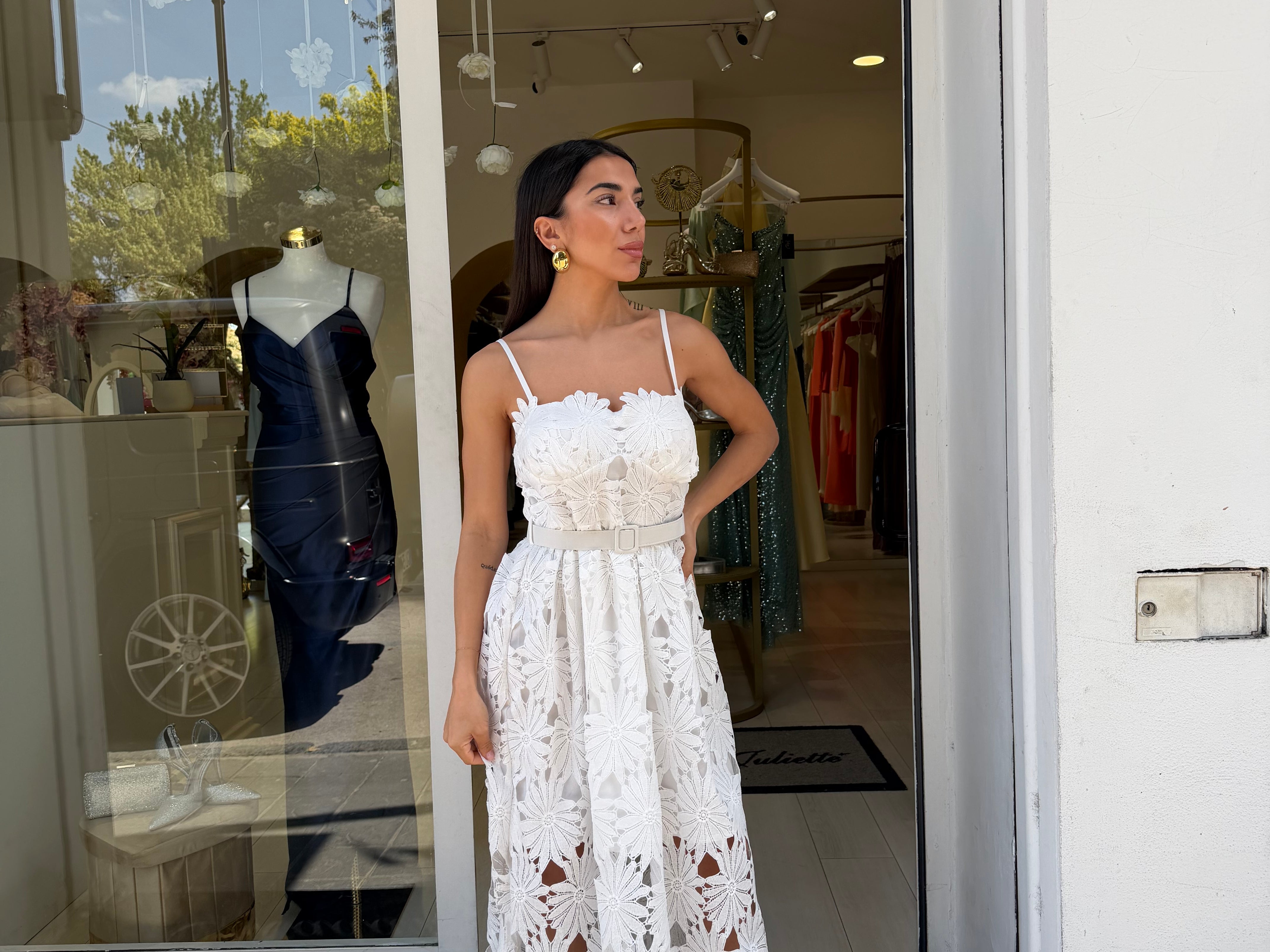 Presenta spalline sottili e uno scollo Leggermente a cuore, È completato da una cintura coordinata in vita che Definisce il punto vita e ha una gonna lunga con trasparenze creata da pizzo traforato