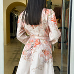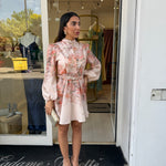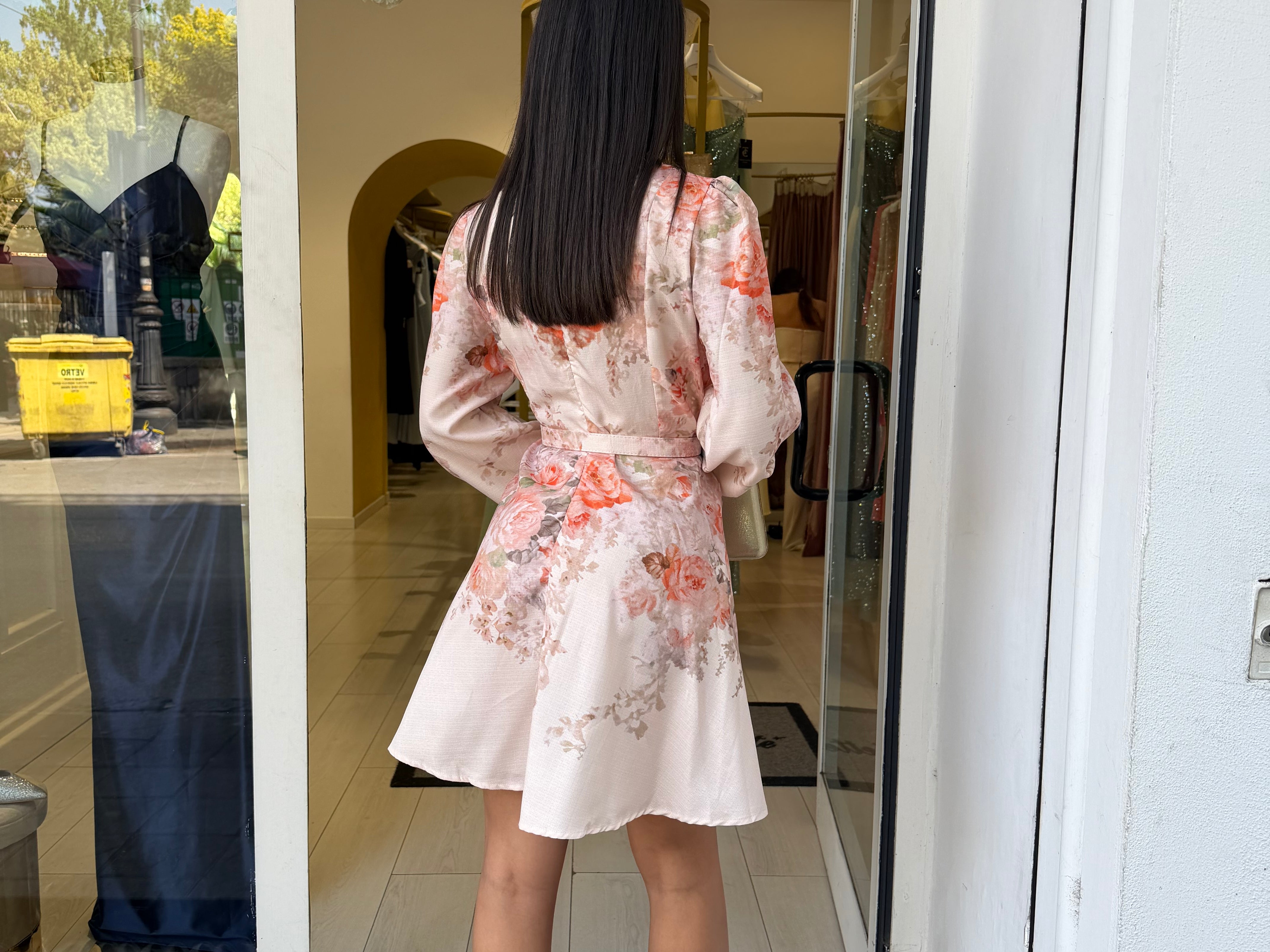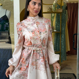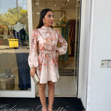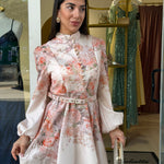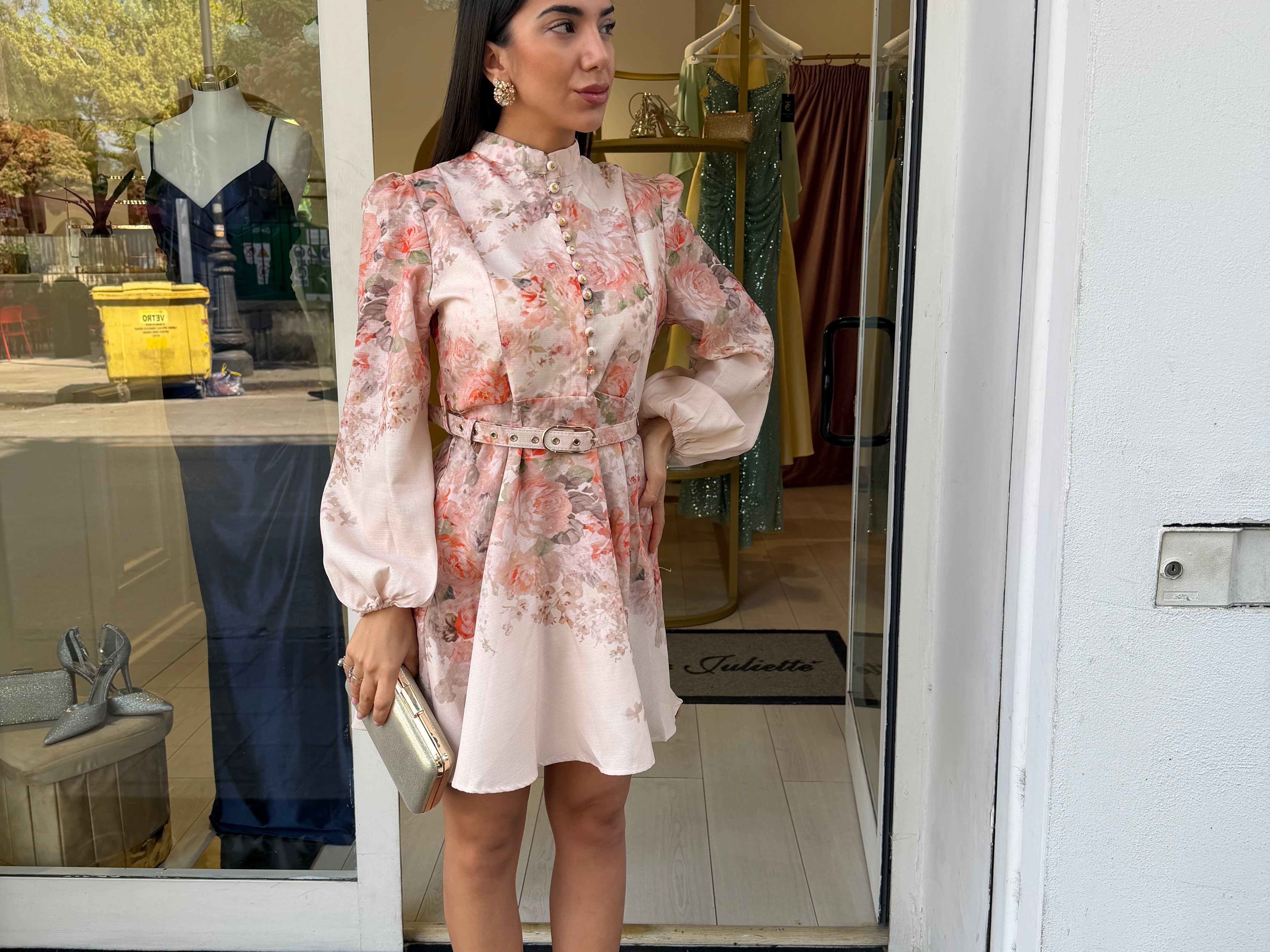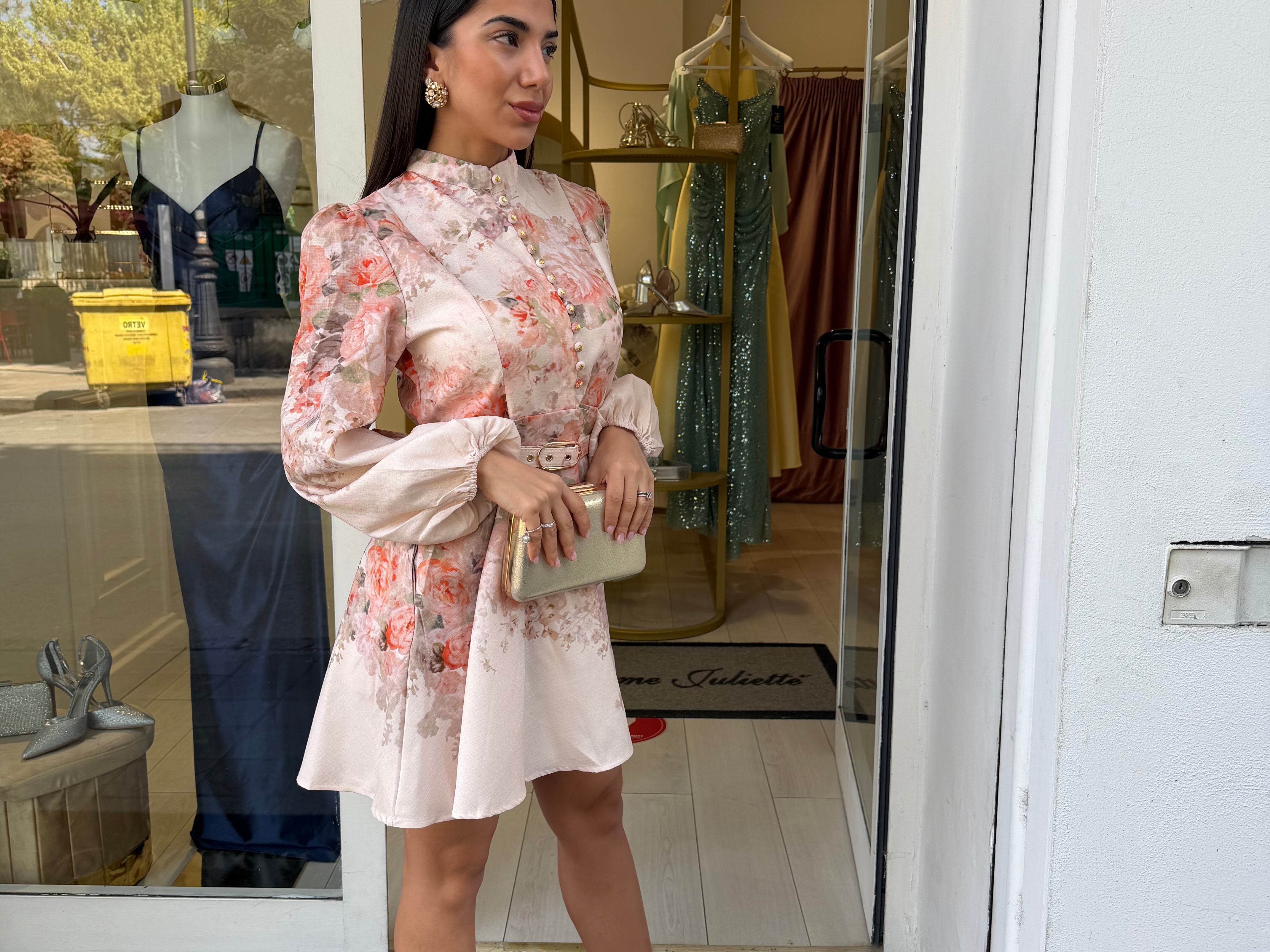 Mini abito caratterizzato da una raffinata fantasia floreale, tonalità pescate rosa e neutre su fondo chiaro. Presenta un elegante scollo alla coreana con chiusura frontale, arricchita da piccoli bottoni! È rifinito Da una cintura regolabile coordinata!