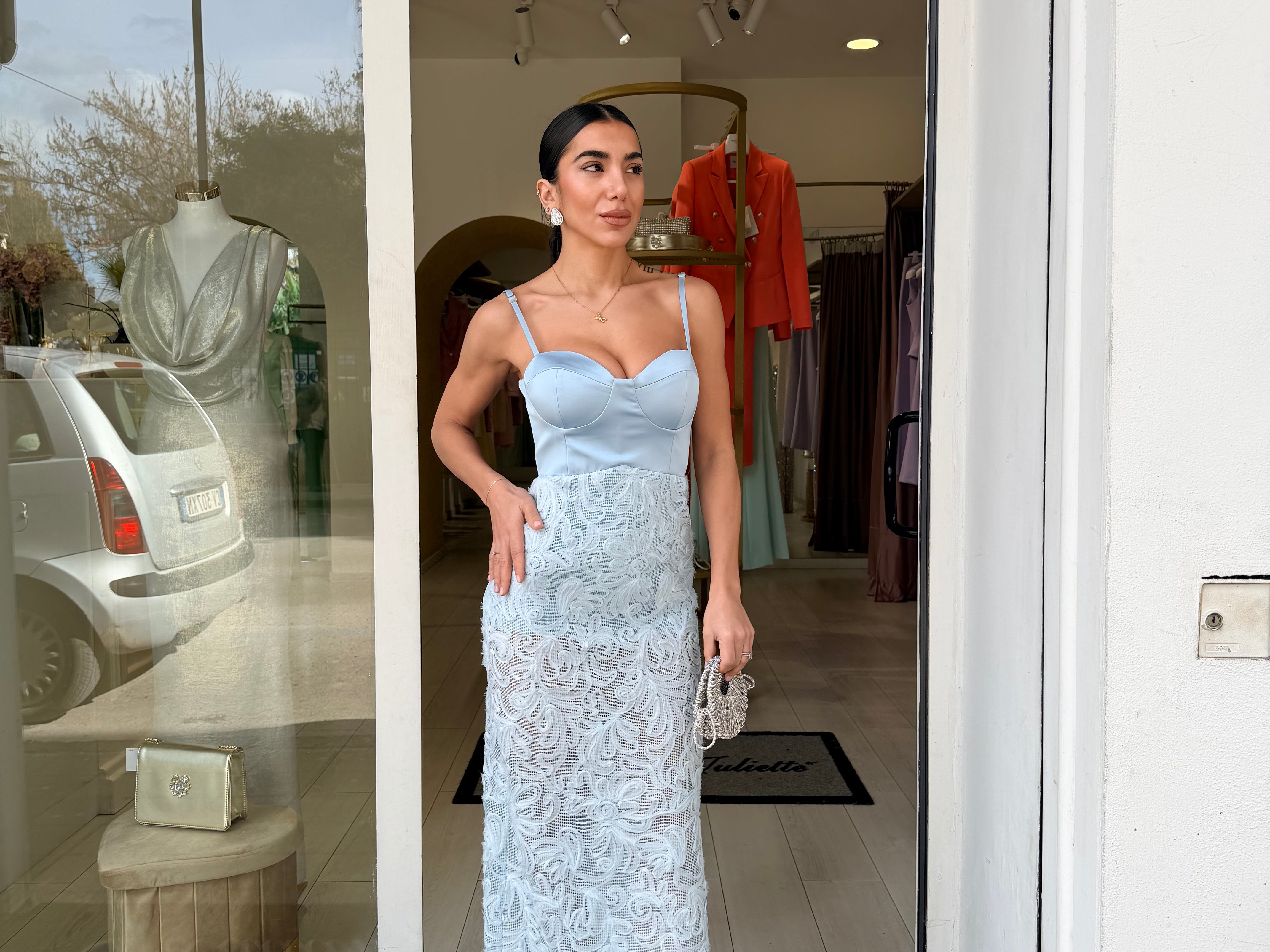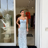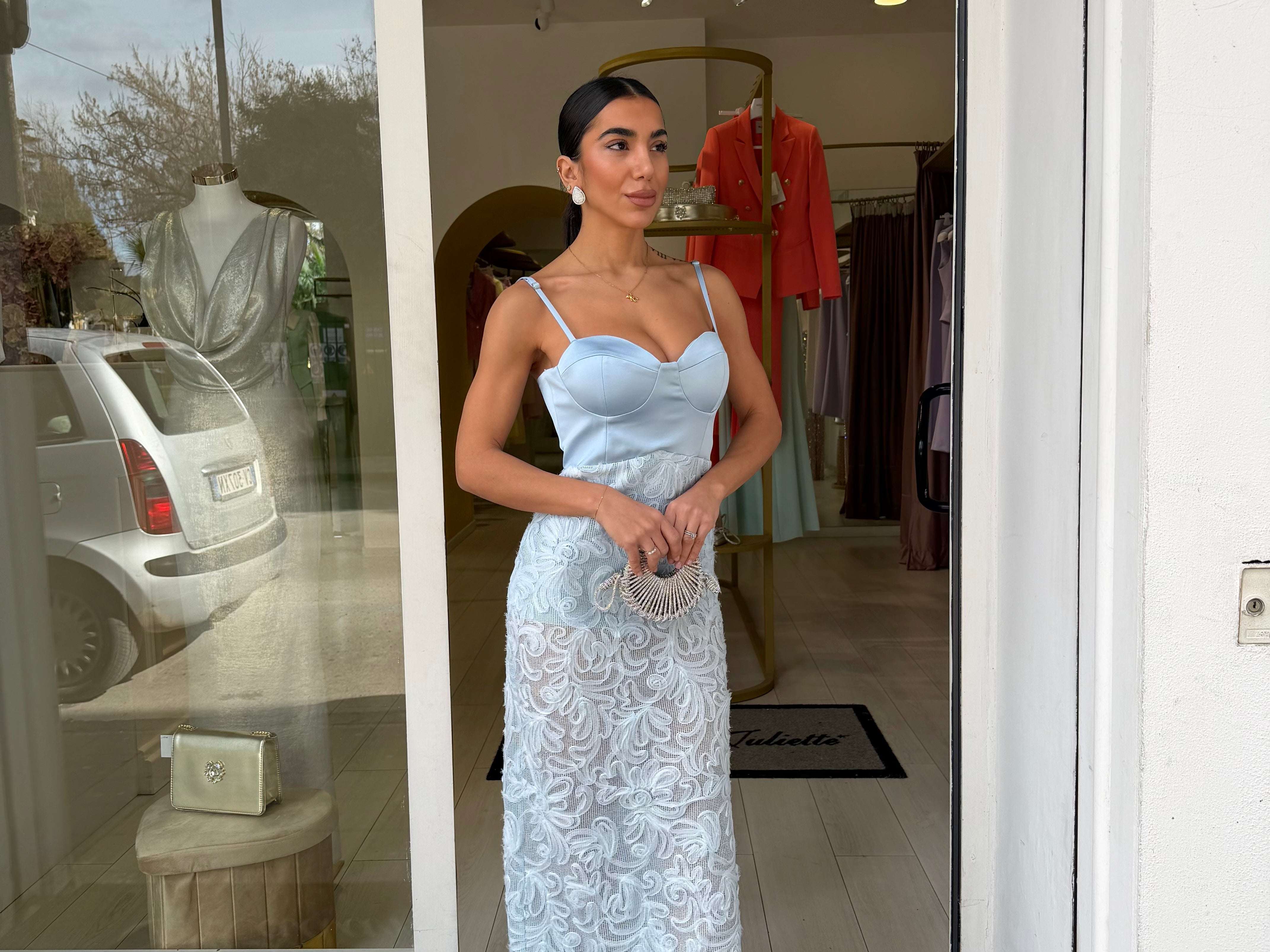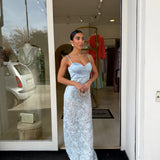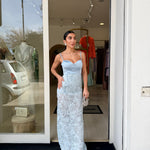 abito lungo a sirena che valorizza la figura Ed è arricchito da spalline sottili e un corpetto strutturato con scollo a cuore