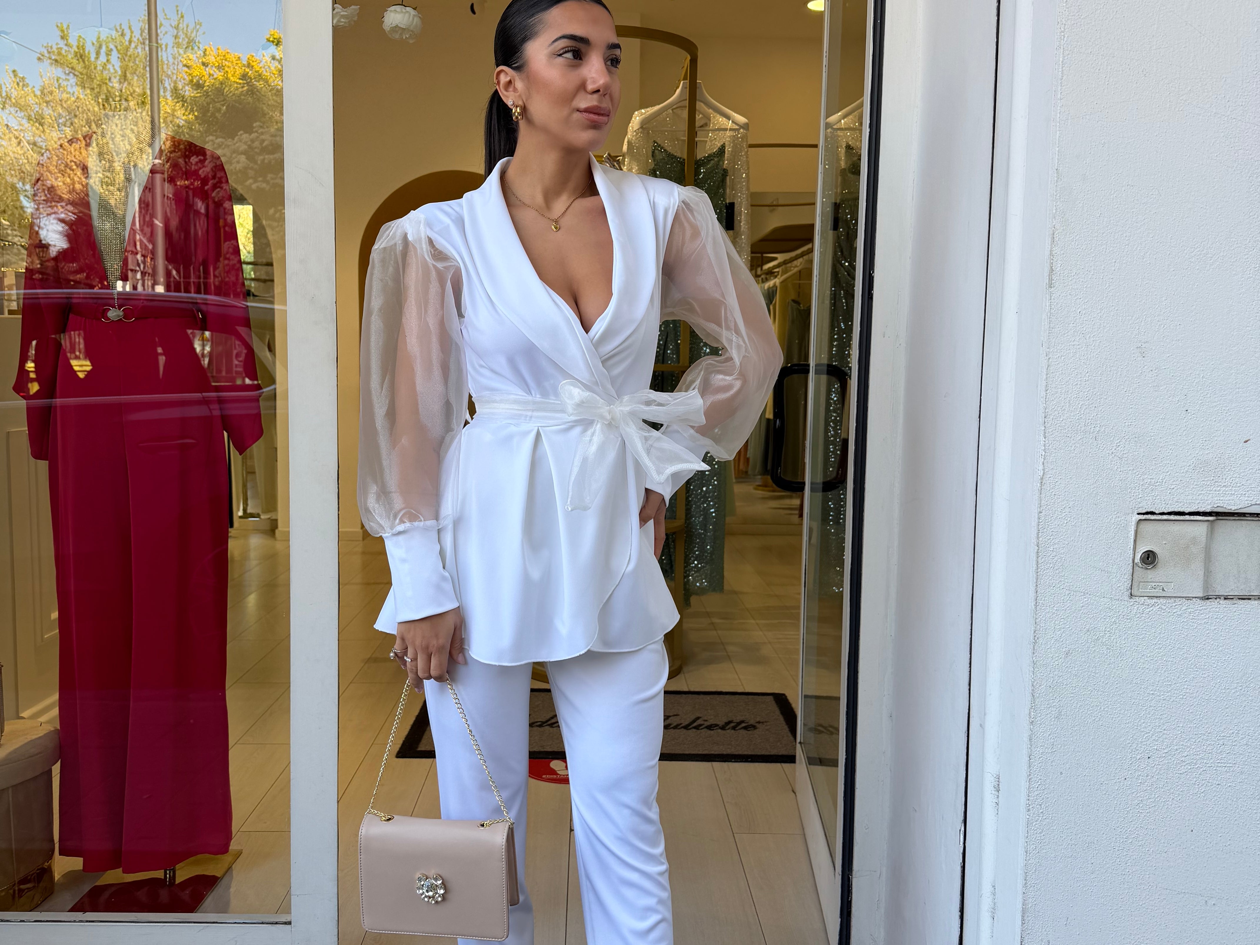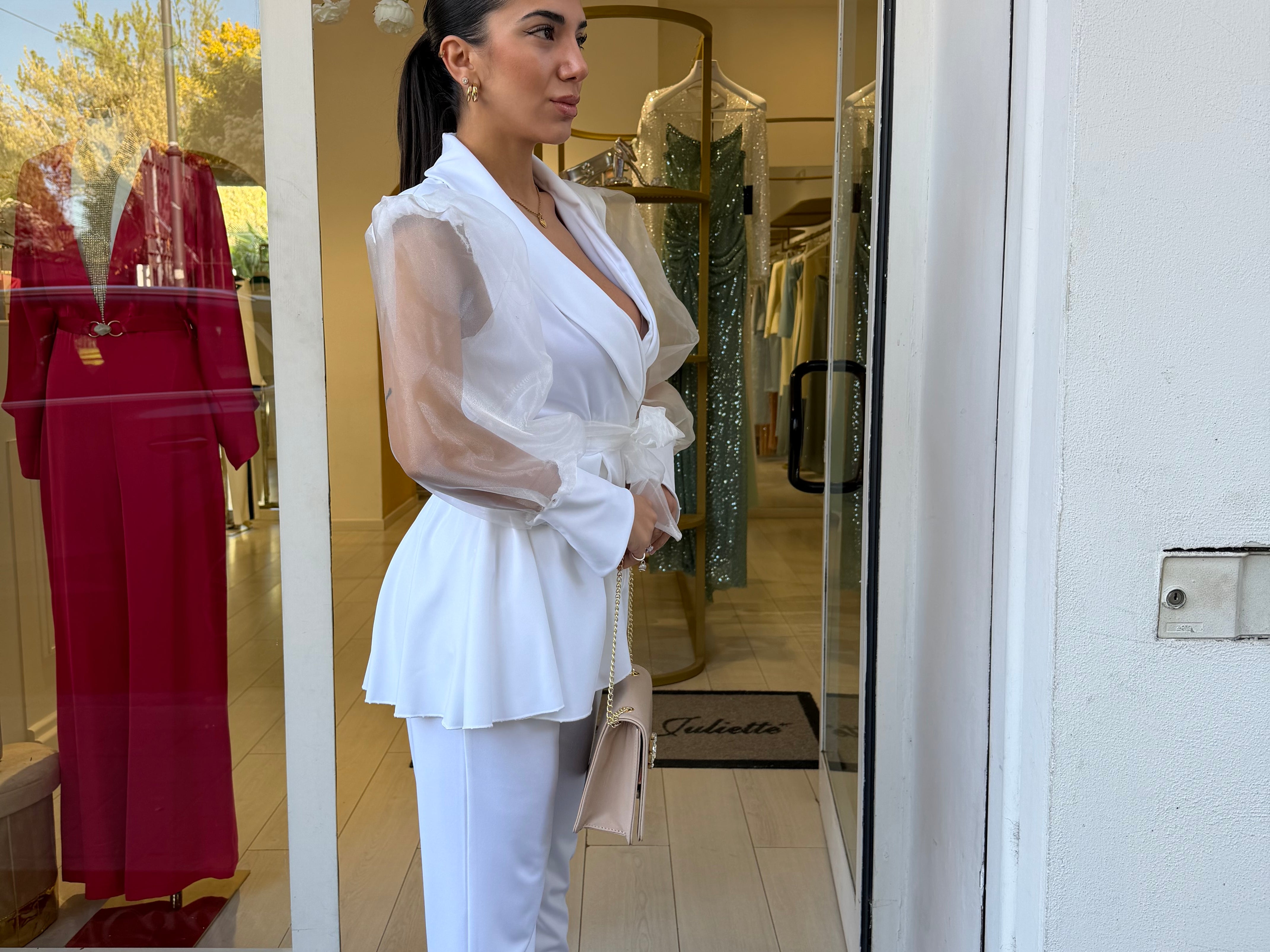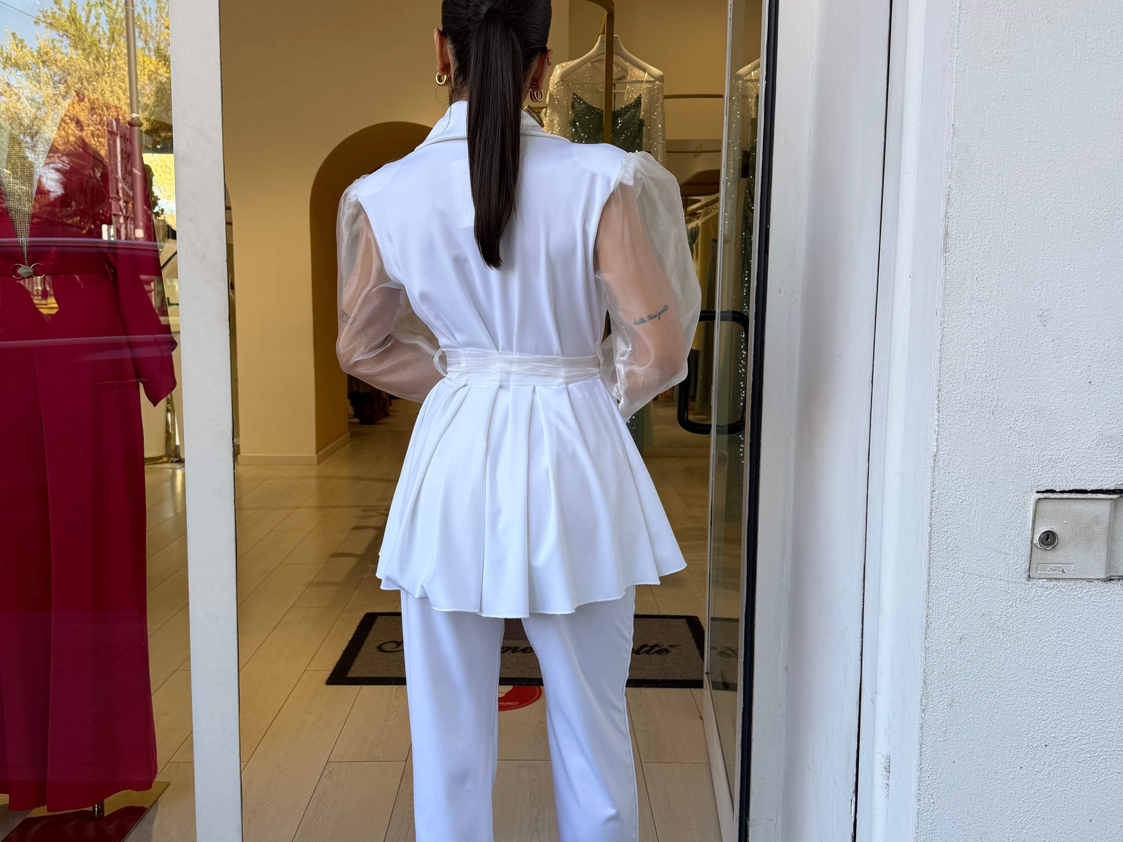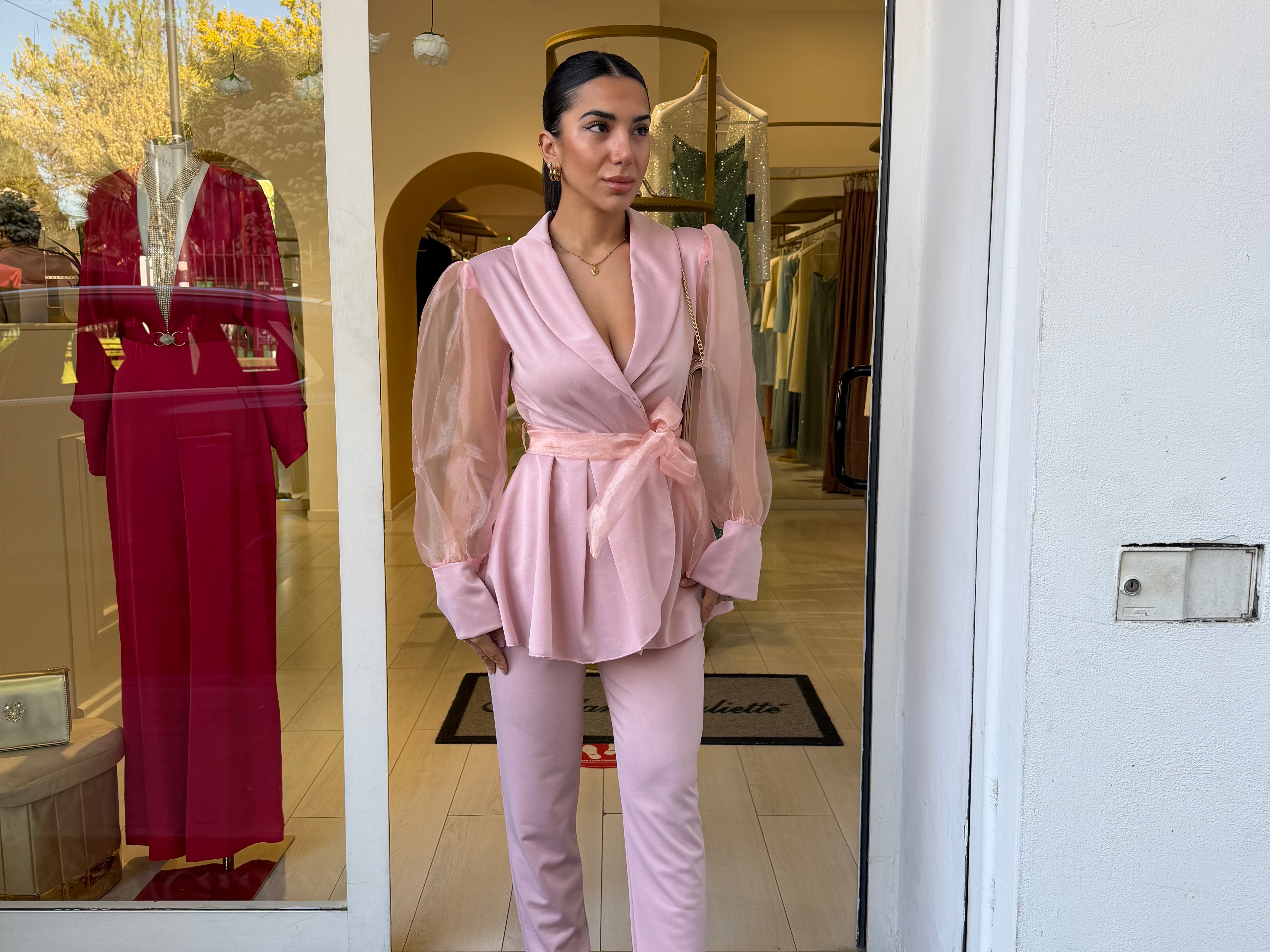 Completo raffinato dal fascino romantico e moderno, caratterizzato da una giacca con taglio avvolgente e maniche leggere effetto velato che donano movimento e femminilità. La vita è valorizzata da una cintura che esalta la silhouette, mentre il pantalone completa il look con un’eleganza pulita e sofisticata. Perfetto per occasioni speciali, eventi o per distinguersi con classe.