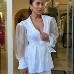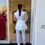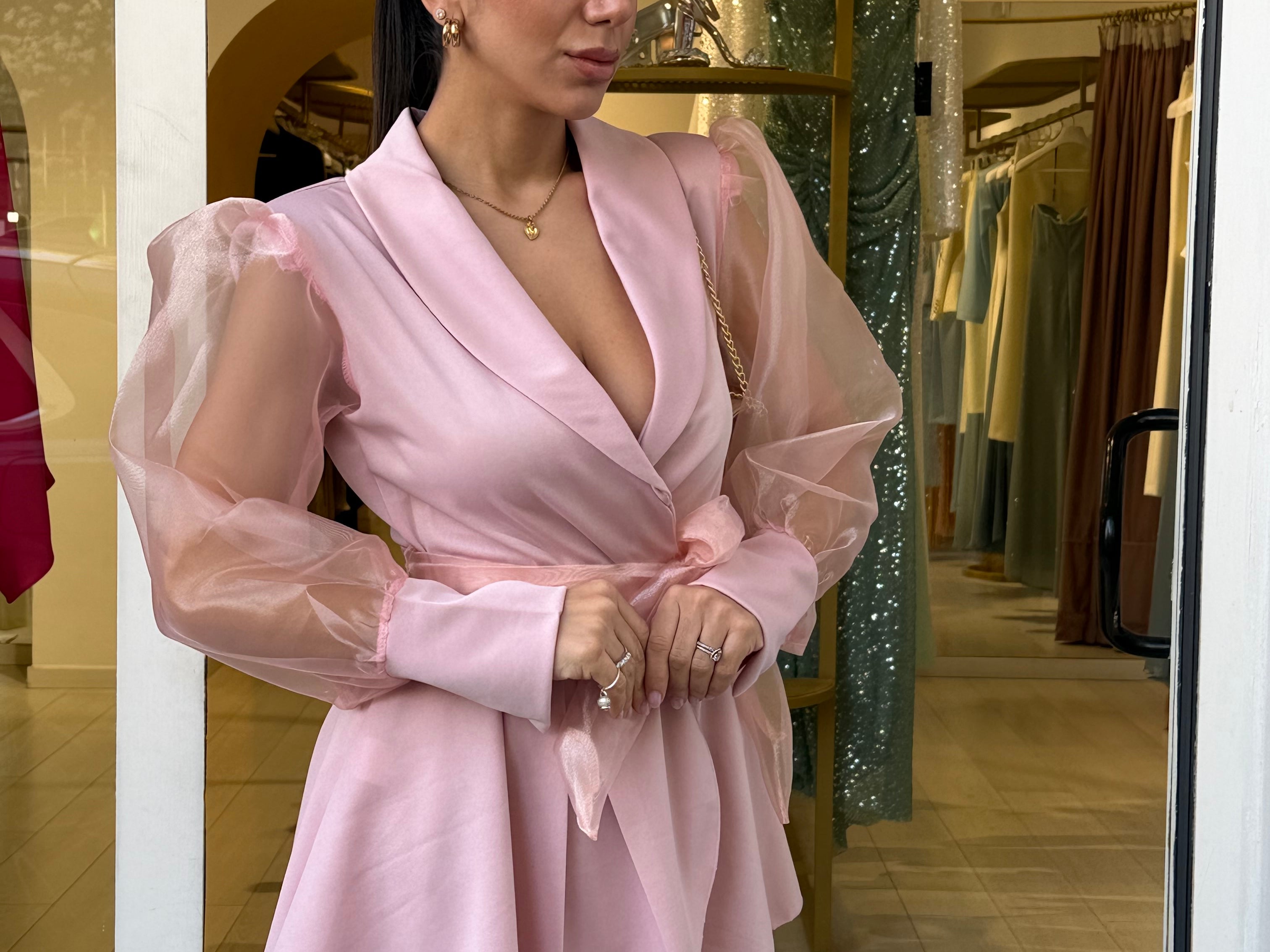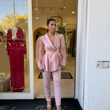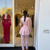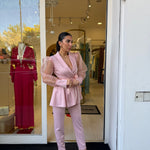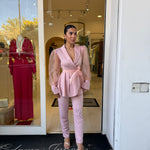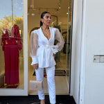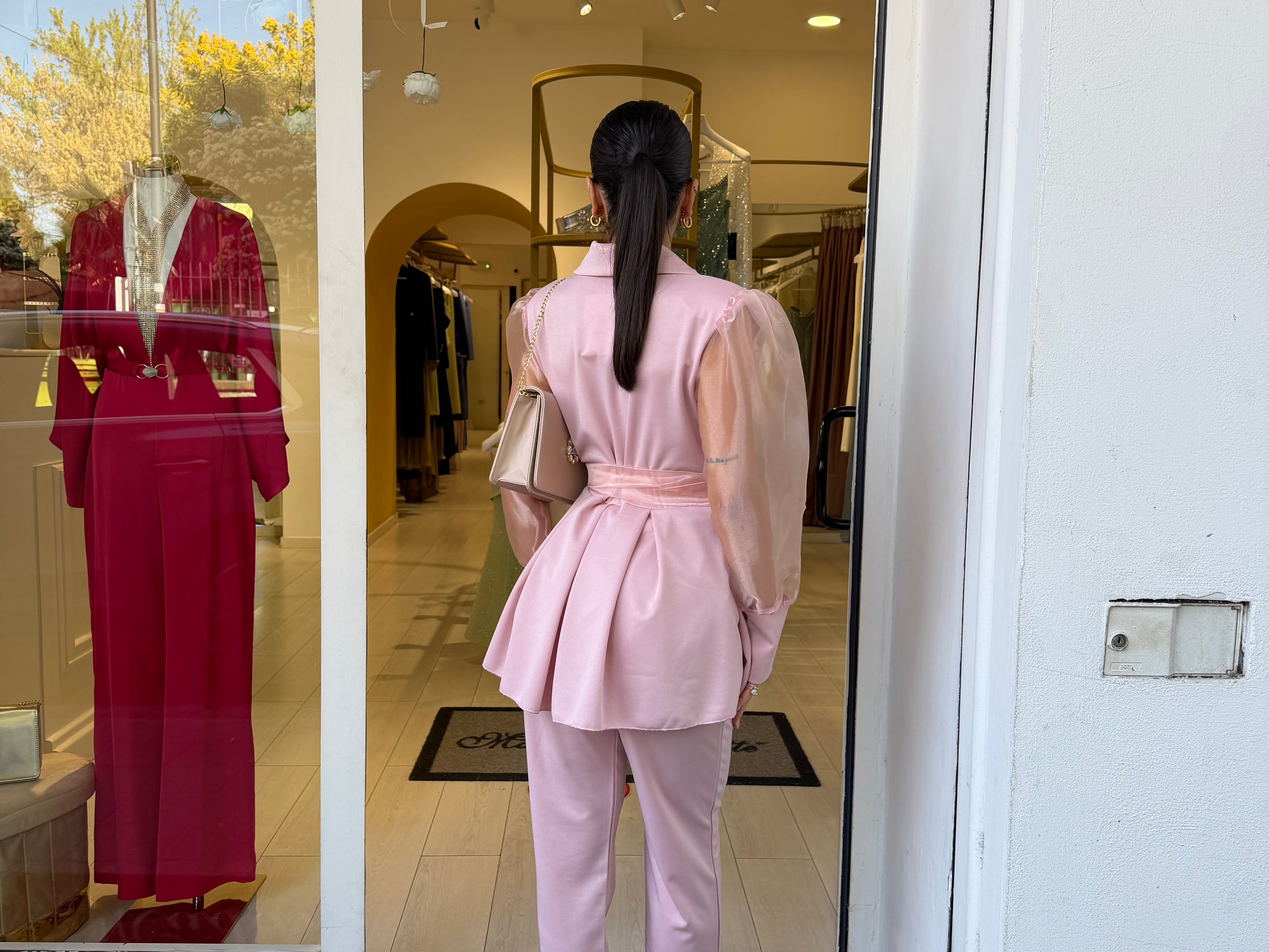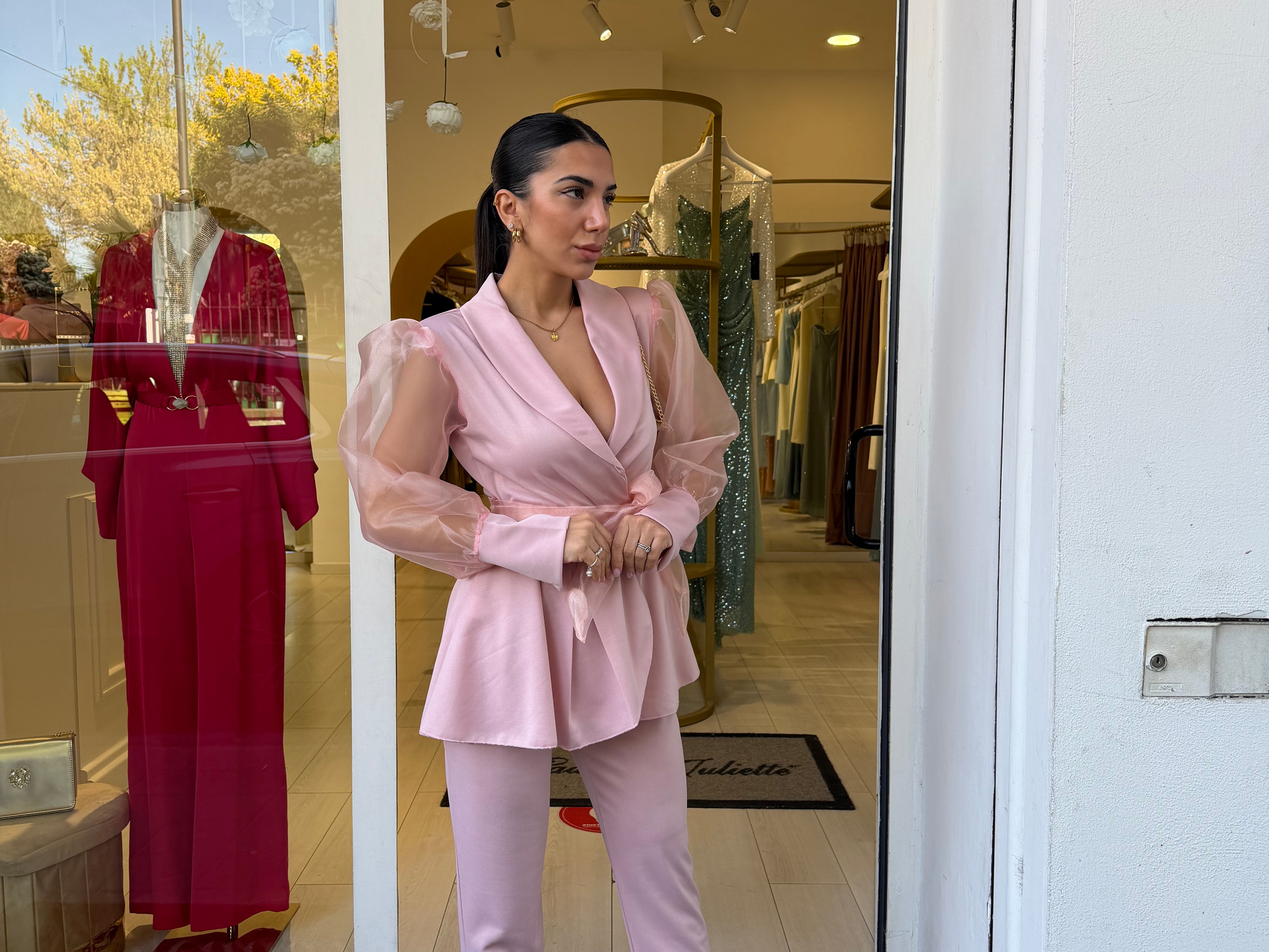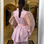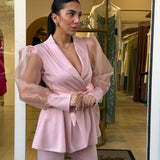 Completo raffinato dal fascino romantico e moderno, caratterizzato da una giacca con taglio avvolgente e maniche leggere effetto velato che donano movimento e femminilità. La vita è valorizzata da una cintura che esalta la silhouette, mentre il pantalone completa il look con un’eleganza pulita e sofisticata. Perfetto per occasioni speciali, eventi o per distinguersi con classe.
