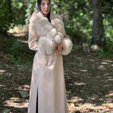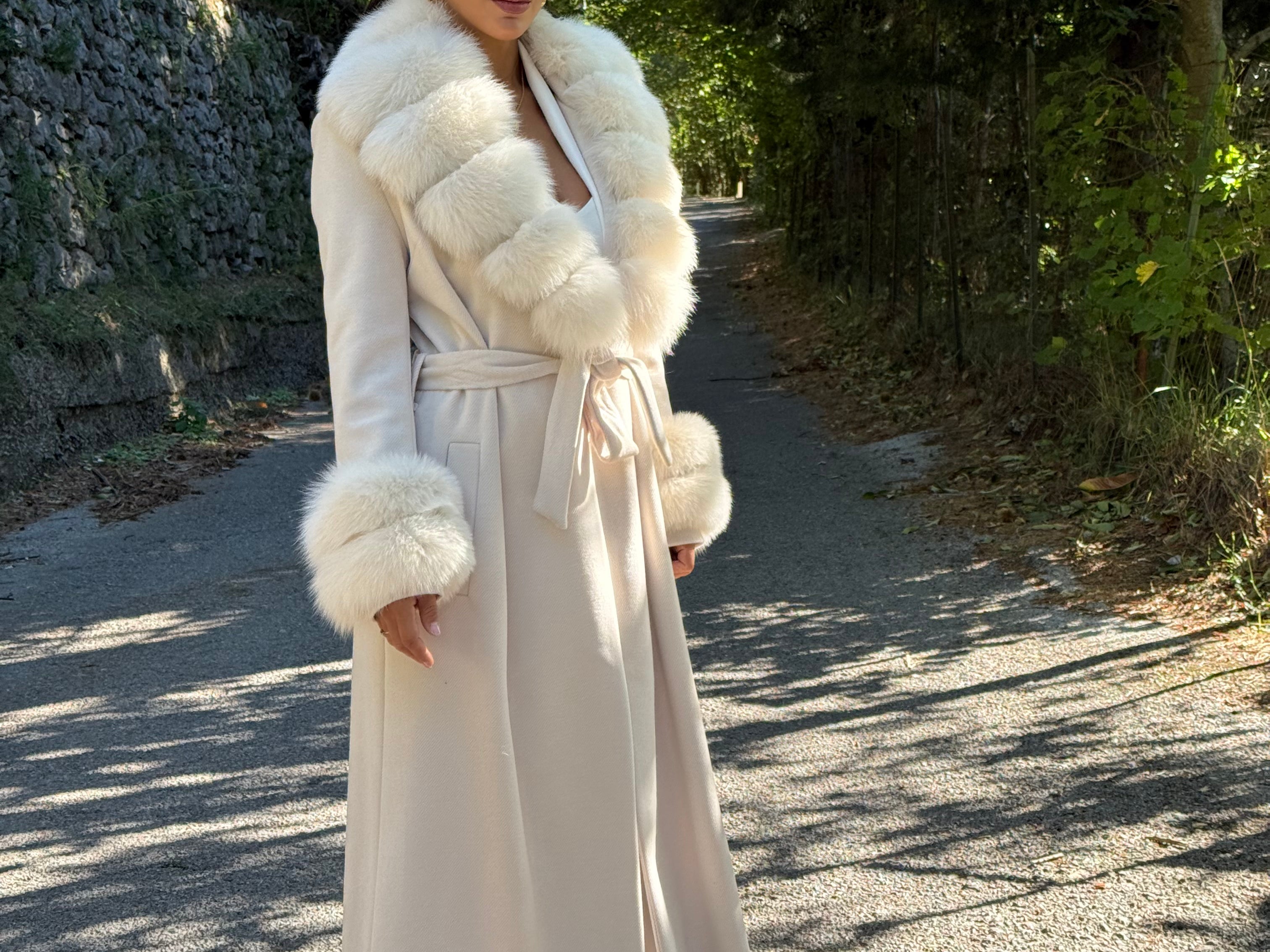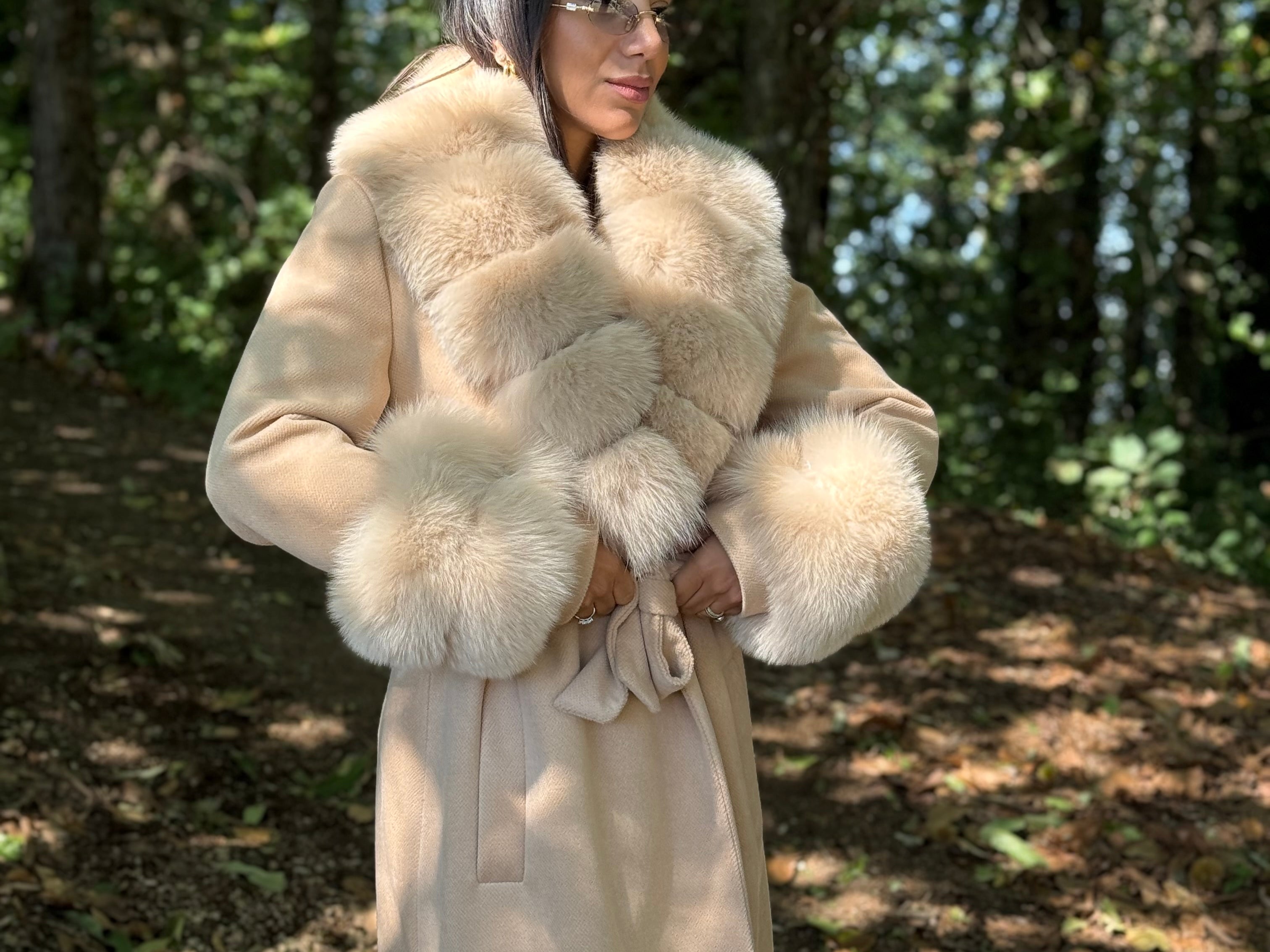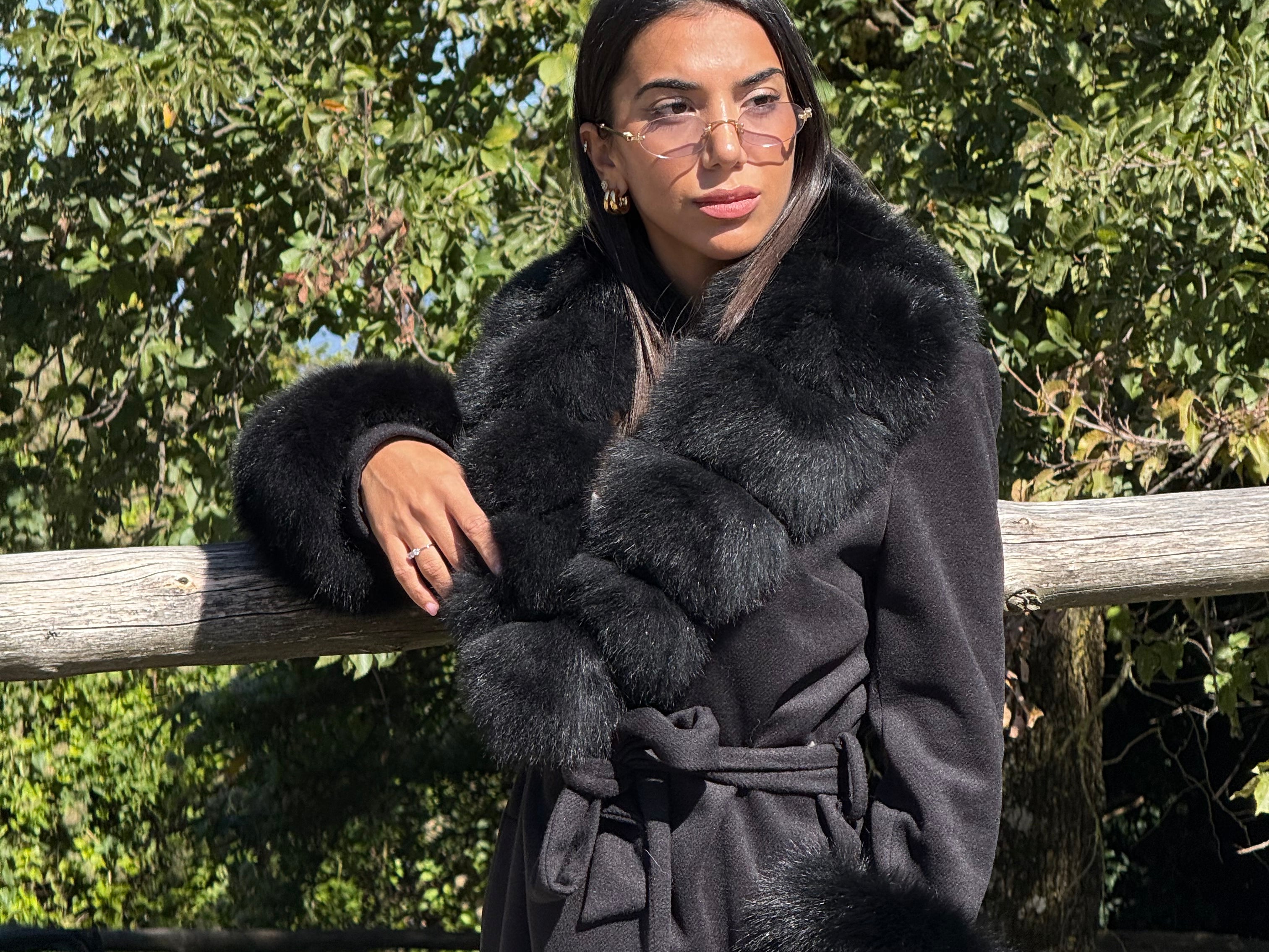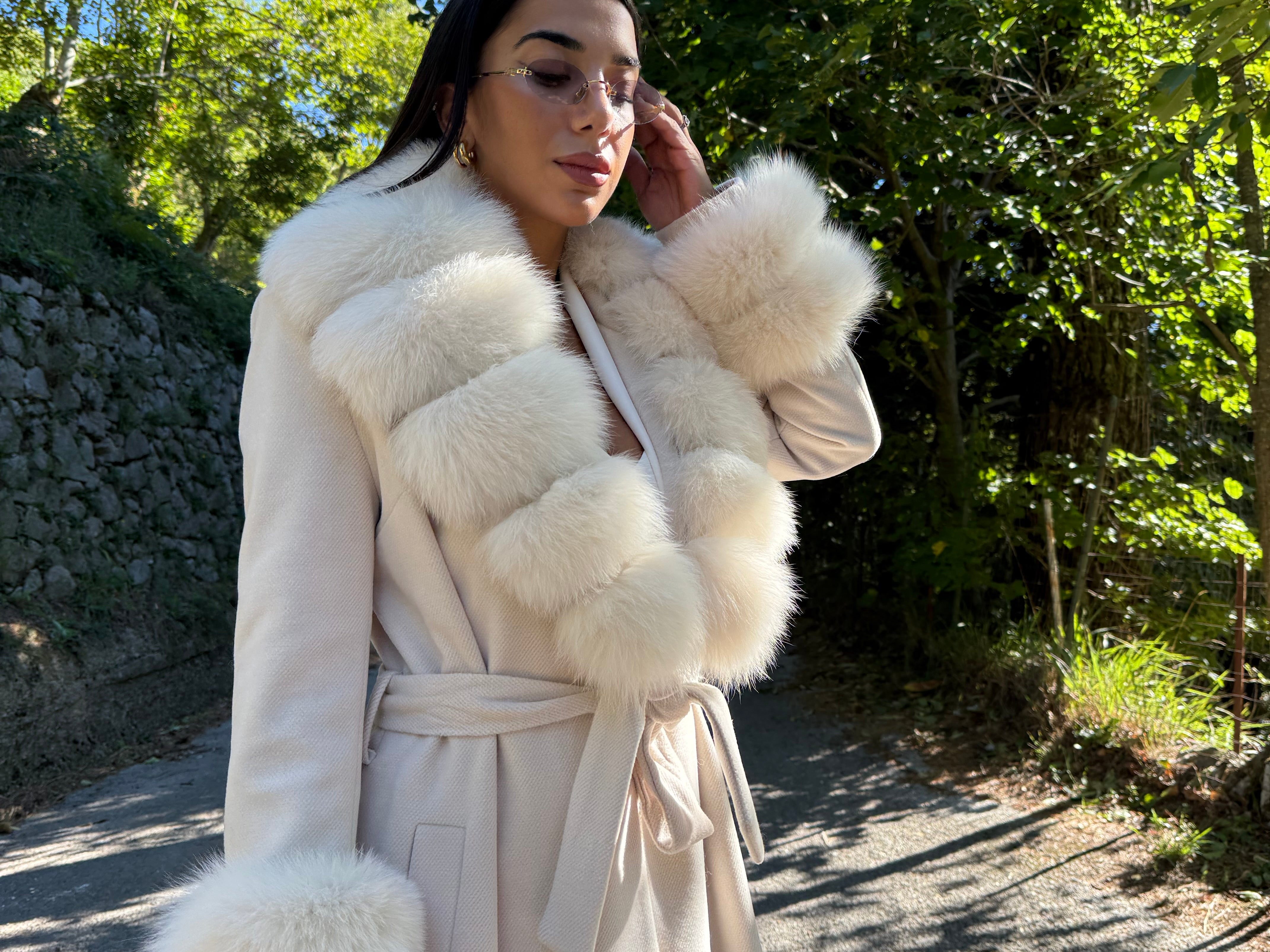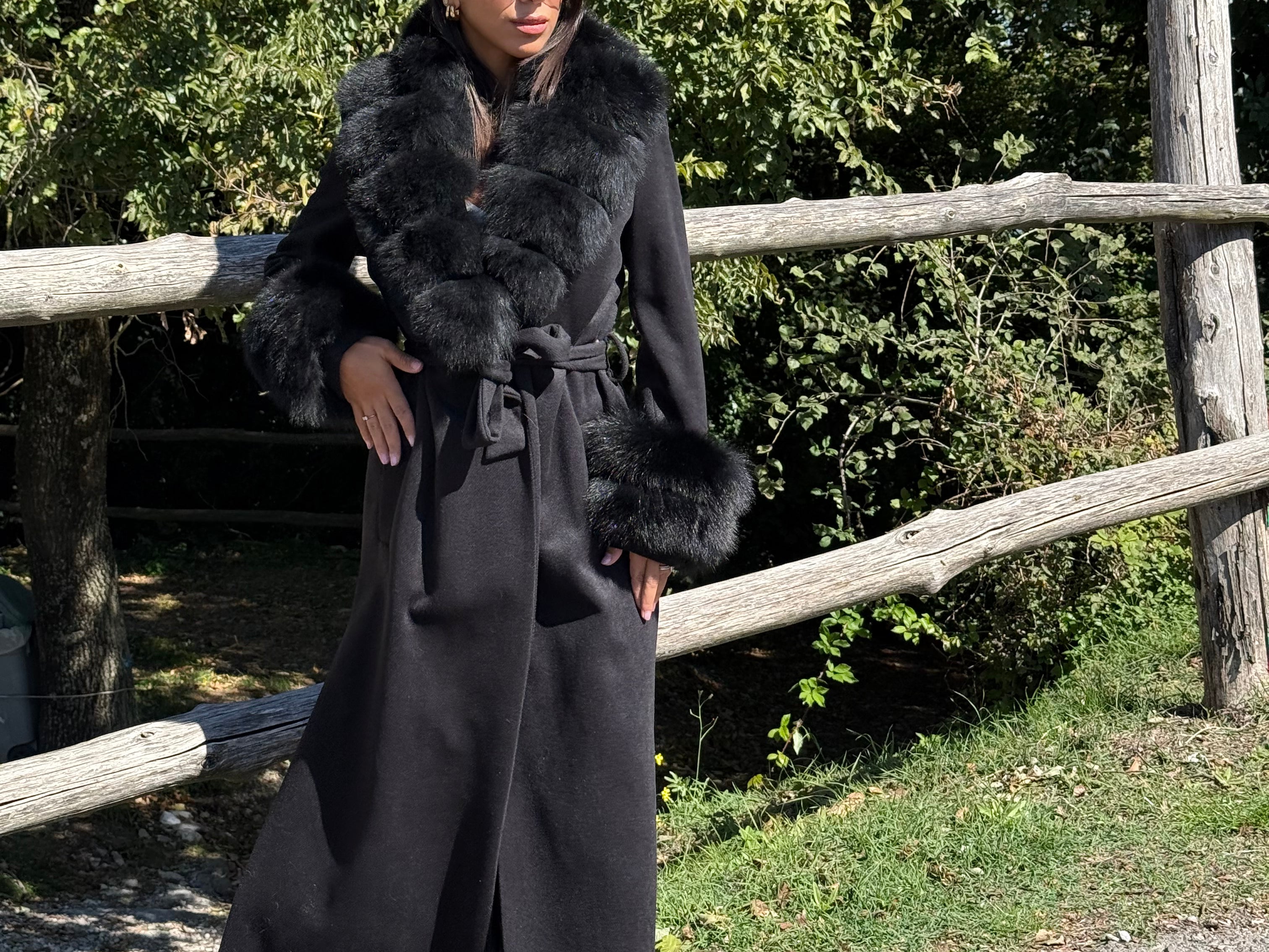 Elegante cappotto lungo con collo e polsini in vera Volpe.
