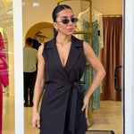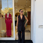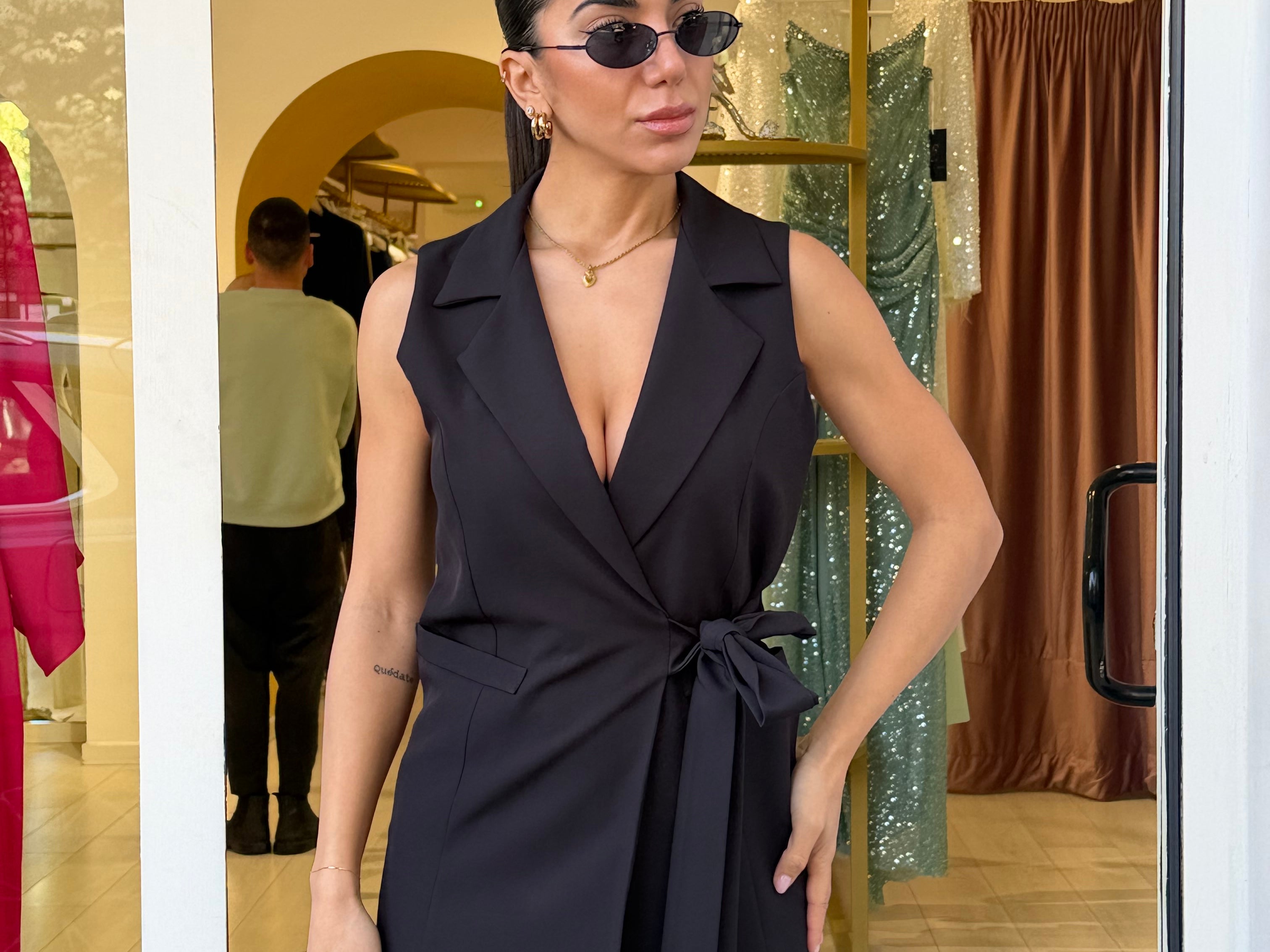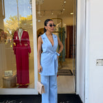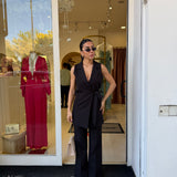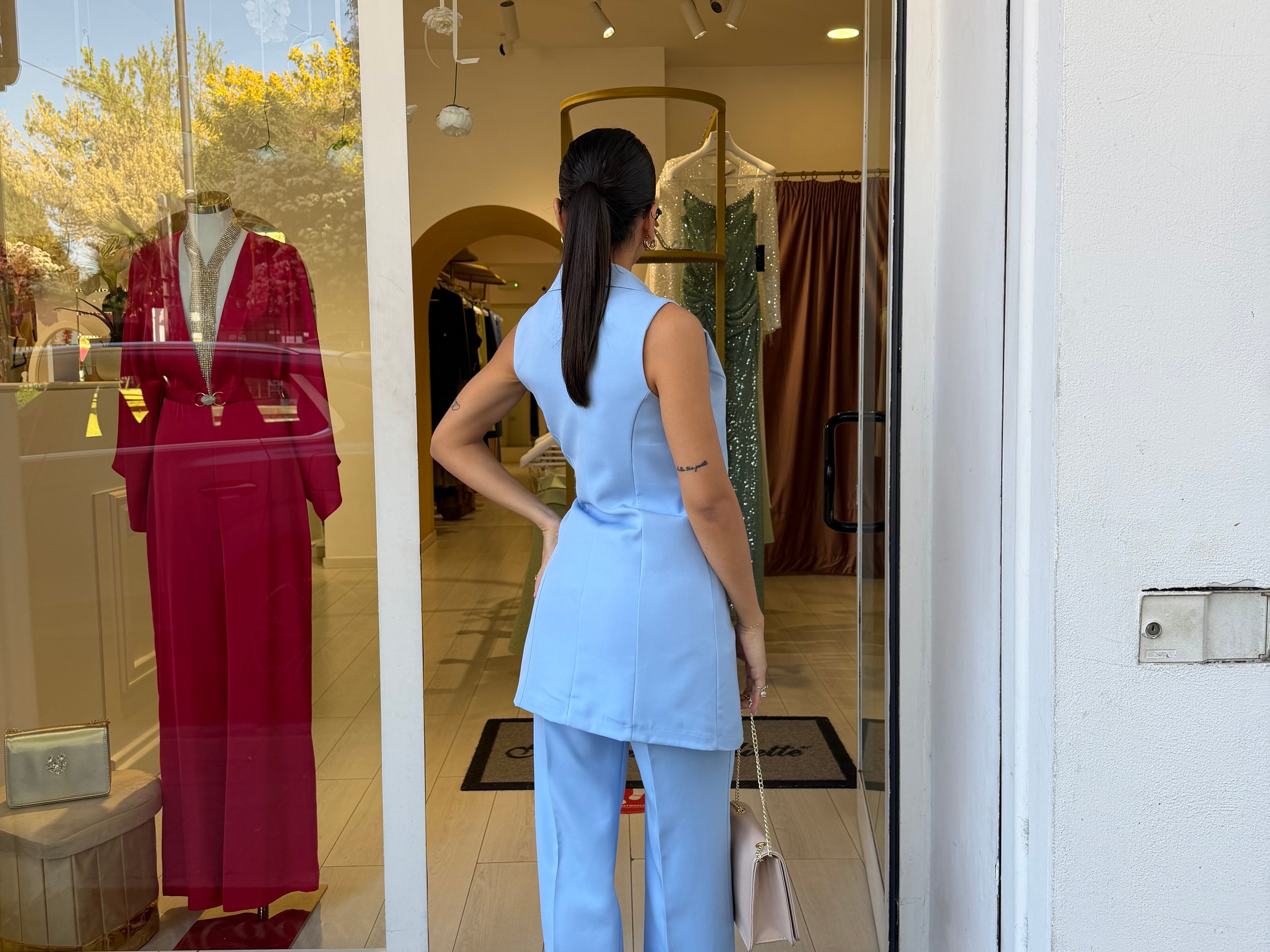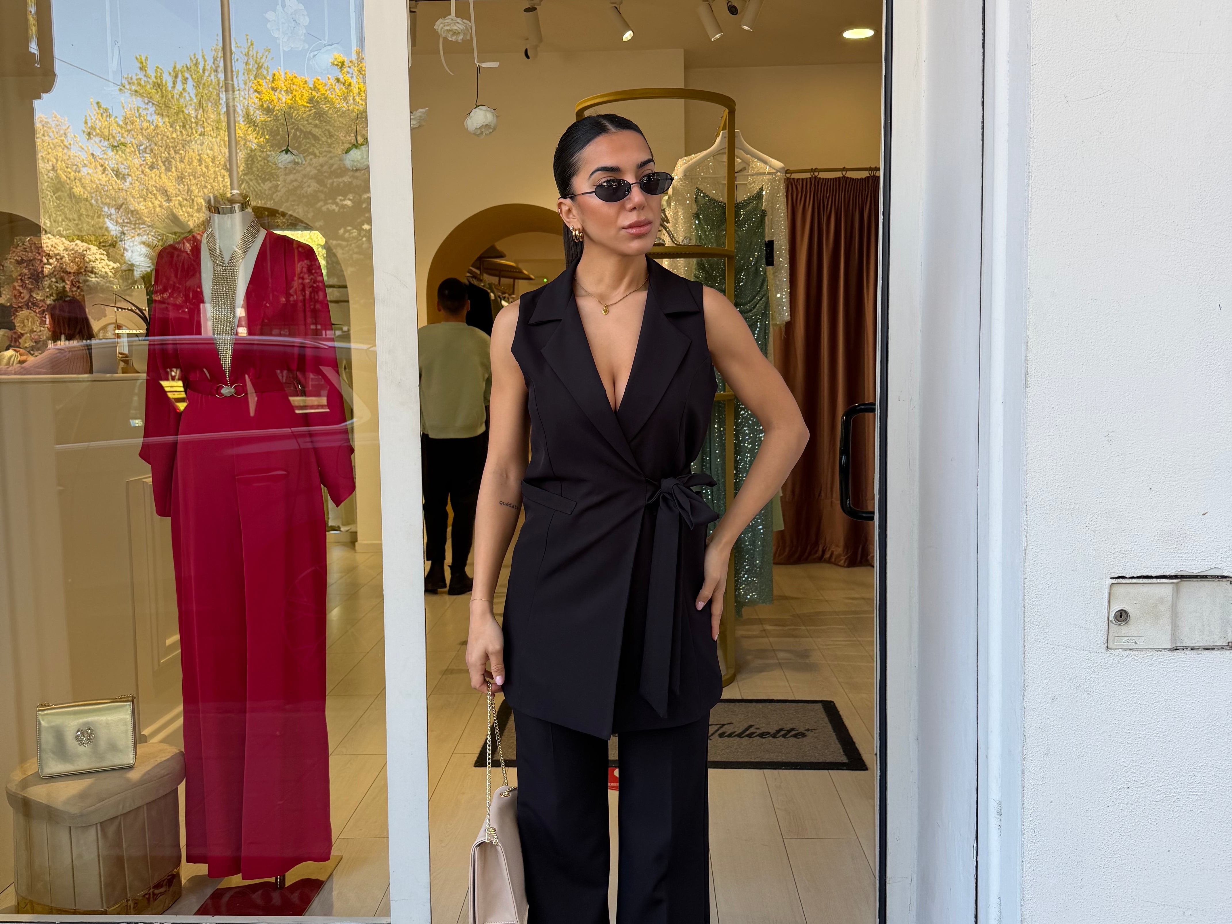 Completo dal taglio moderno e deciso, composto da gilet blazer senza maniche con scollo profondo e chiusura a portafoglio che valorizza la figura. Il punto vita è enfatizzato dal dettaglio con fiocco laterale, mentre il pantalone a linea fluida completa il look con equilibrio e raffinatezza.