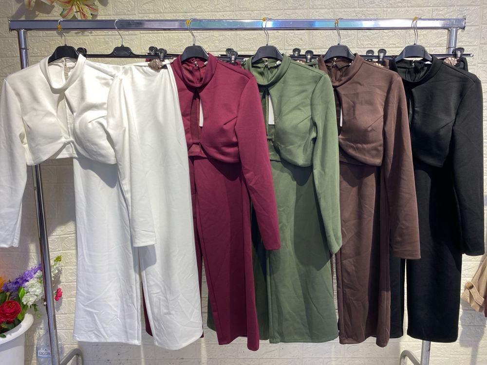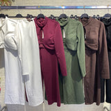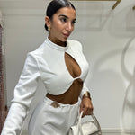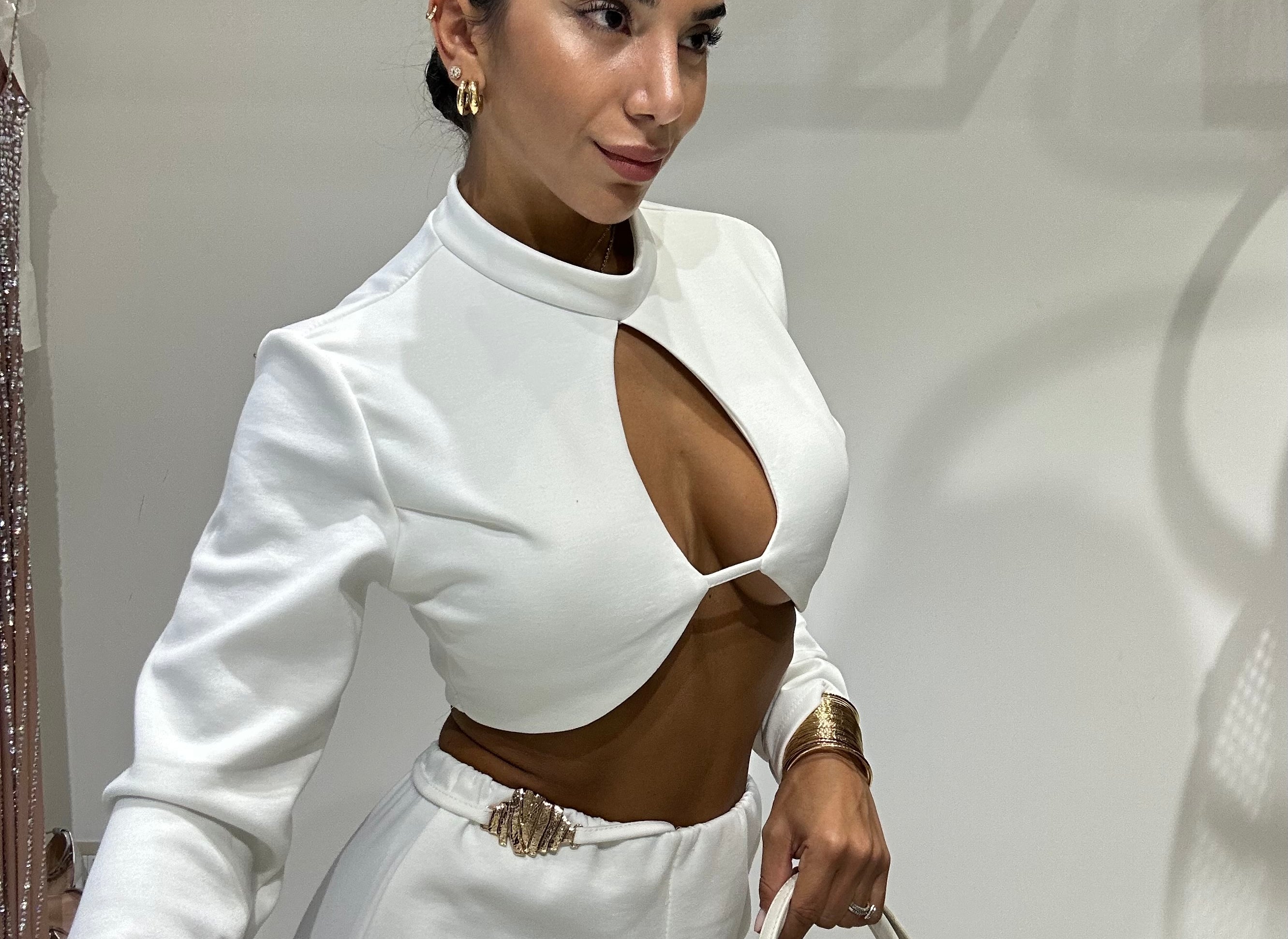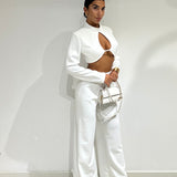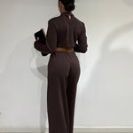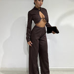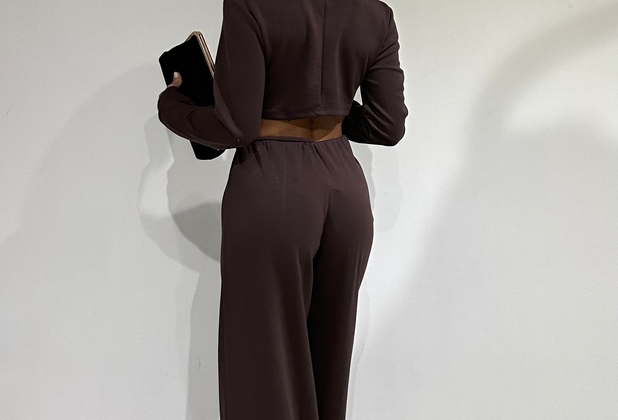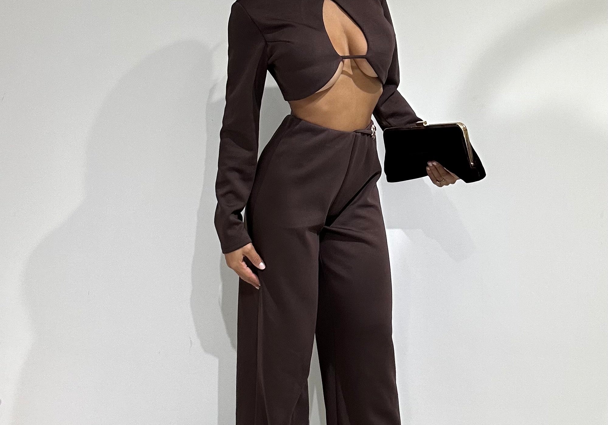 Completo due pezzi composto da pantalone a palazzo e top manica lunga con profonda scollatura sul décolleté