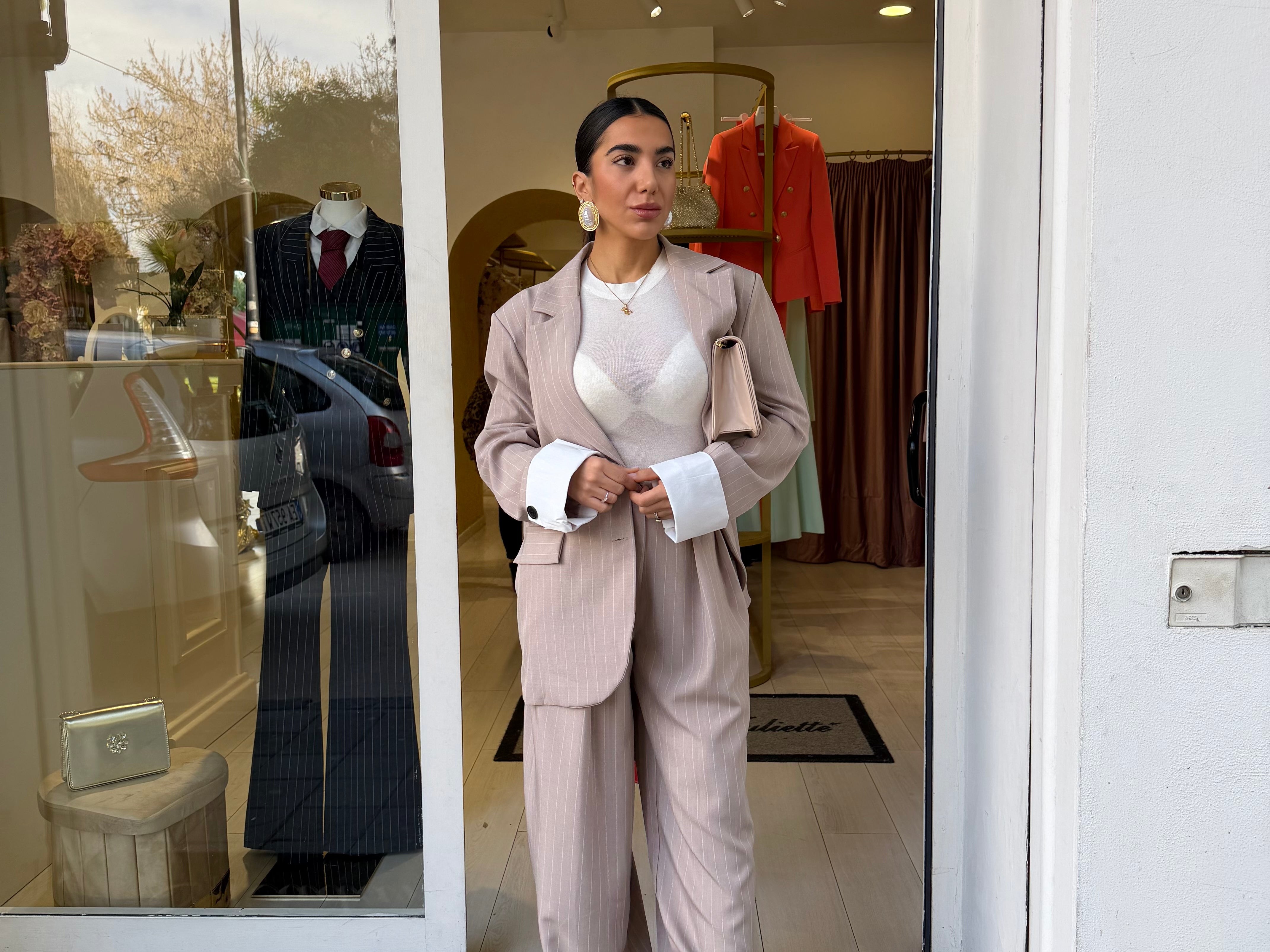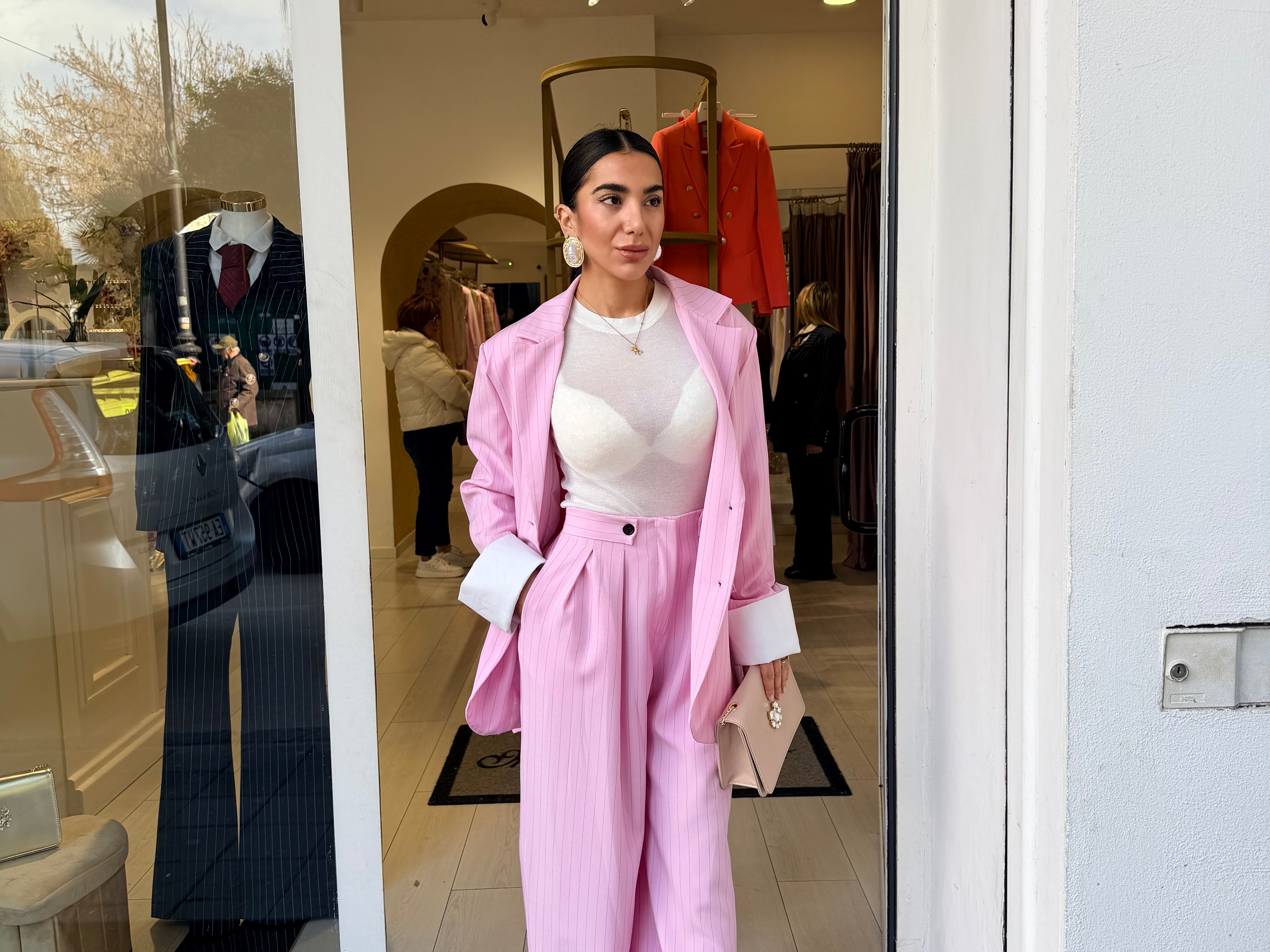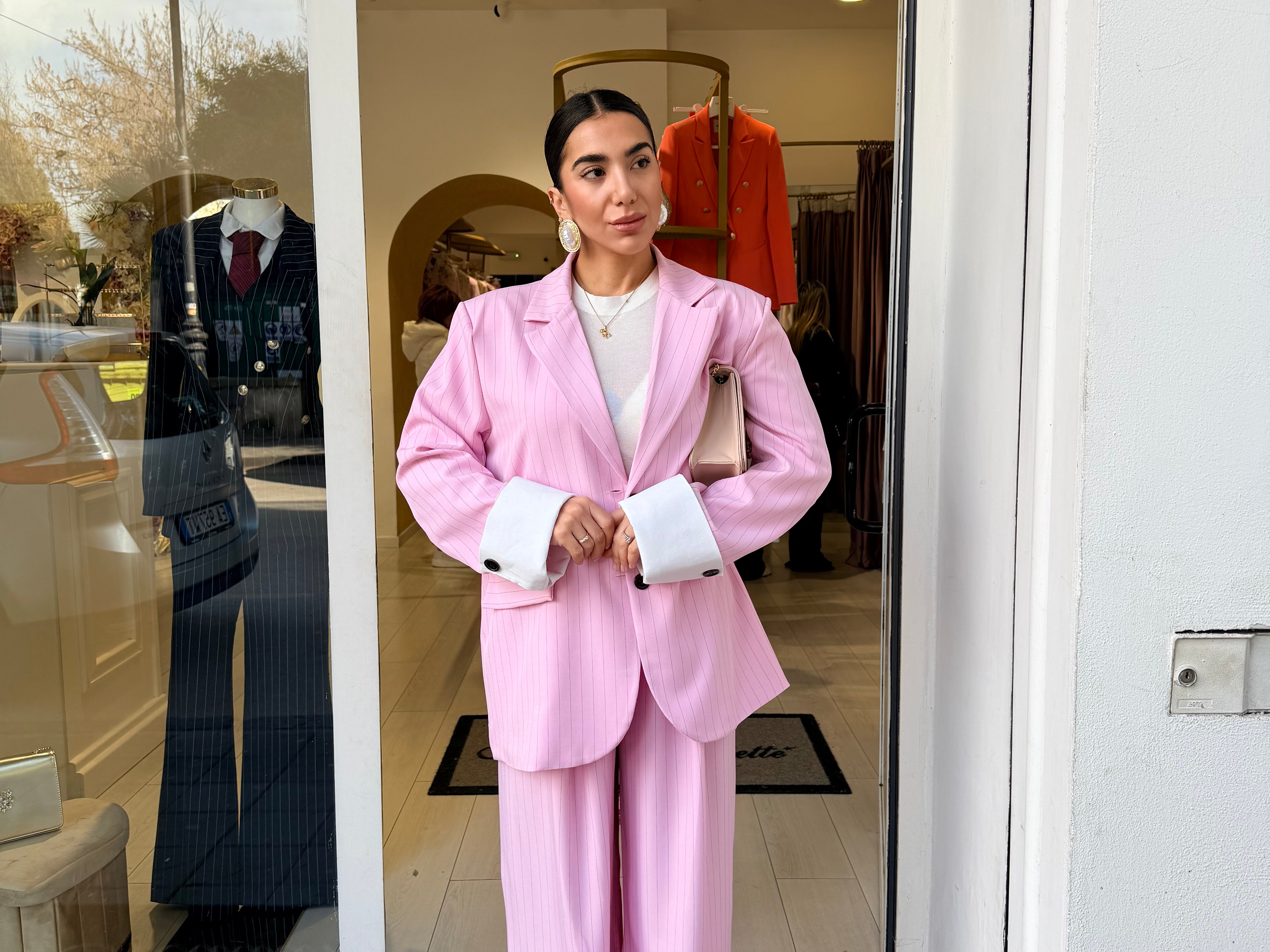 tailleur composto da pantalone con elastico in vita molto comodo e giacca lunga con maniche risvolte