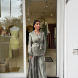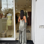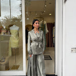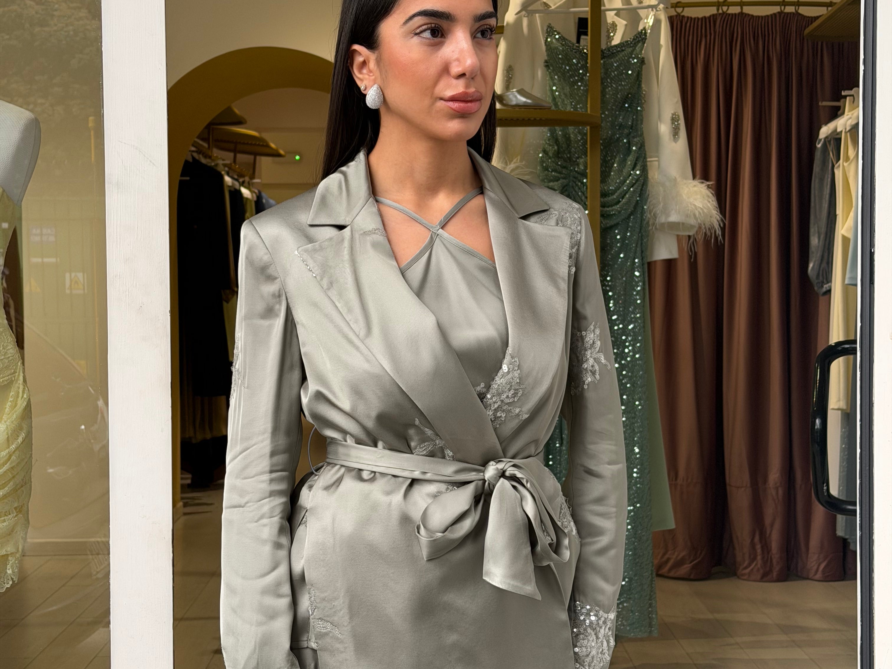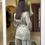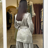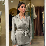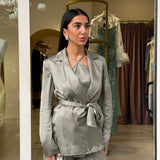 La giacca, dal taglio sartoriale e avvolgente, è valorizzata da una chiusura a portafoglio con cintura in vita che definisce la silhouette con eleganza. Sotto, il top leggero presenta uno scollo incrociato delicato sul davanti e una linea morbida che cade fluida sul corpo, lasciando la schiena scoperta con sottili spalline.