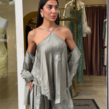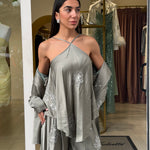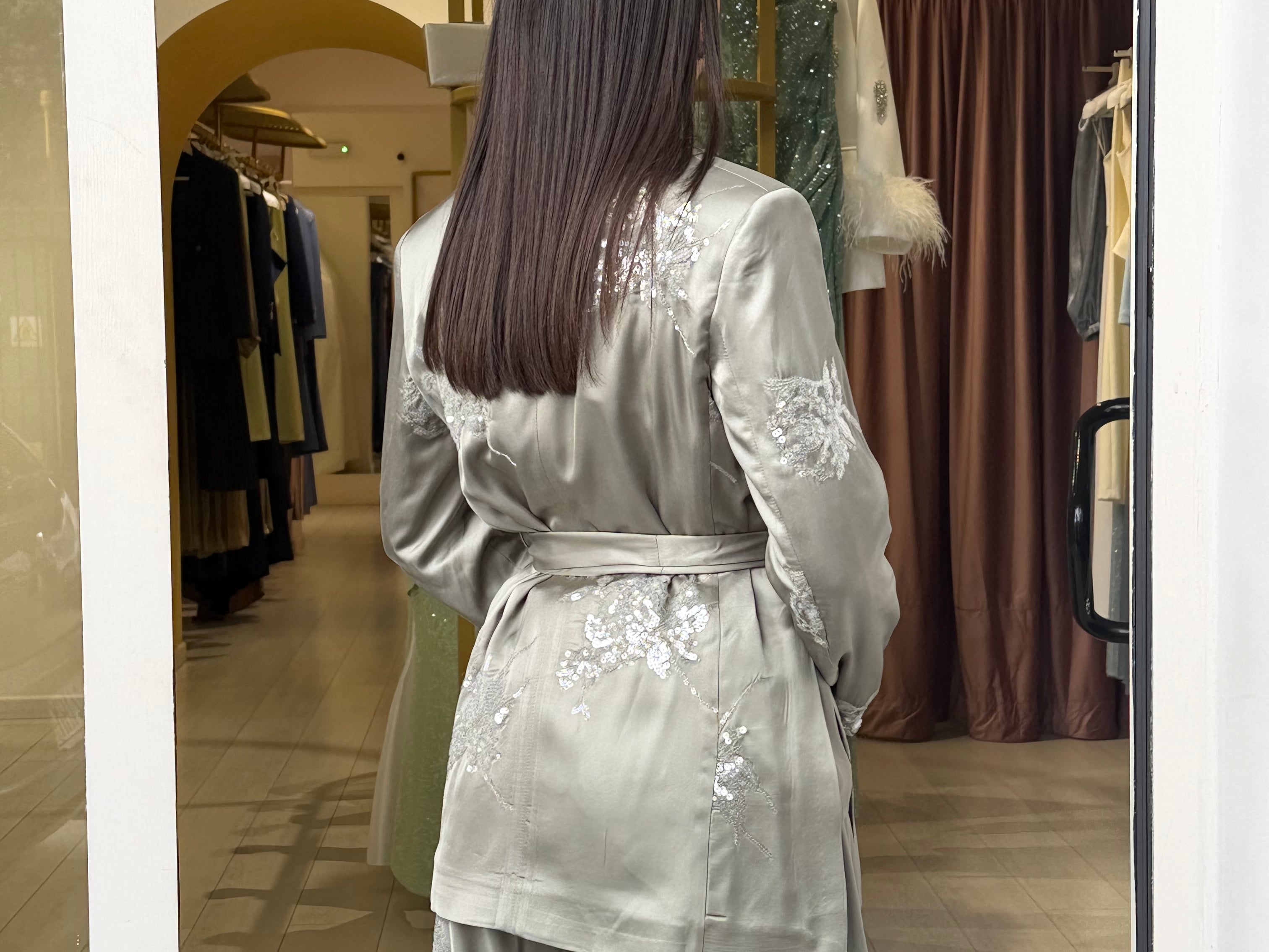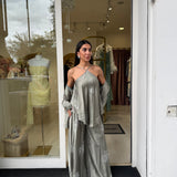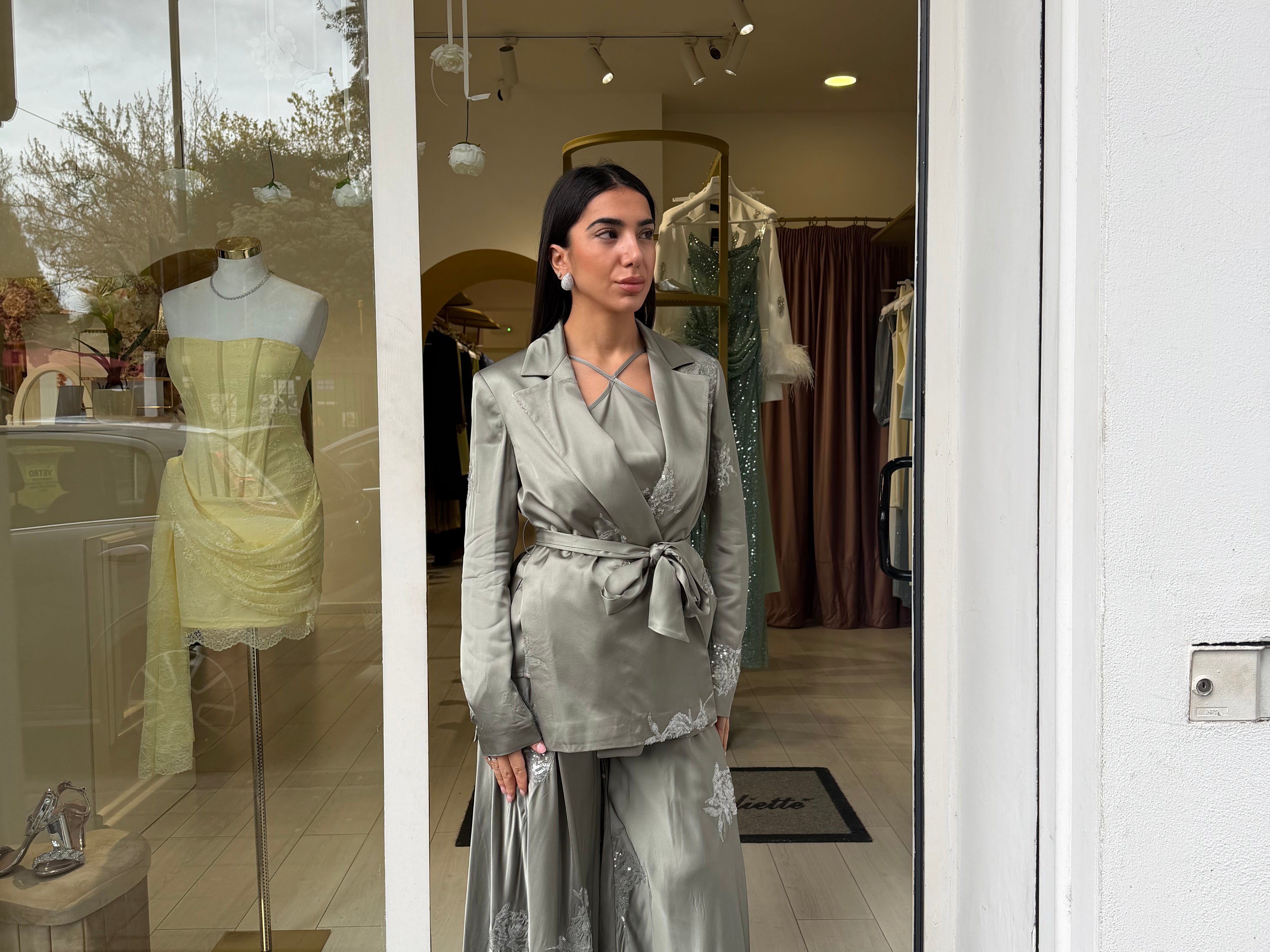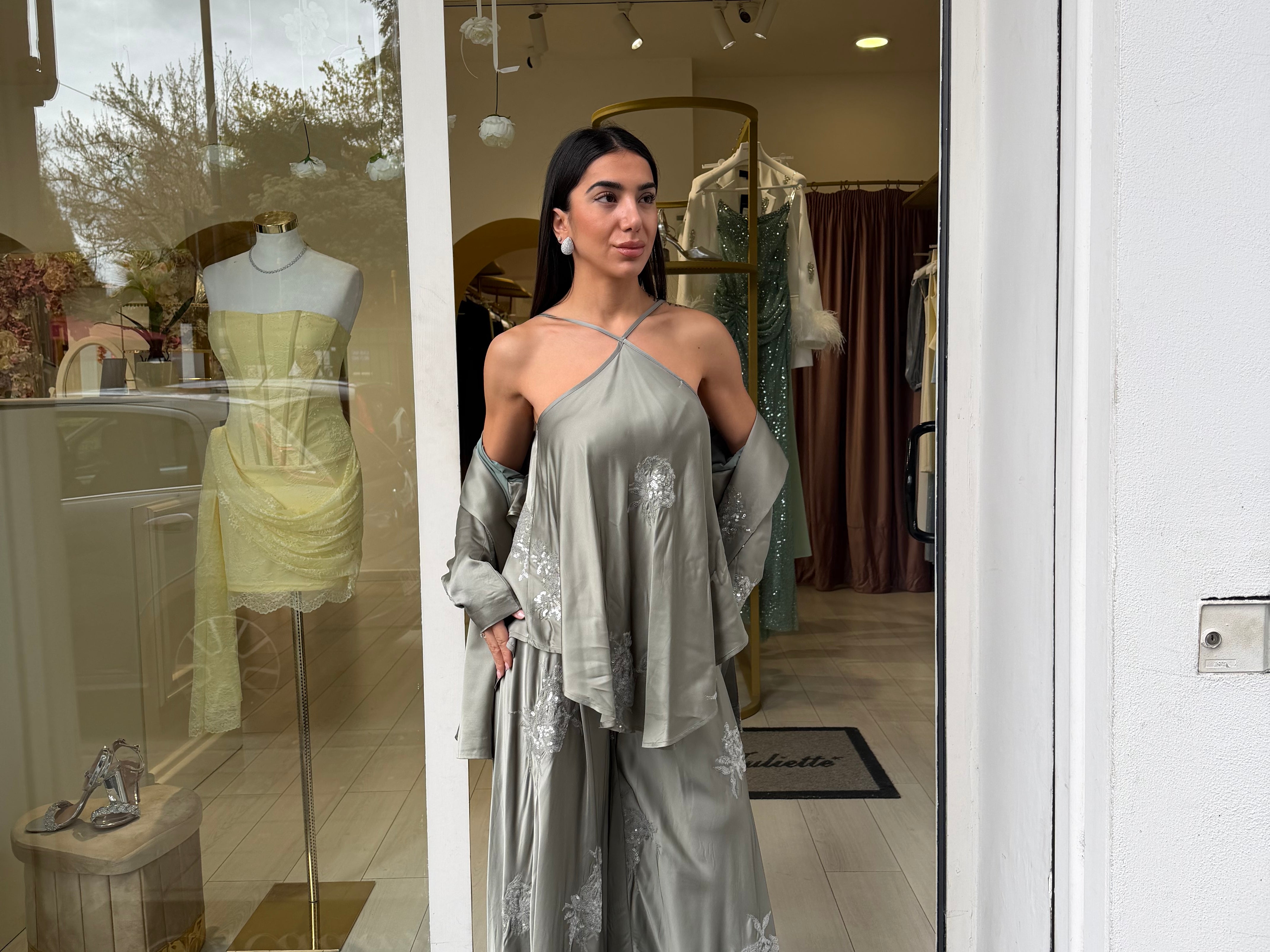 Il pantalone ampio completa il look con una vestibilità comoda e sofisticata, arricchito da dettagli ricamati che donano luce e ricercatezza all’insieme.
