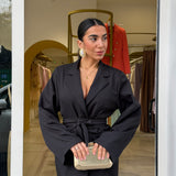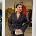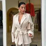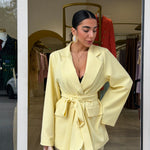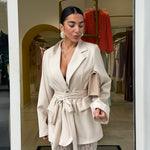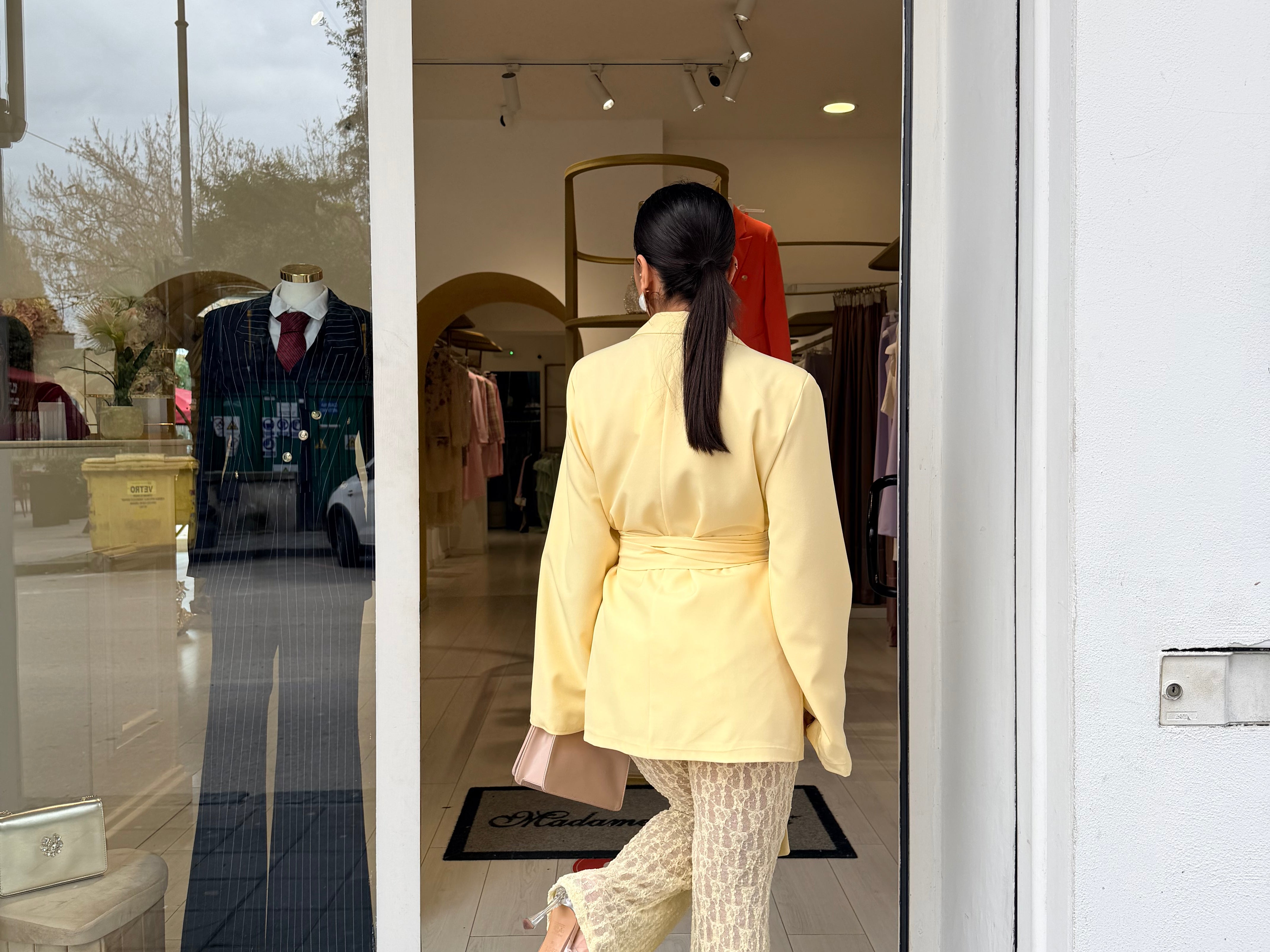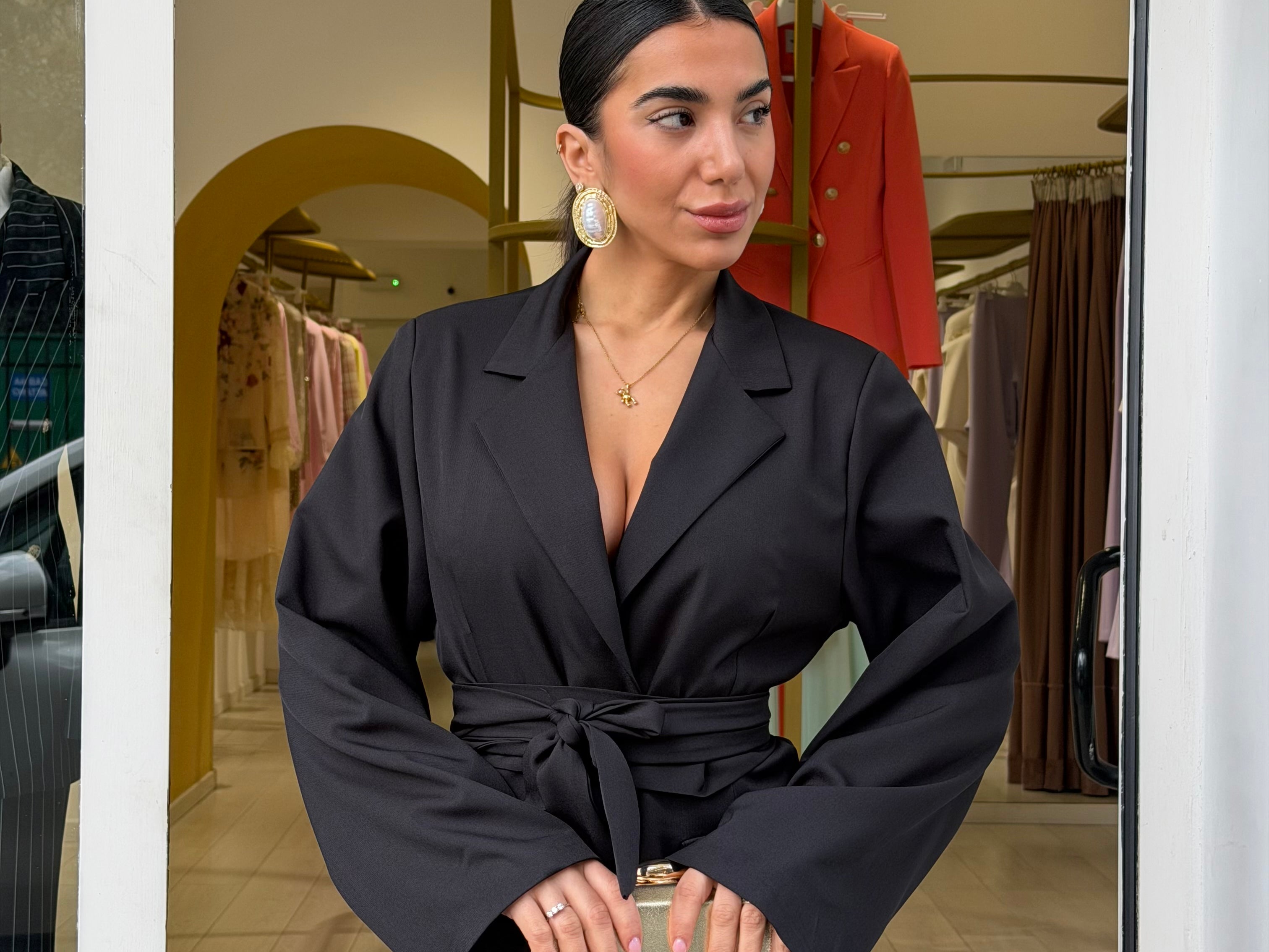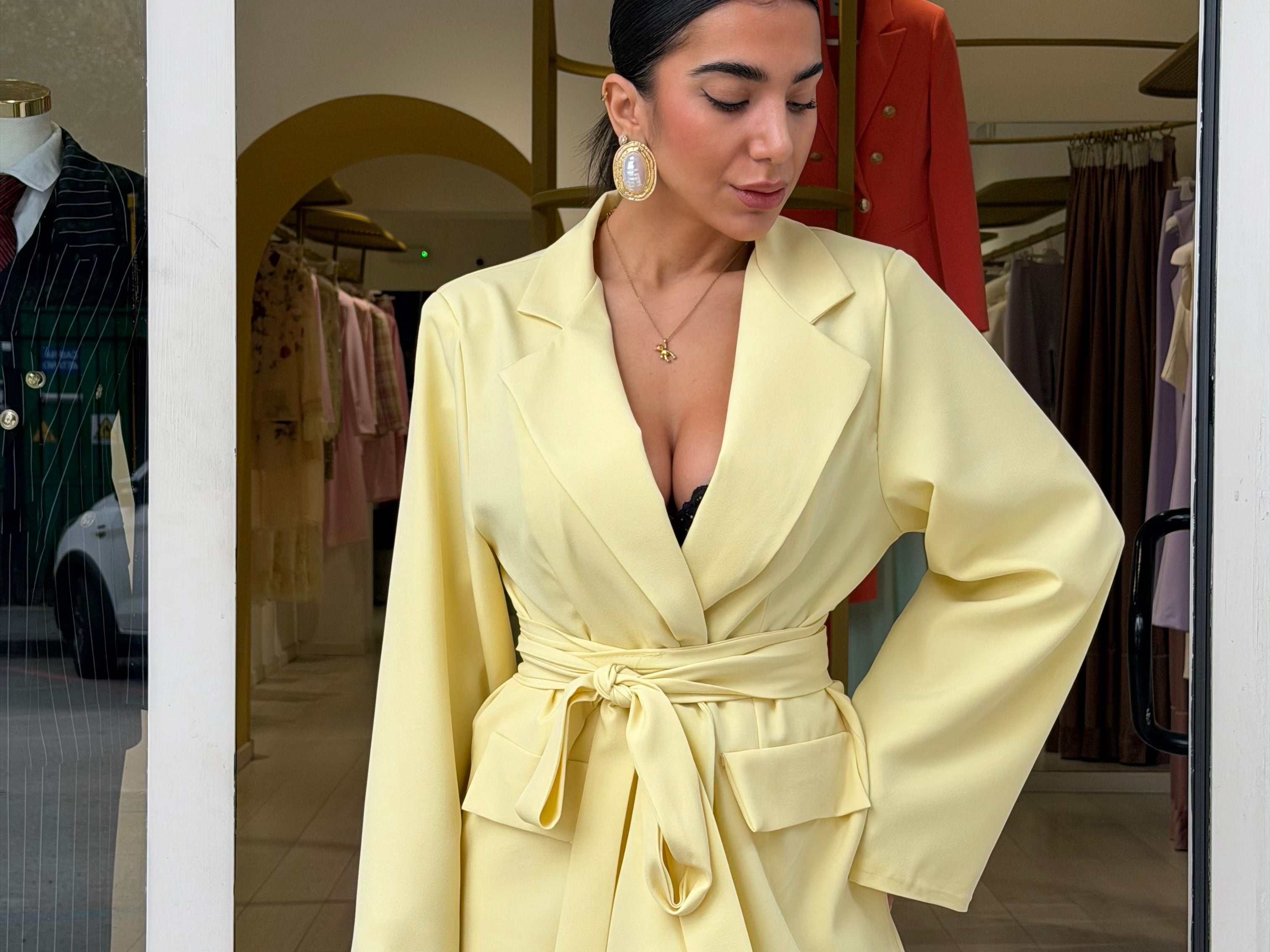 la giacca é caratterizzata da chiusura a portafoglio accentuata da una cintura in tessuto che definisce il punto vita
