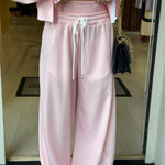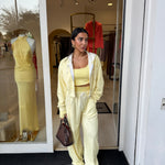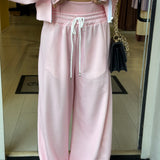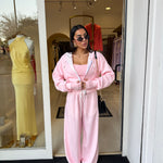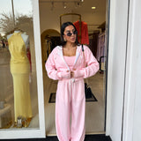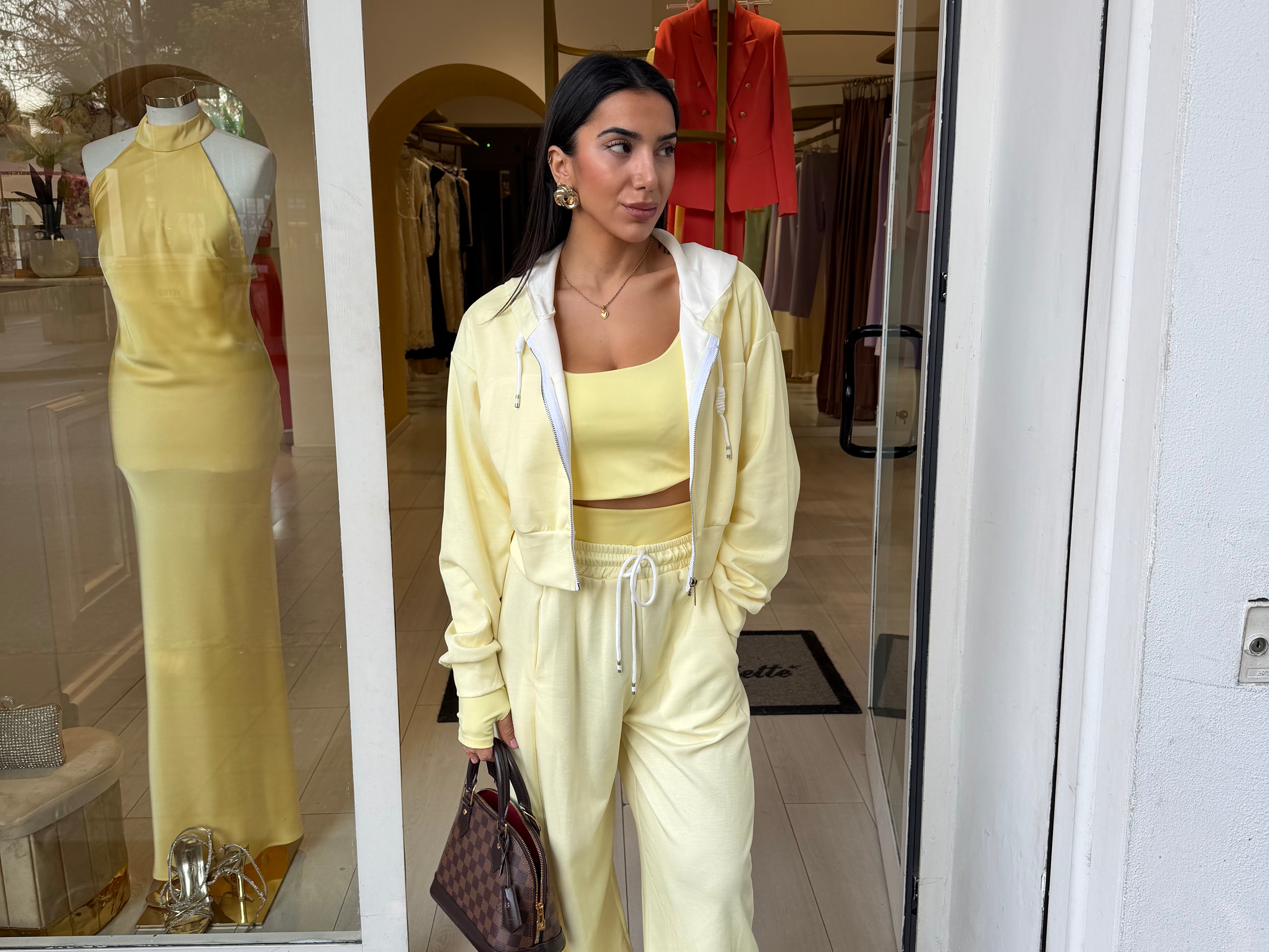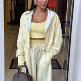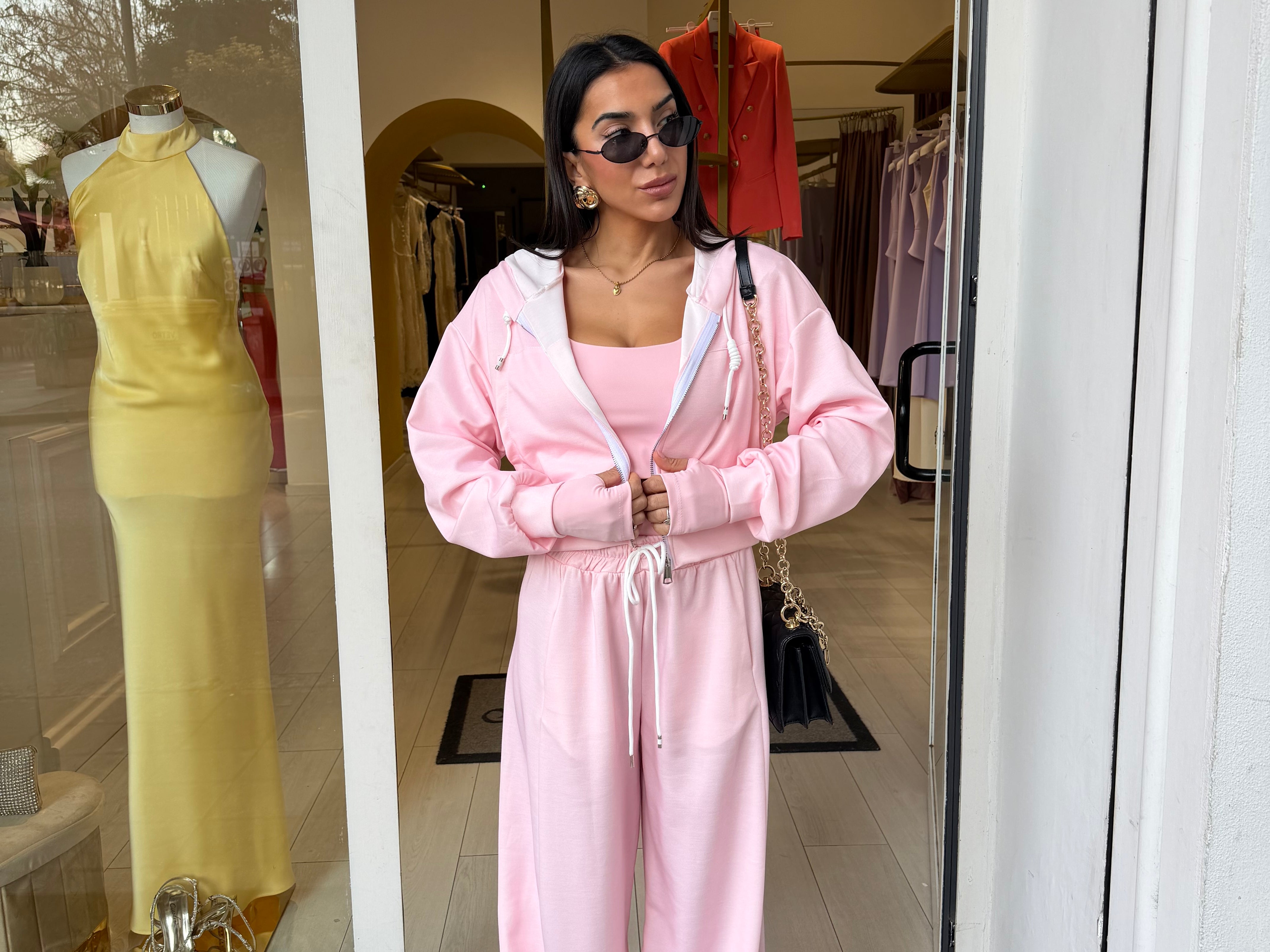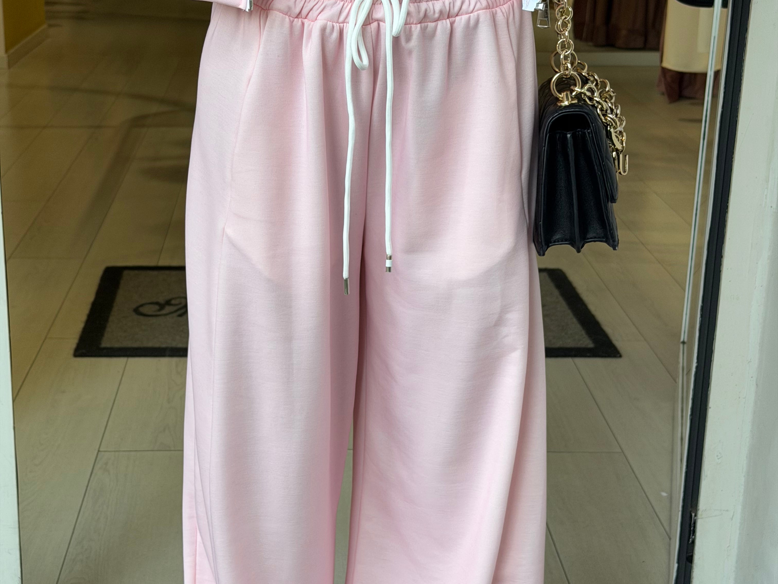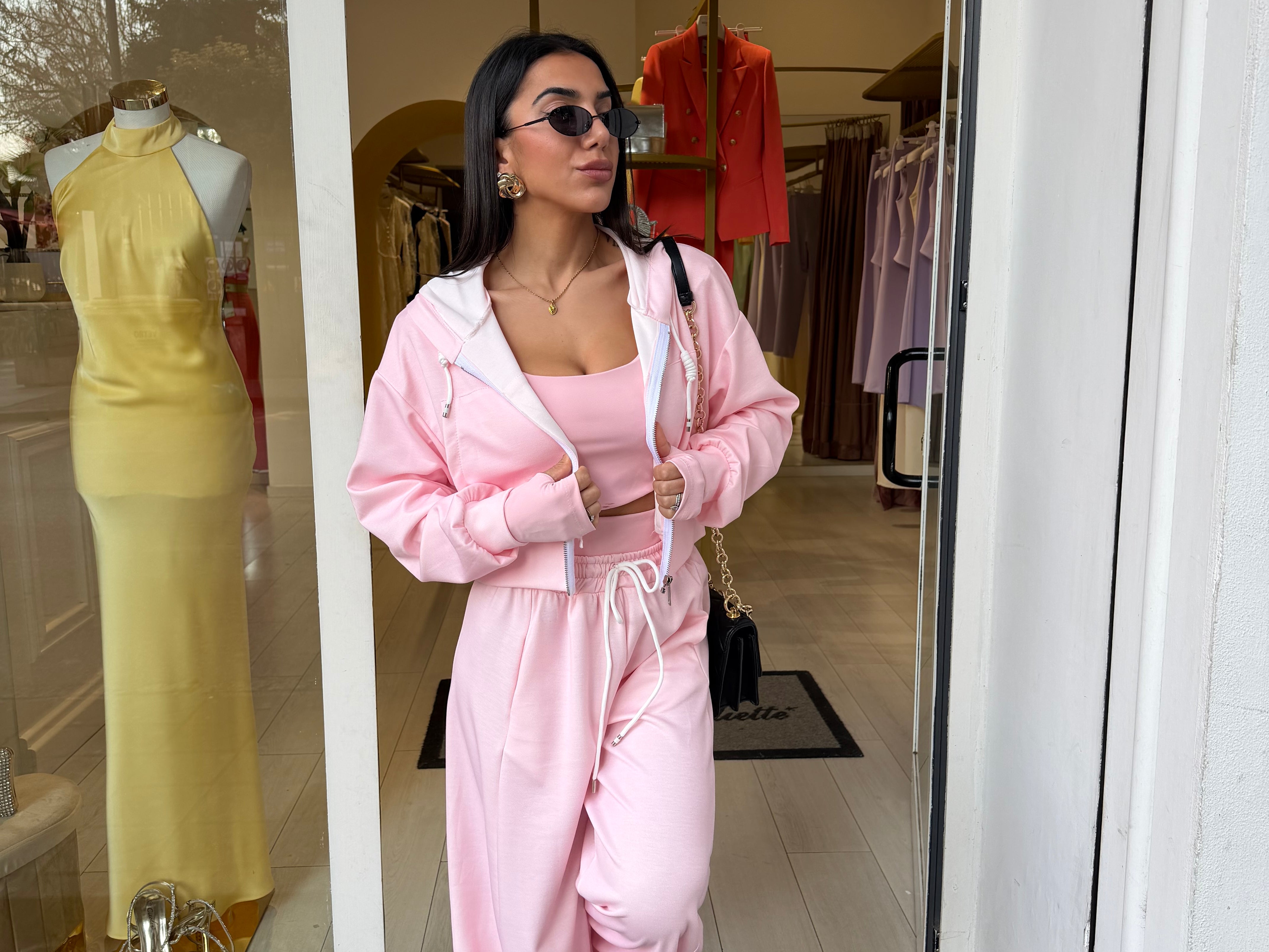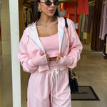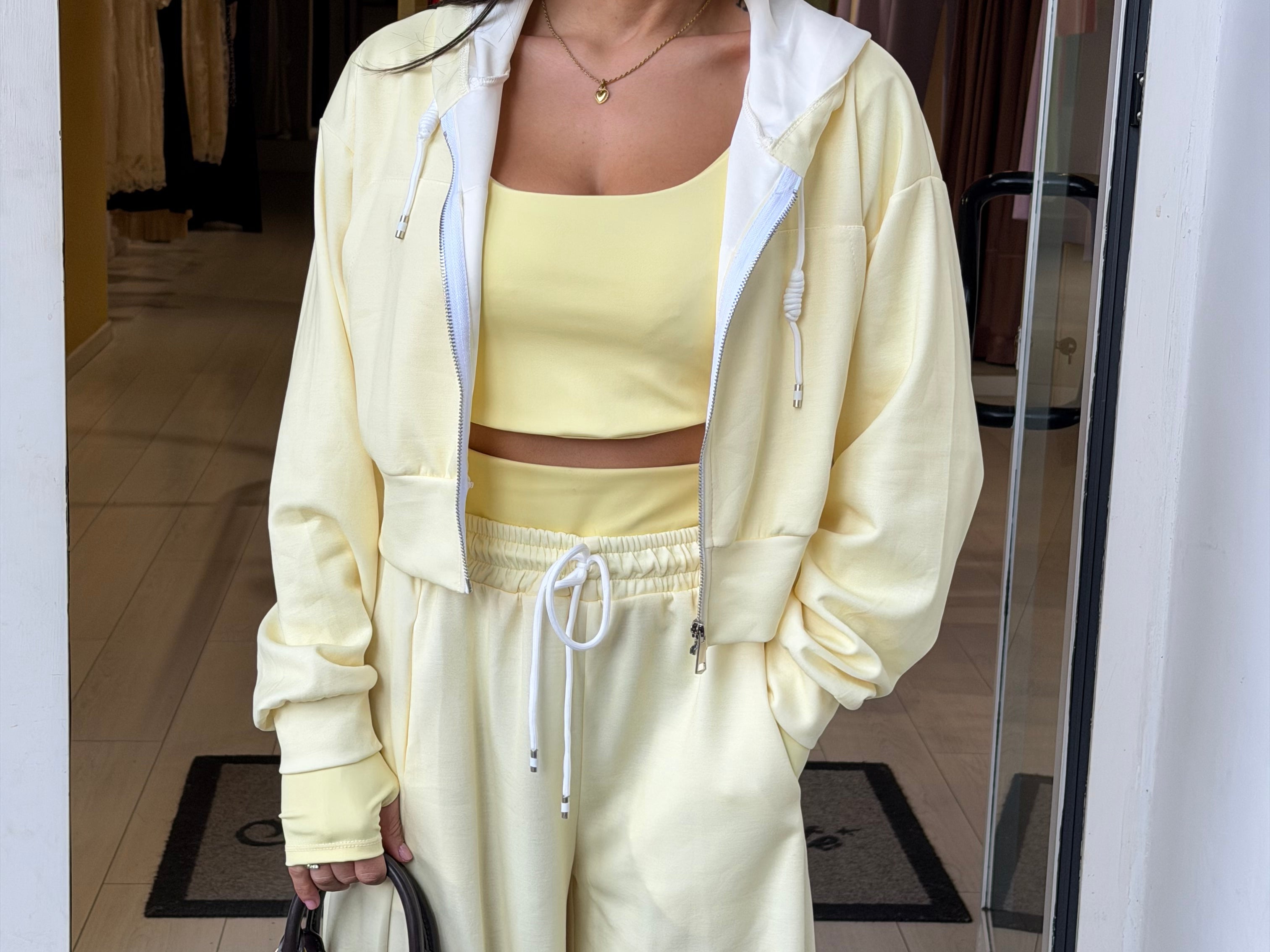 Completo tre pezzi dal look sportivo e femminile, composto da pantaloni morbido, top e felpa con zip e cappuccio!