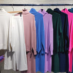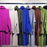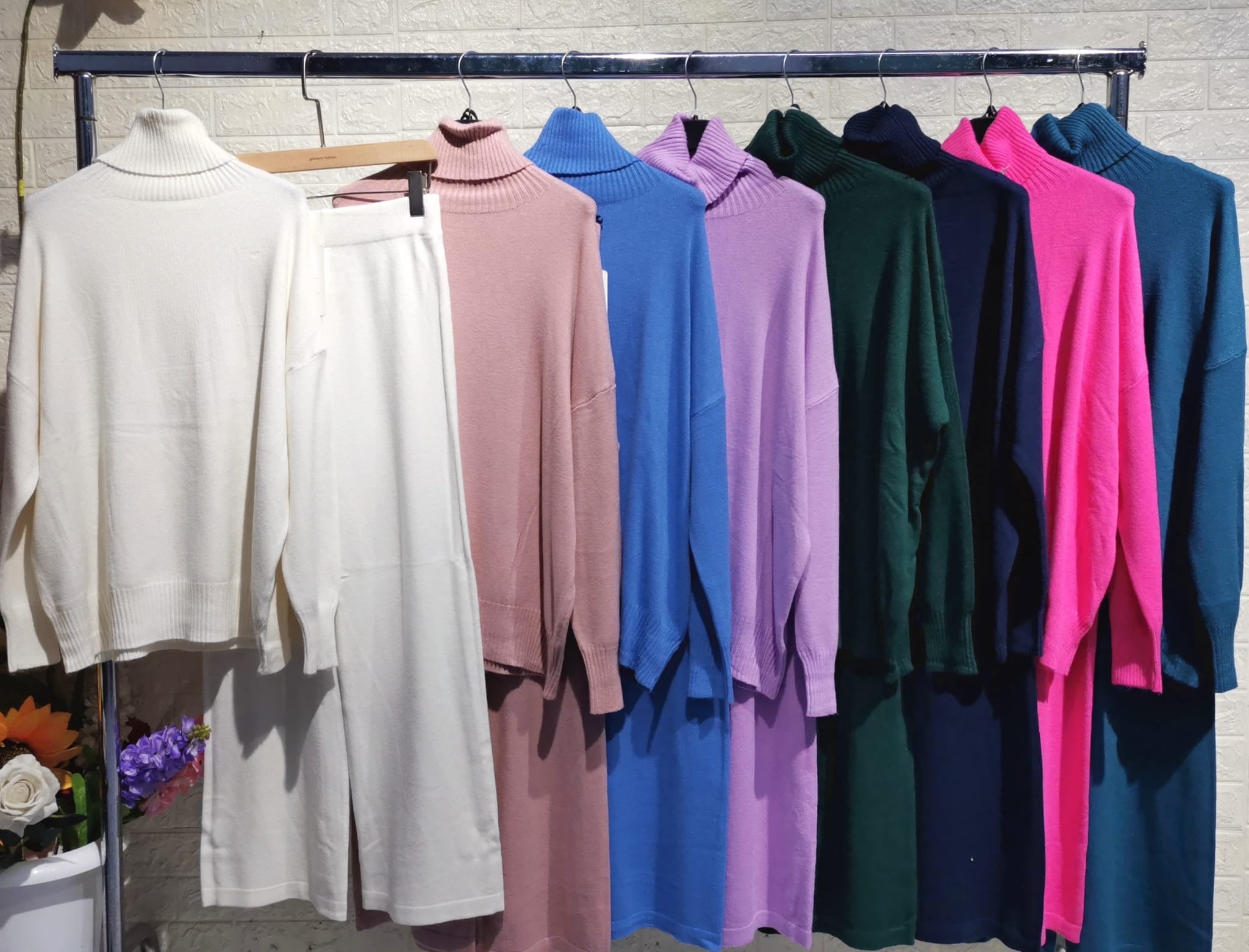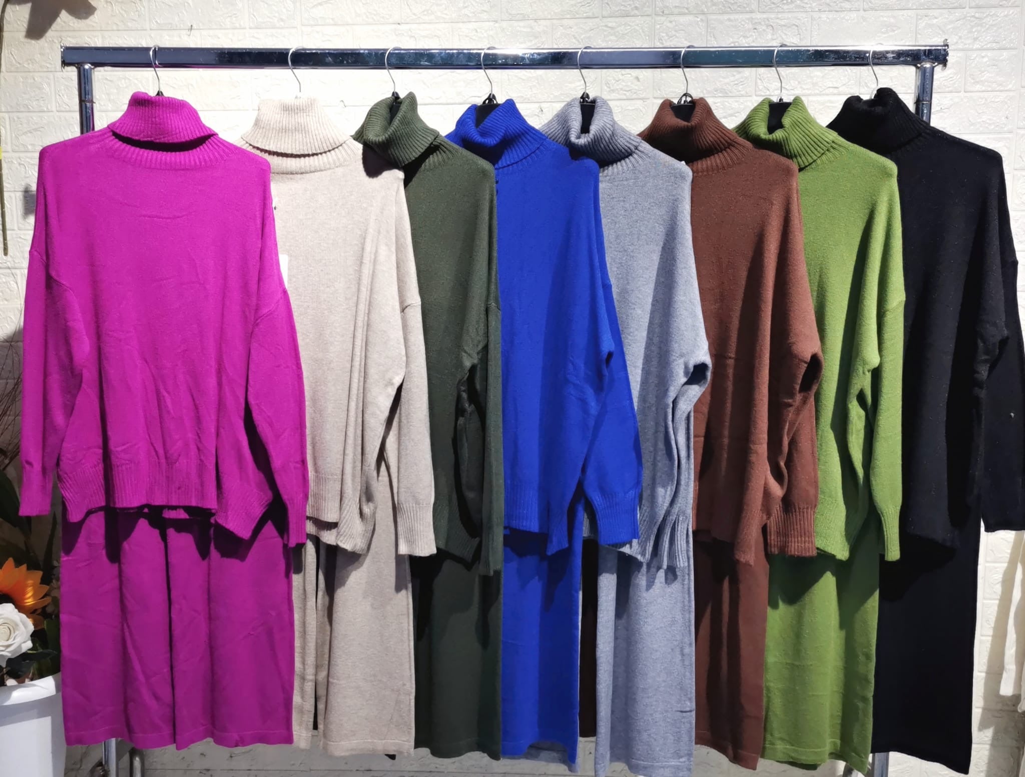 completo in lana rasata con elastico in vita e maglione a collo alto