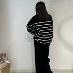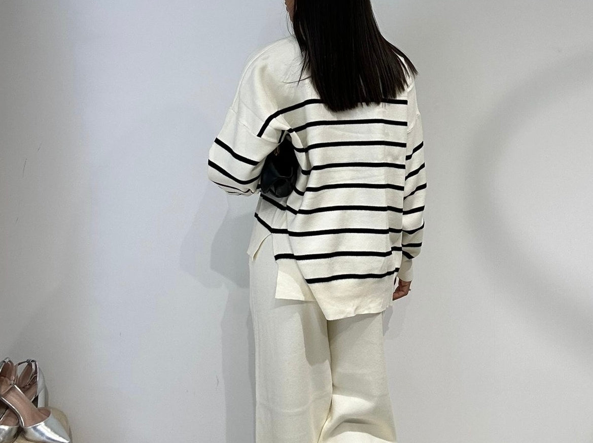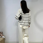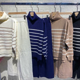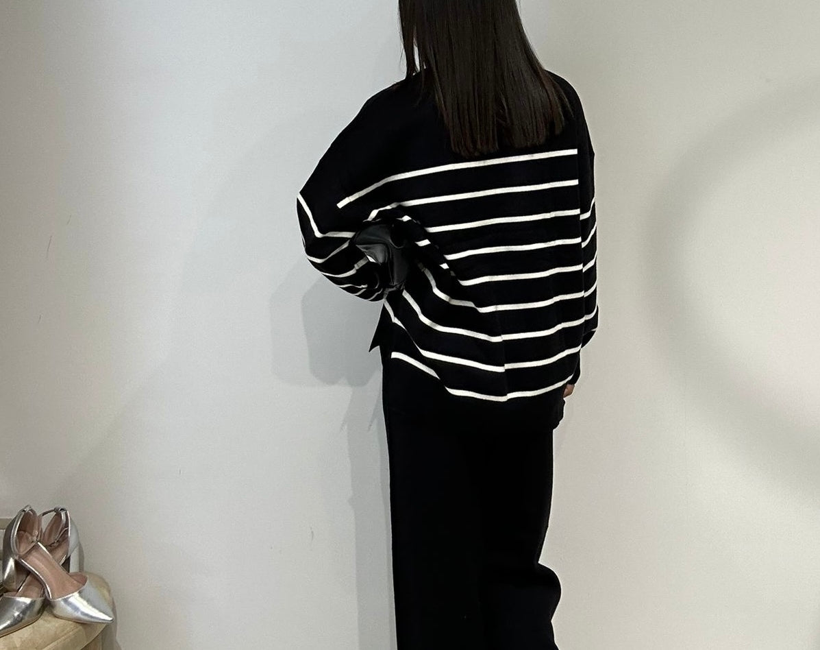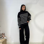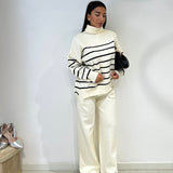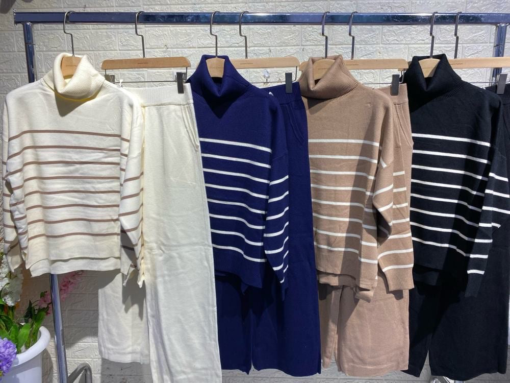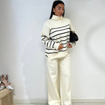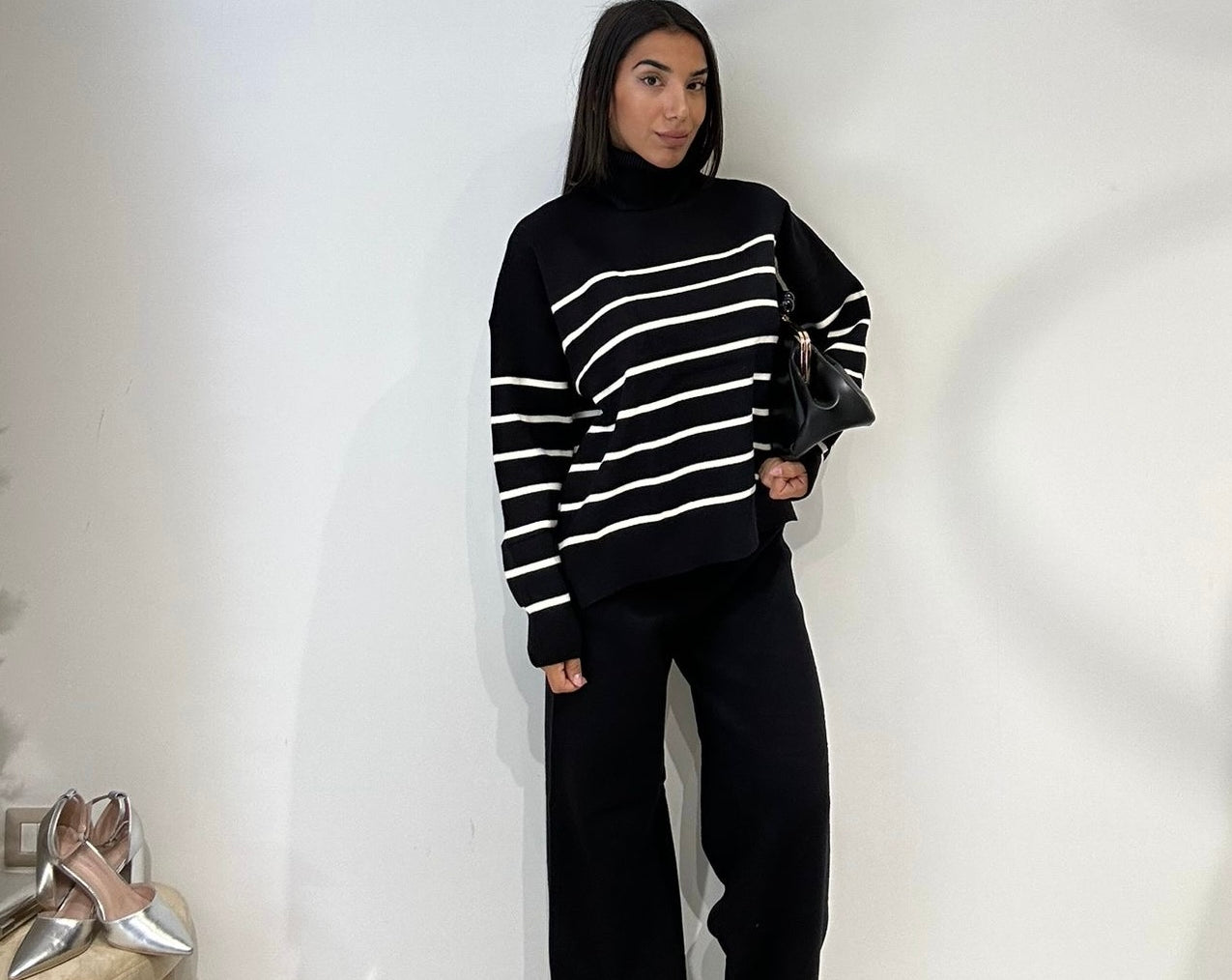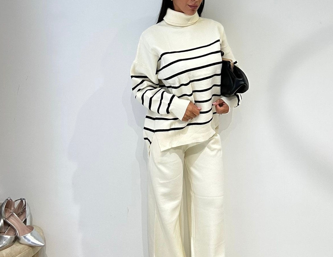 Cordinato in lana rasa composto da pantalone a palazzo e maglioncino collo alto a righe