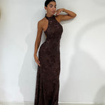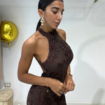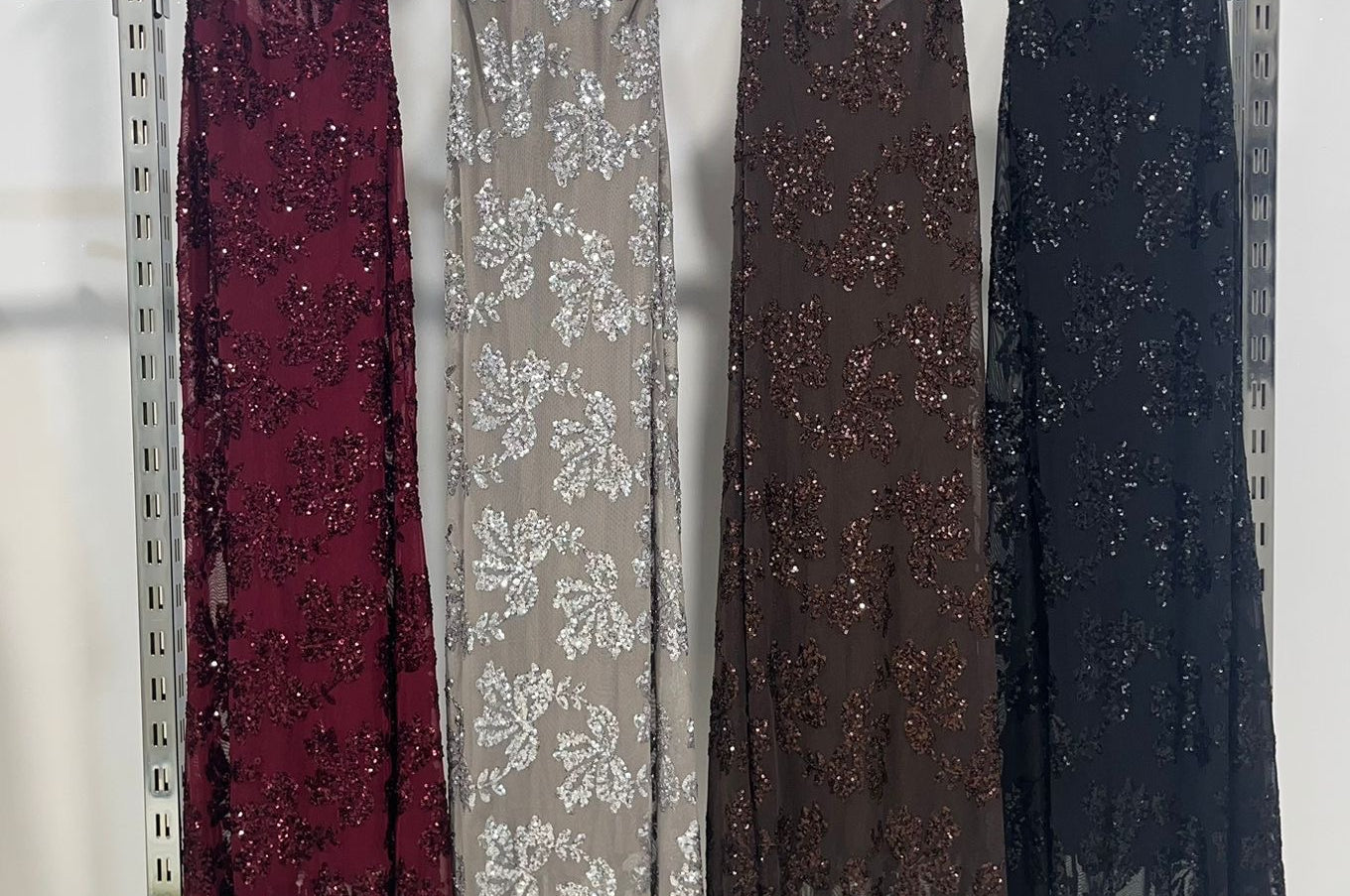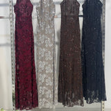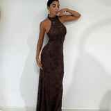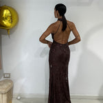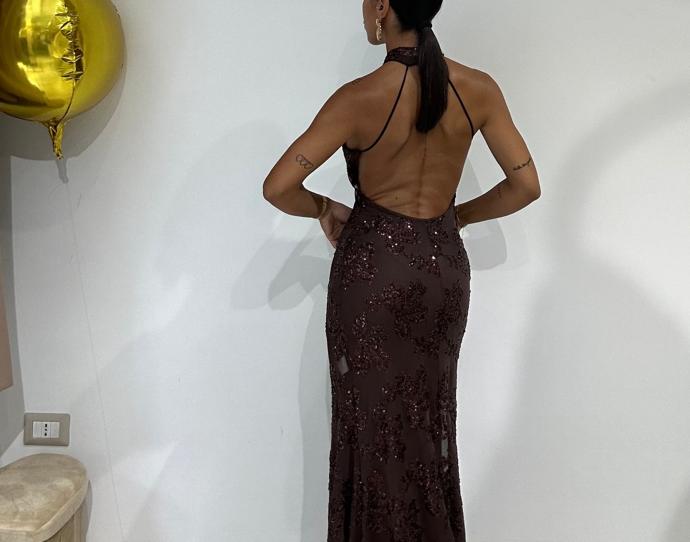 Abito lungo elegante modello sirena con applicazioni di paillettes.