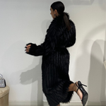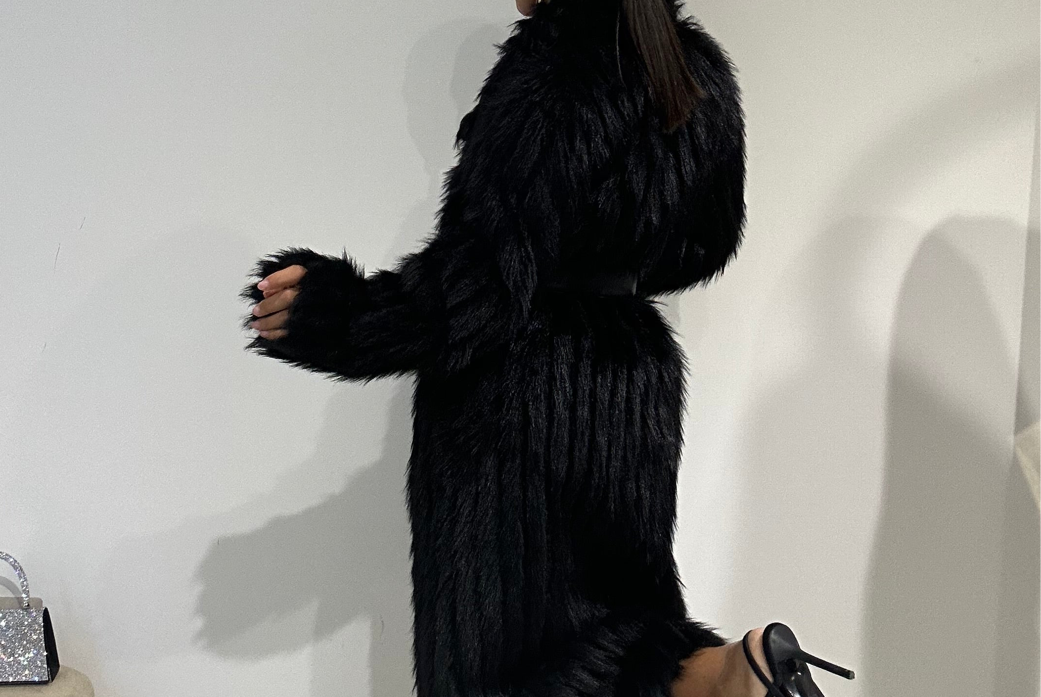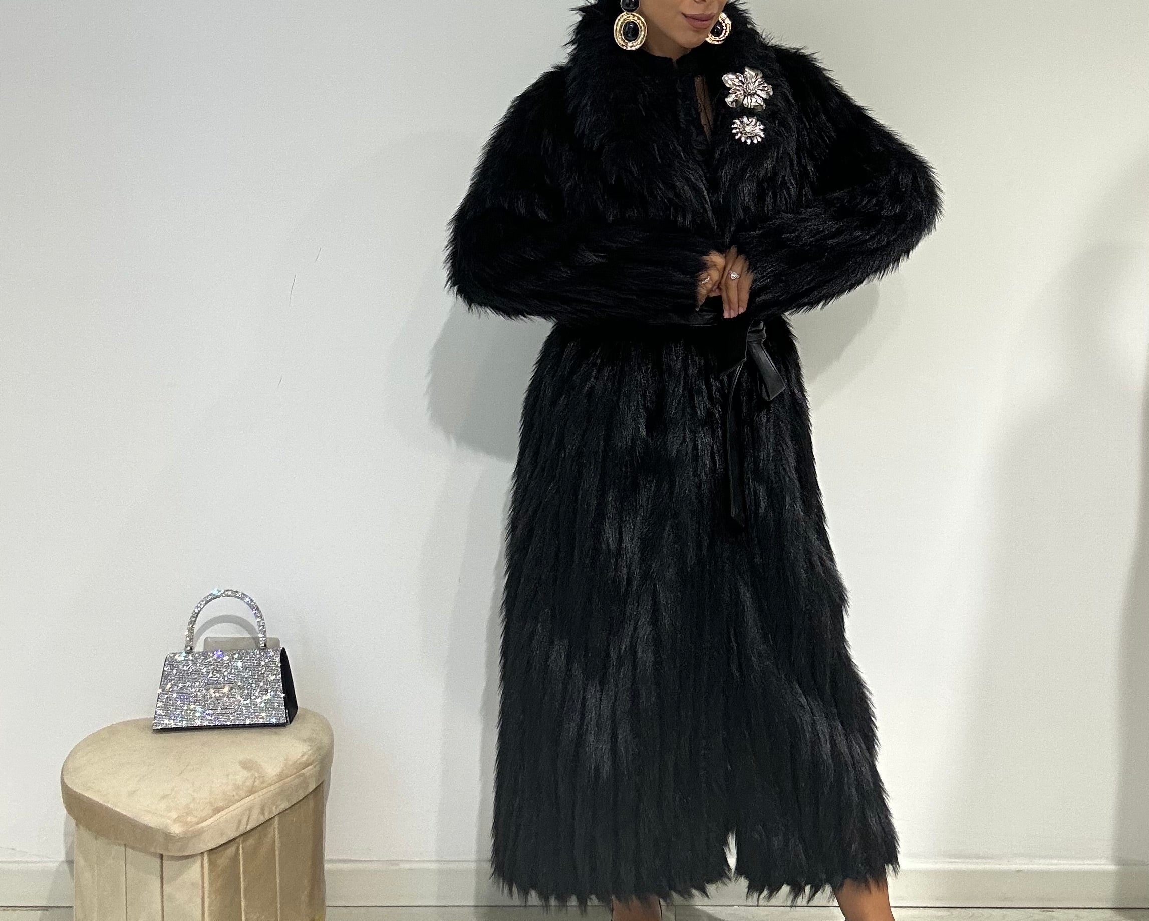 Eleganza e comfort si incontrano nel cappotto lungo modello “GHENTY”, realizzato in morbida ecopelliccia per un look sofisticato. La linea avvolgente è valorizzata da una cintura in ecopelle tono su tono, che sottolinea delicatamente il punto vita e permette di personalizzare la vestibilità. Completano il design spille gioiello applicate, che aggiungono un tocco di luce e originalità. Un capo versatile e raffinato, perfetto per affrontare l’inverno con stile.