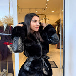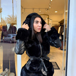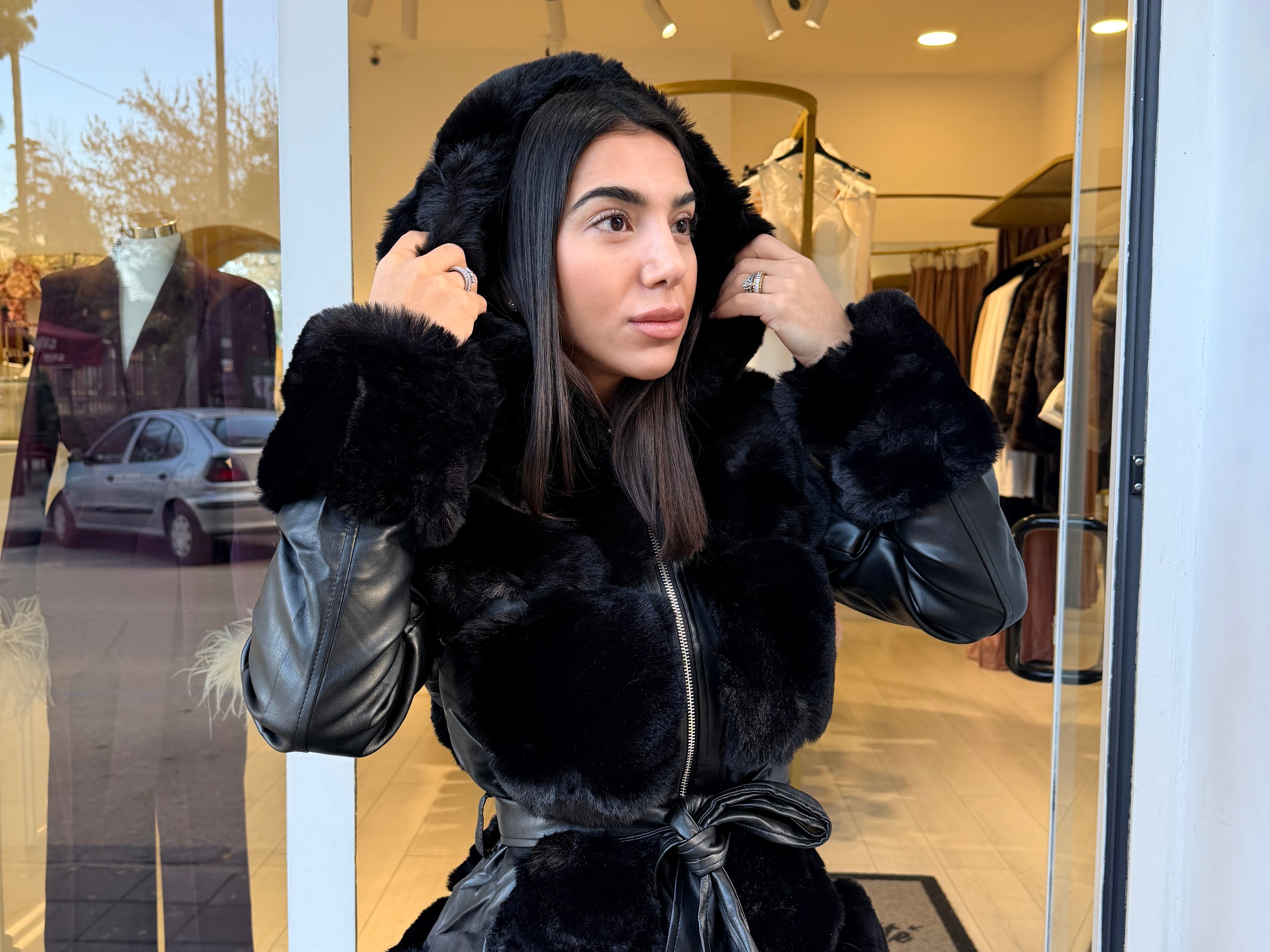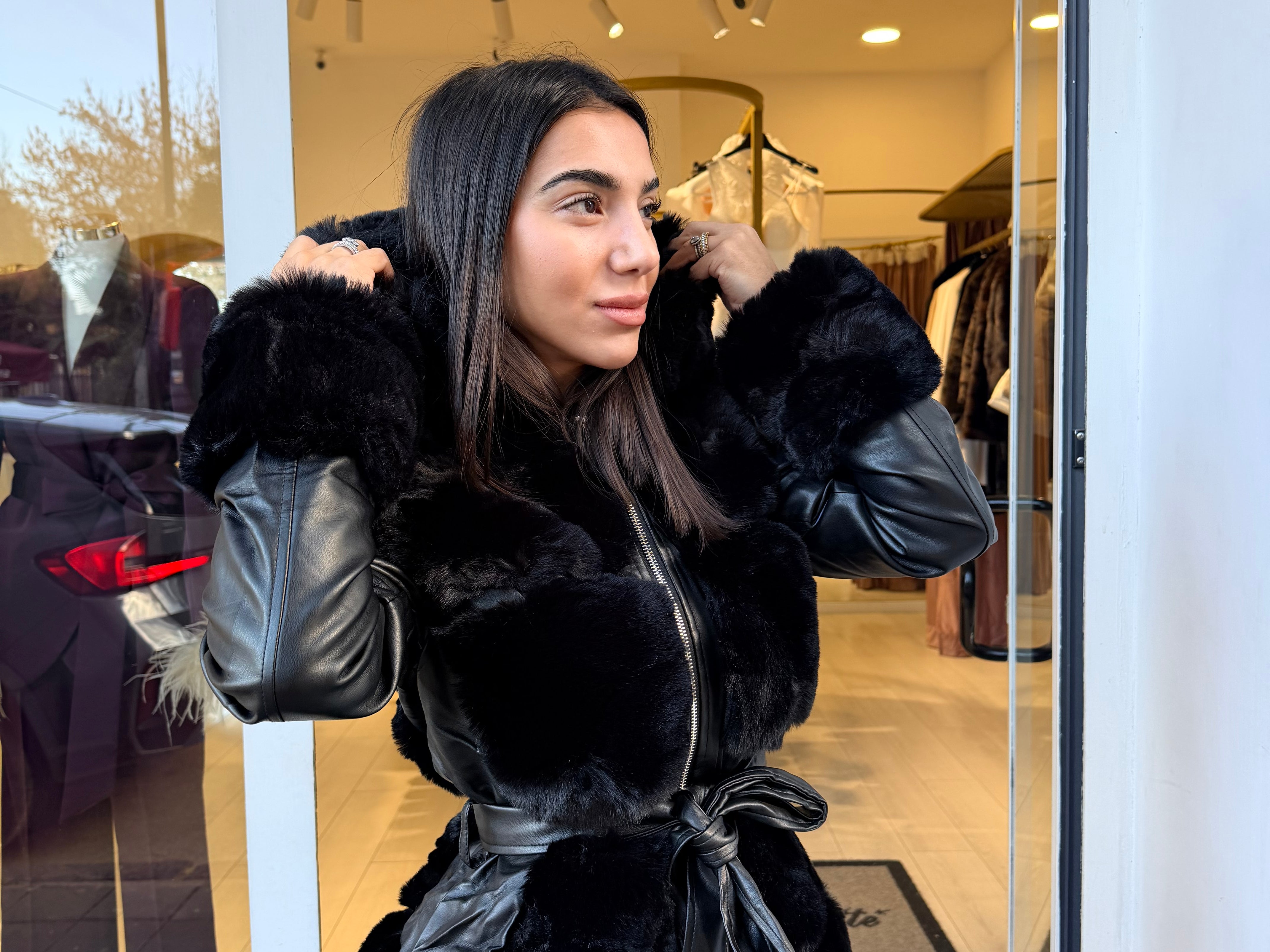 giubbotto nero con zip frontale e cintura in vita che valorizza il punto vita.