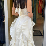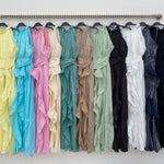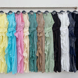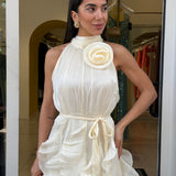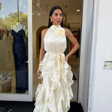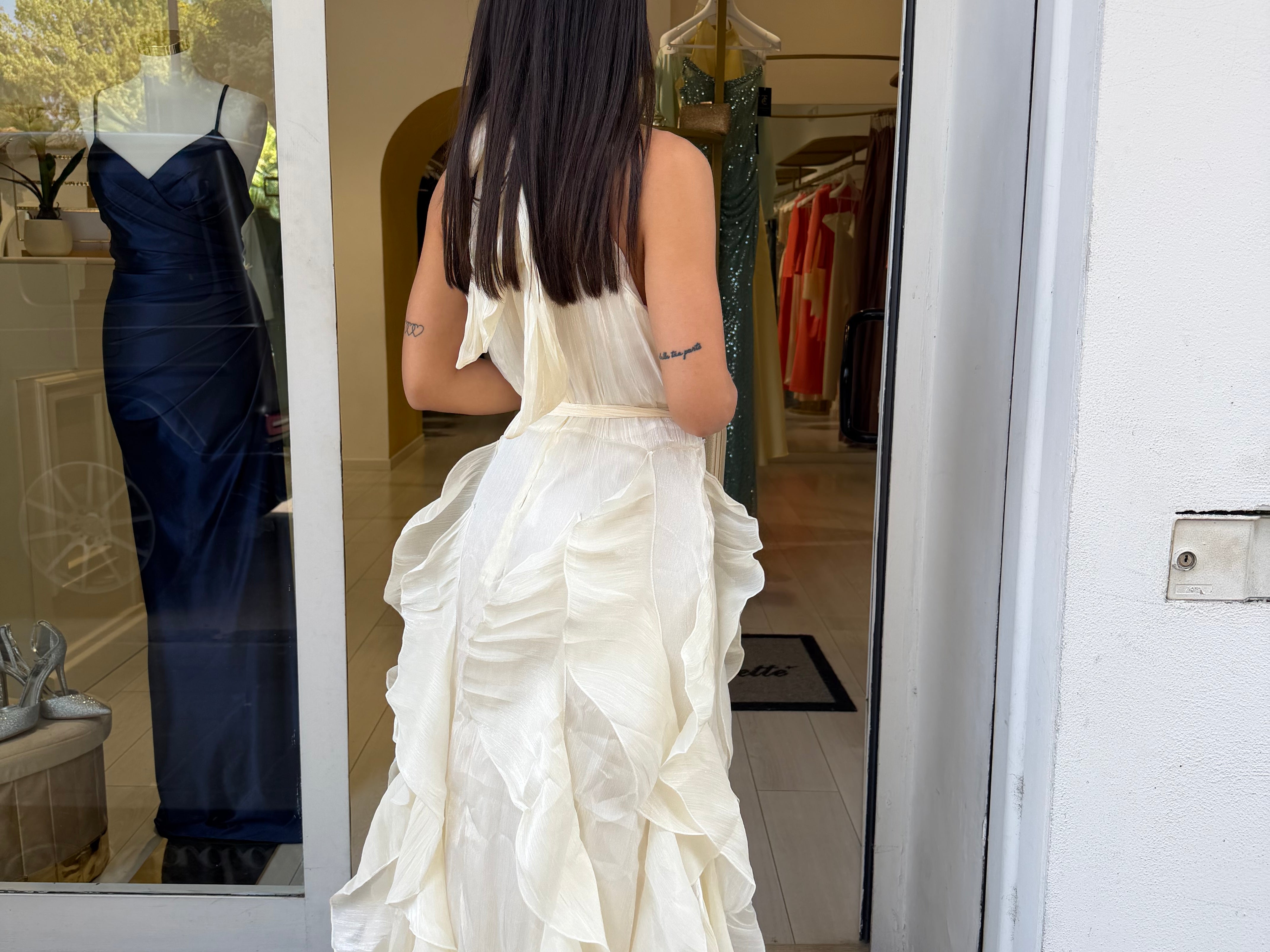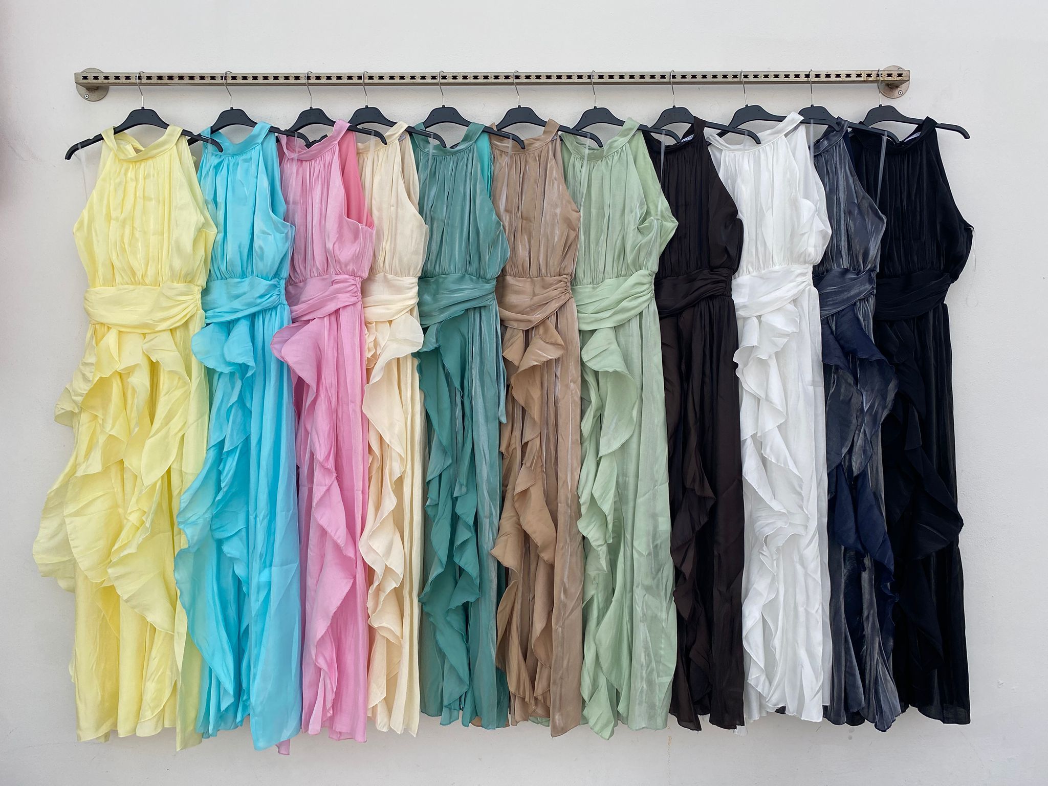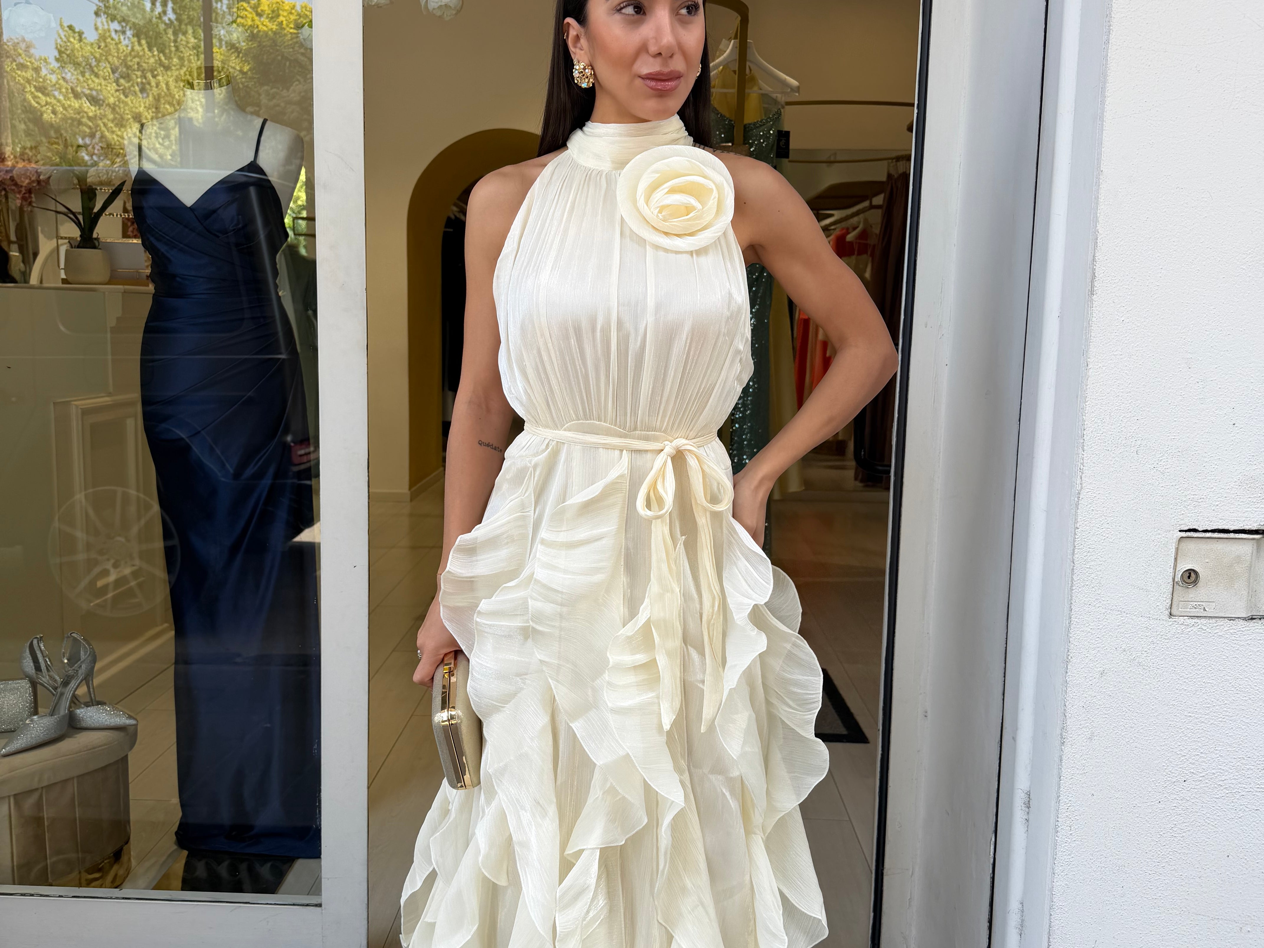 Abito lungo elegante e leggero, con collo alto e raffinato dettaglio floreale sul décolleté. Il tessuto plissettato accompagna la silhouette, mentre la gonna ricca di balze crea movimento e un effetto scenografico ad ogni passo. Punto vita definito con cintura per una vestibilità armoniosa e femminile, perfetto per occasioni speciali e serate indimenticabili.
