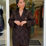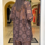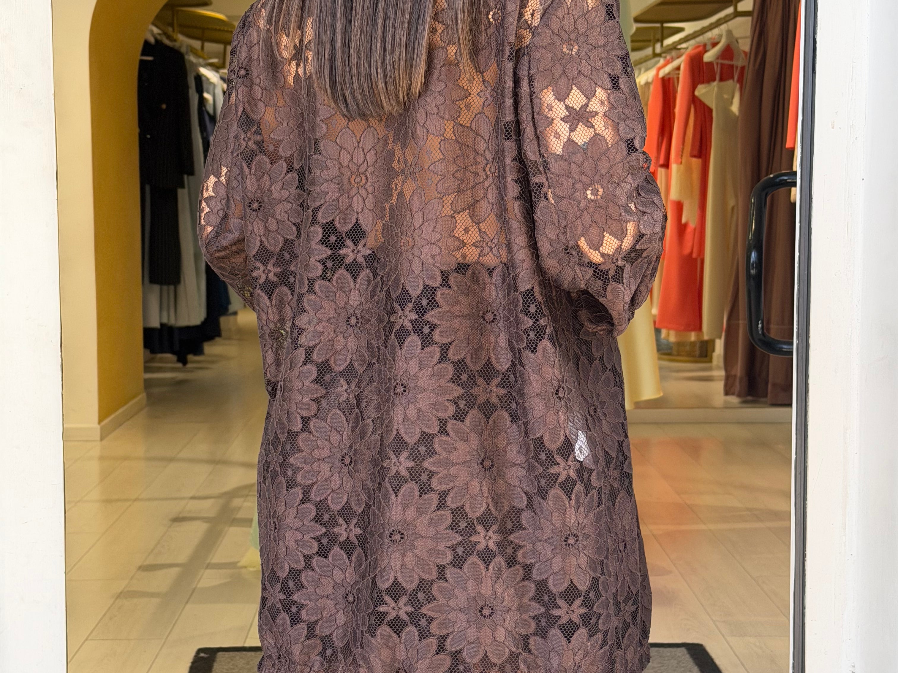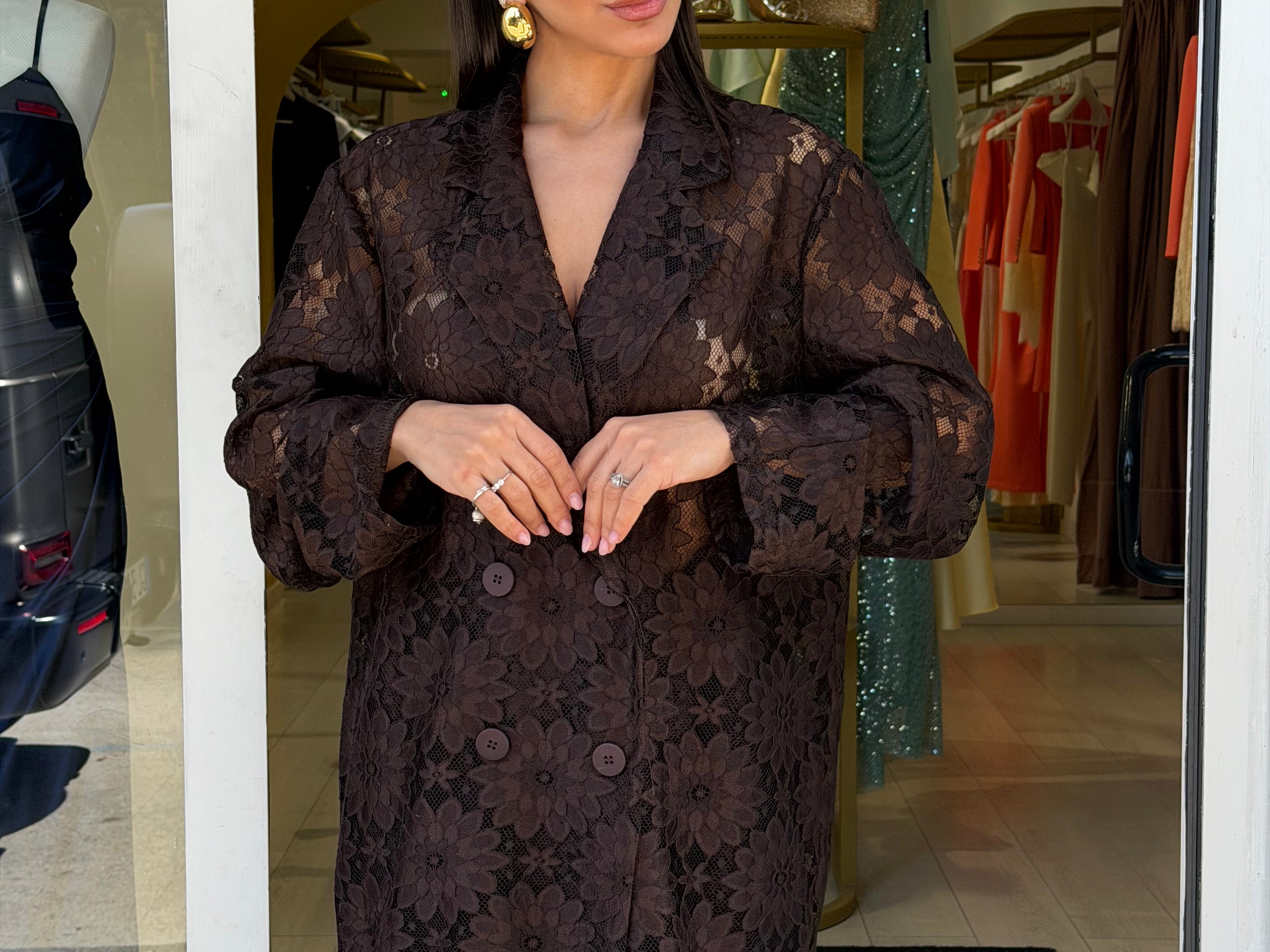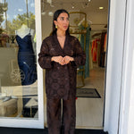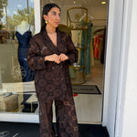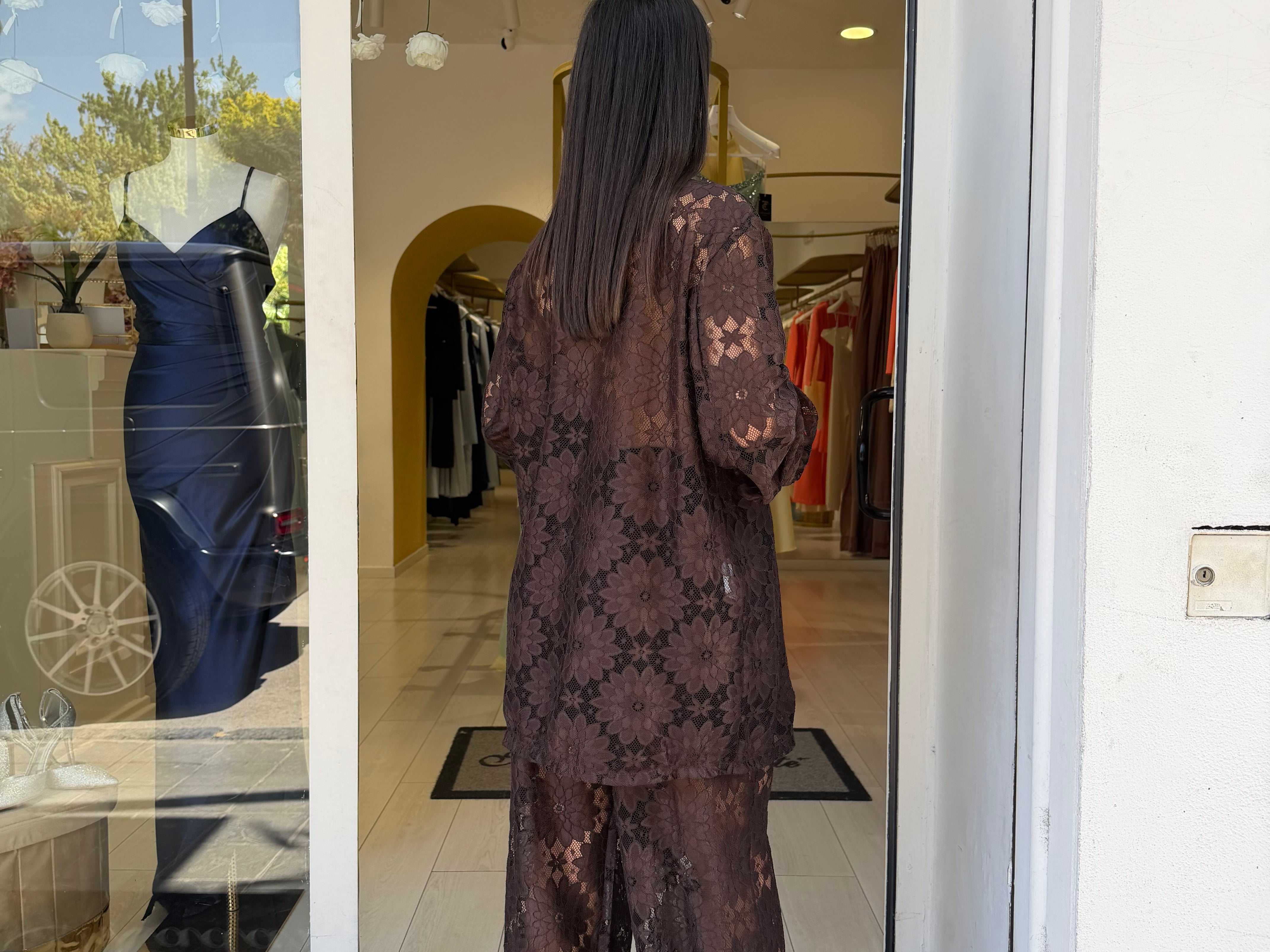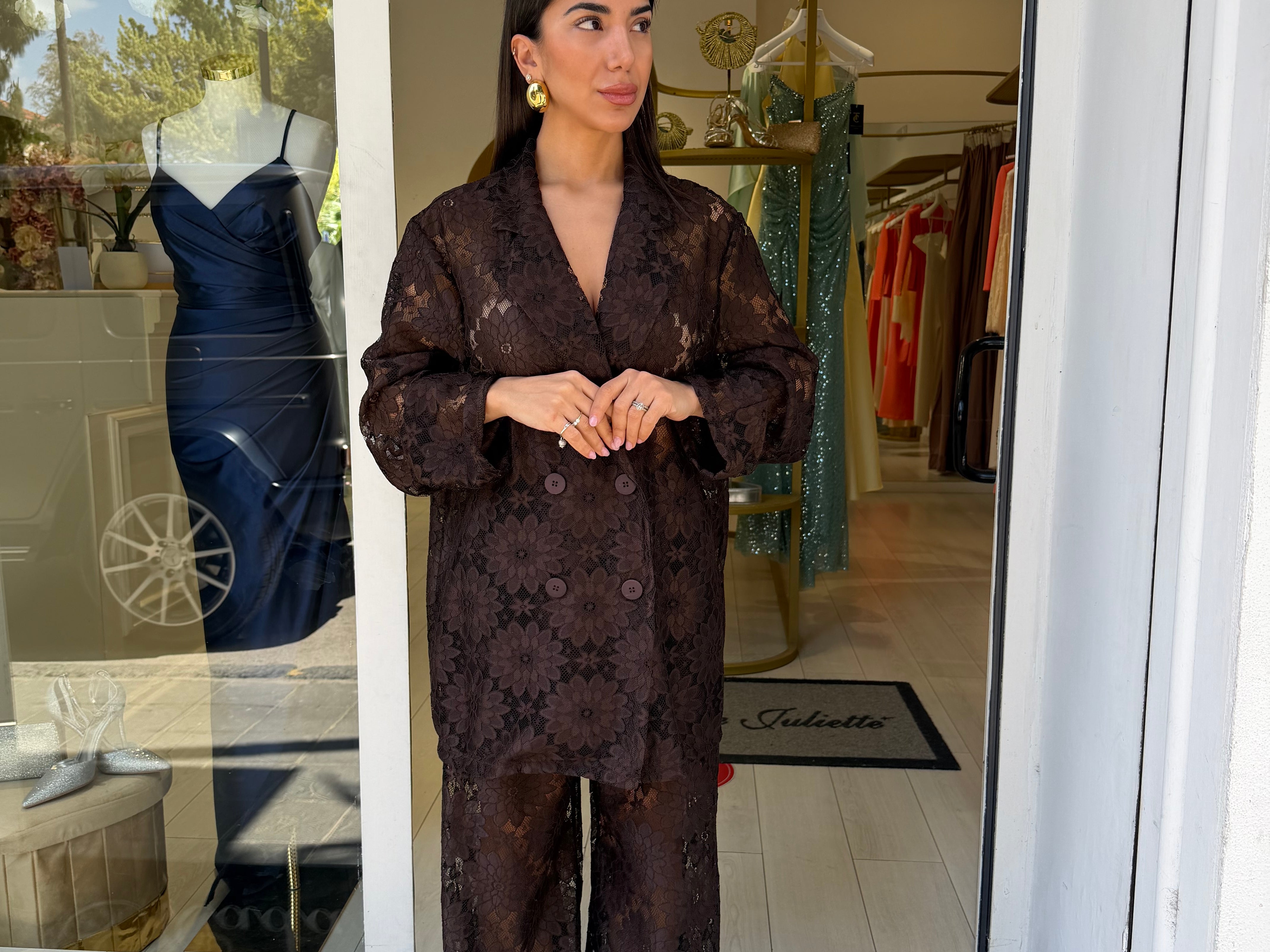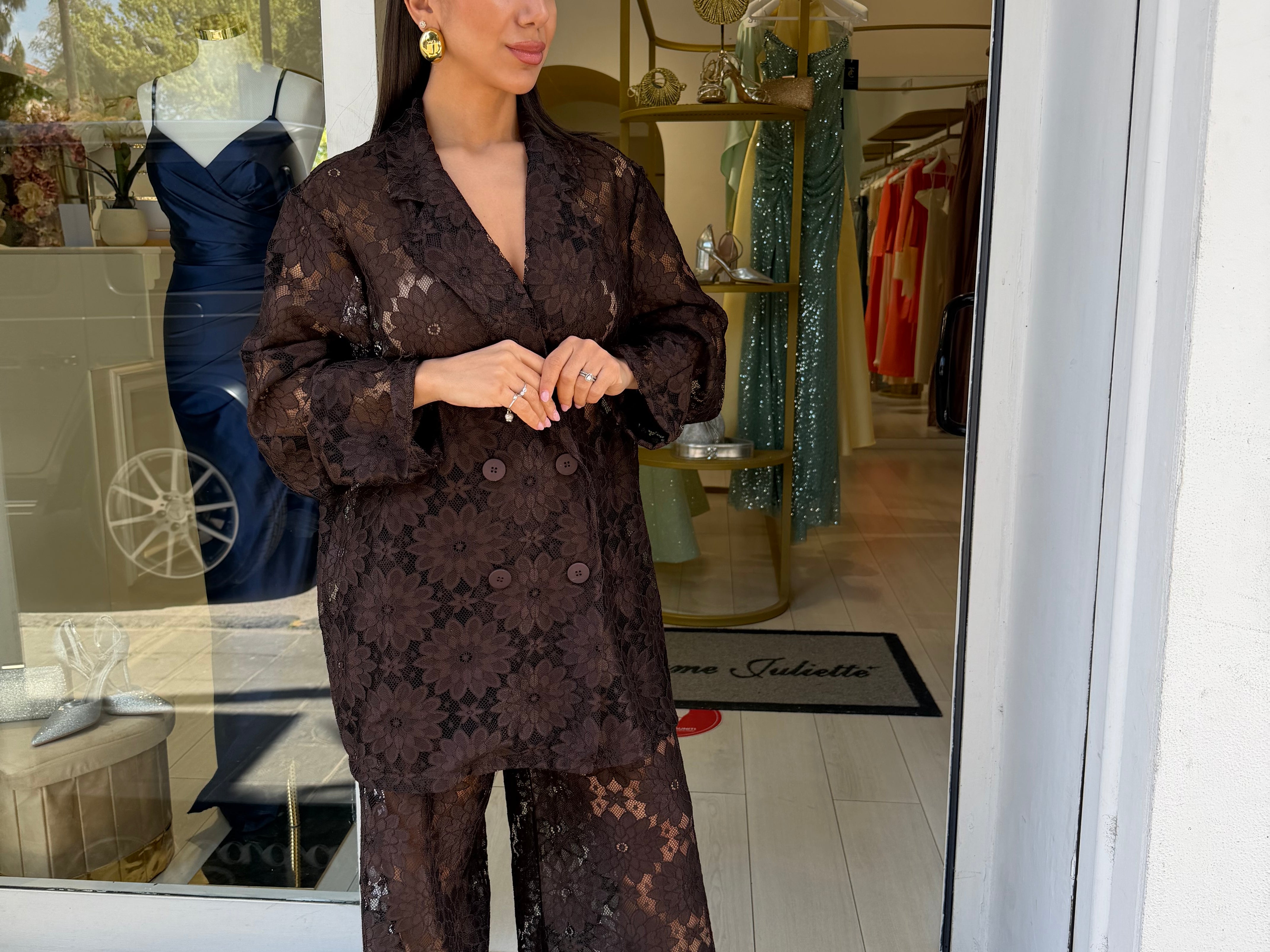 la giacca ha una chiusura doppiopetto realizzata in pizzo, Mentre il pantalone porta gli elastico in vita e ha una visibilità a palazzo