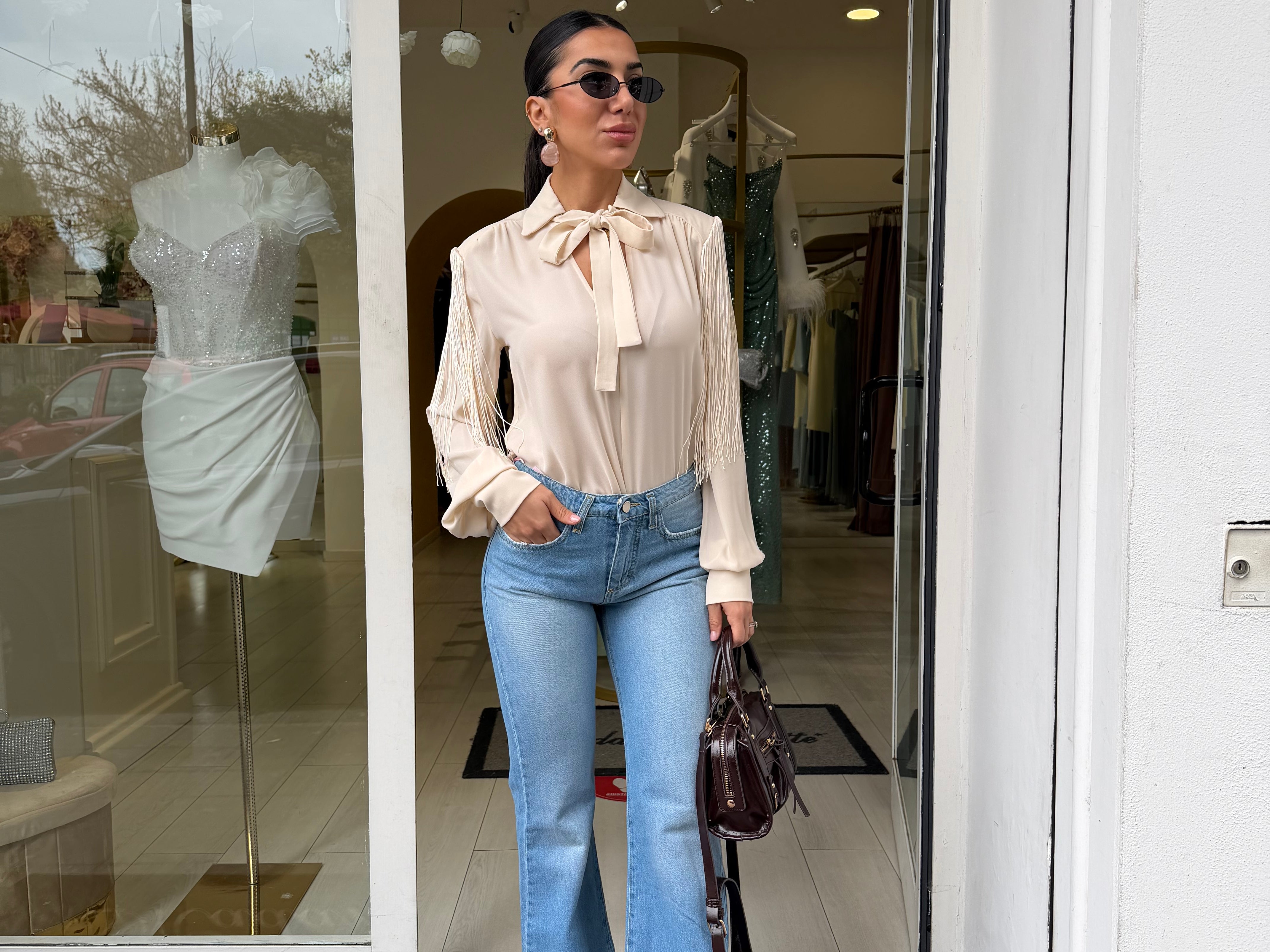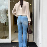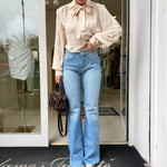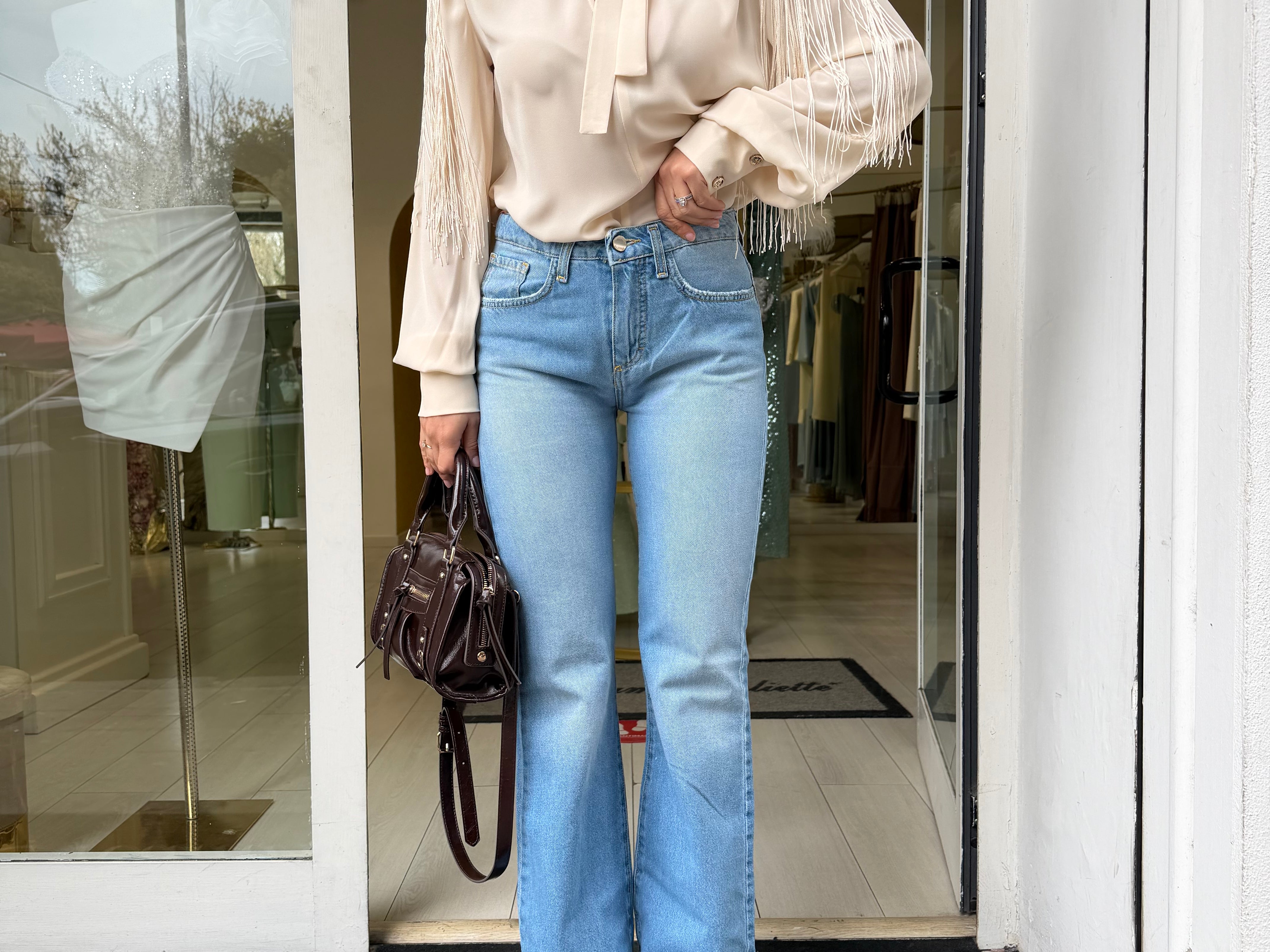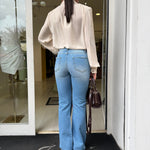 Jeans flare a vita alta dal design intramontabile, ideali per valorizzare la silhouette con un effetto slanciato e femminile. La vestibilità aderente sui fianchi esalta le forme, mentre la gamba si apre delicatamente sul fondo creando un movimento elegante e armonioso.