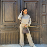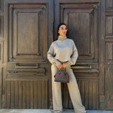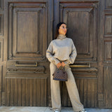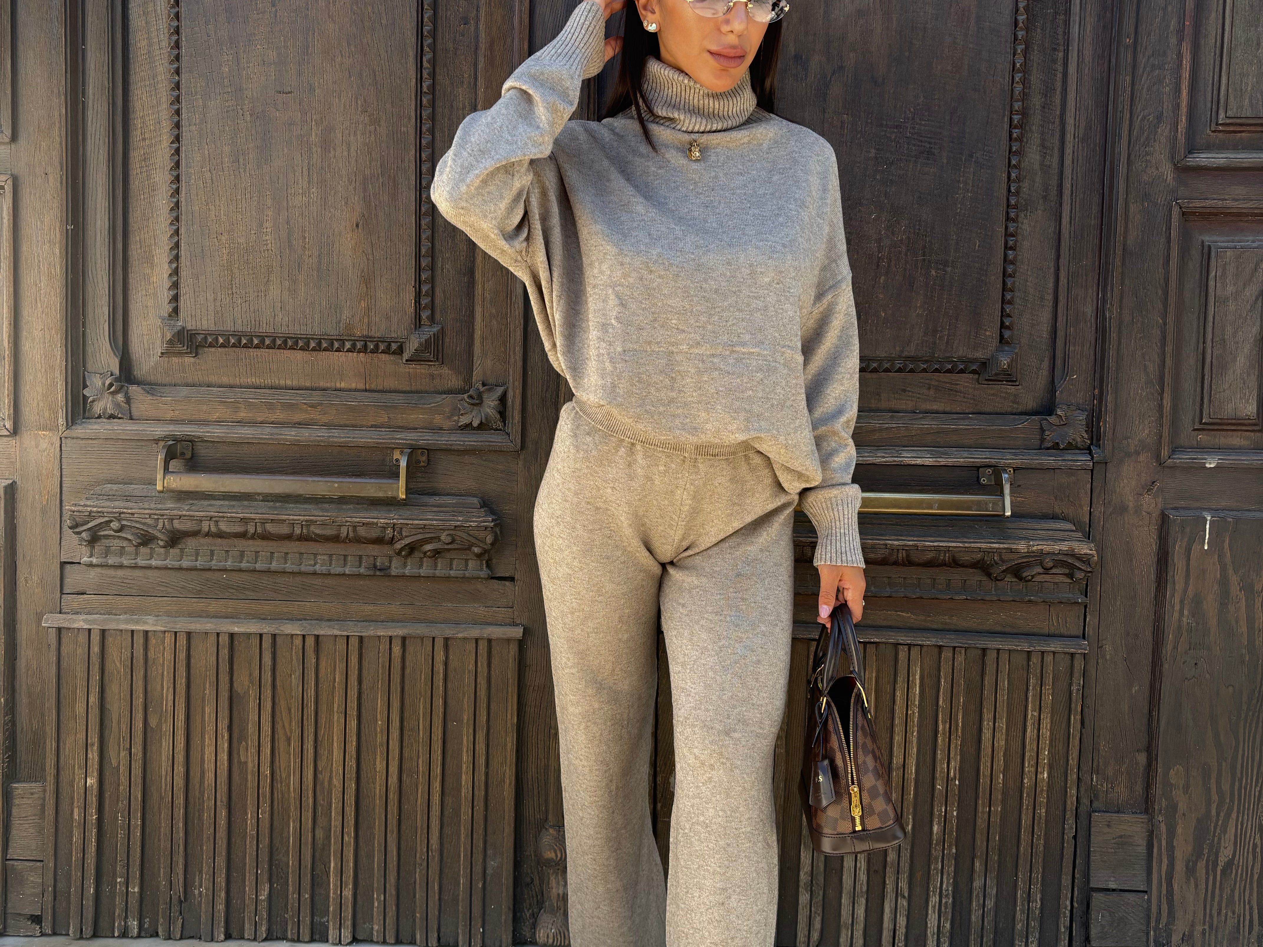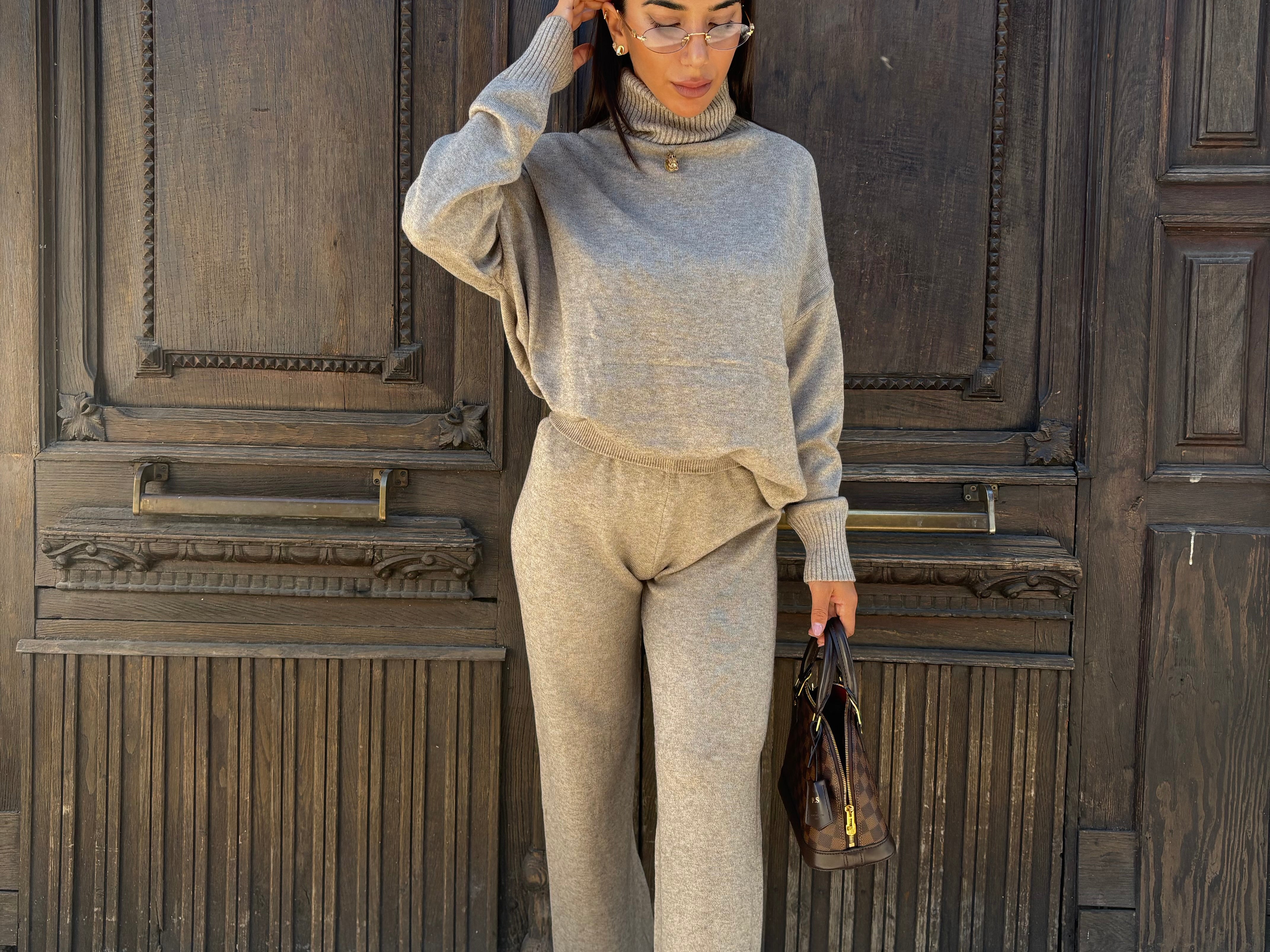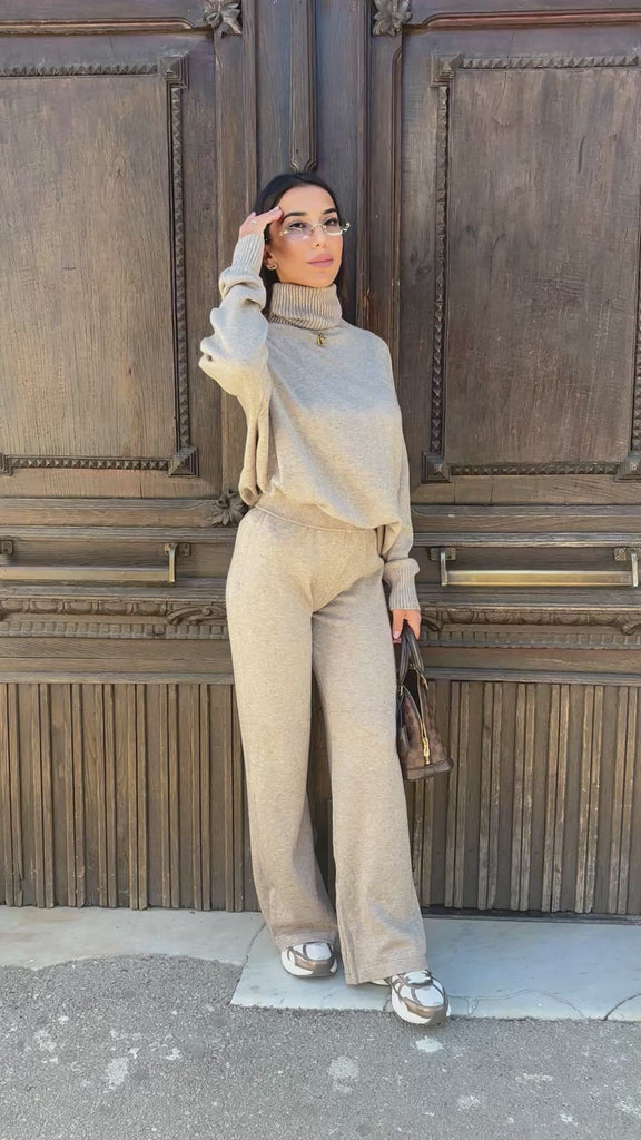completo in lana rasata con elastico in vita e maglione a collo alto