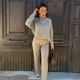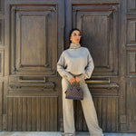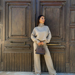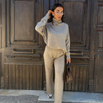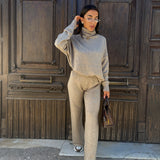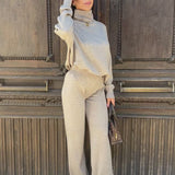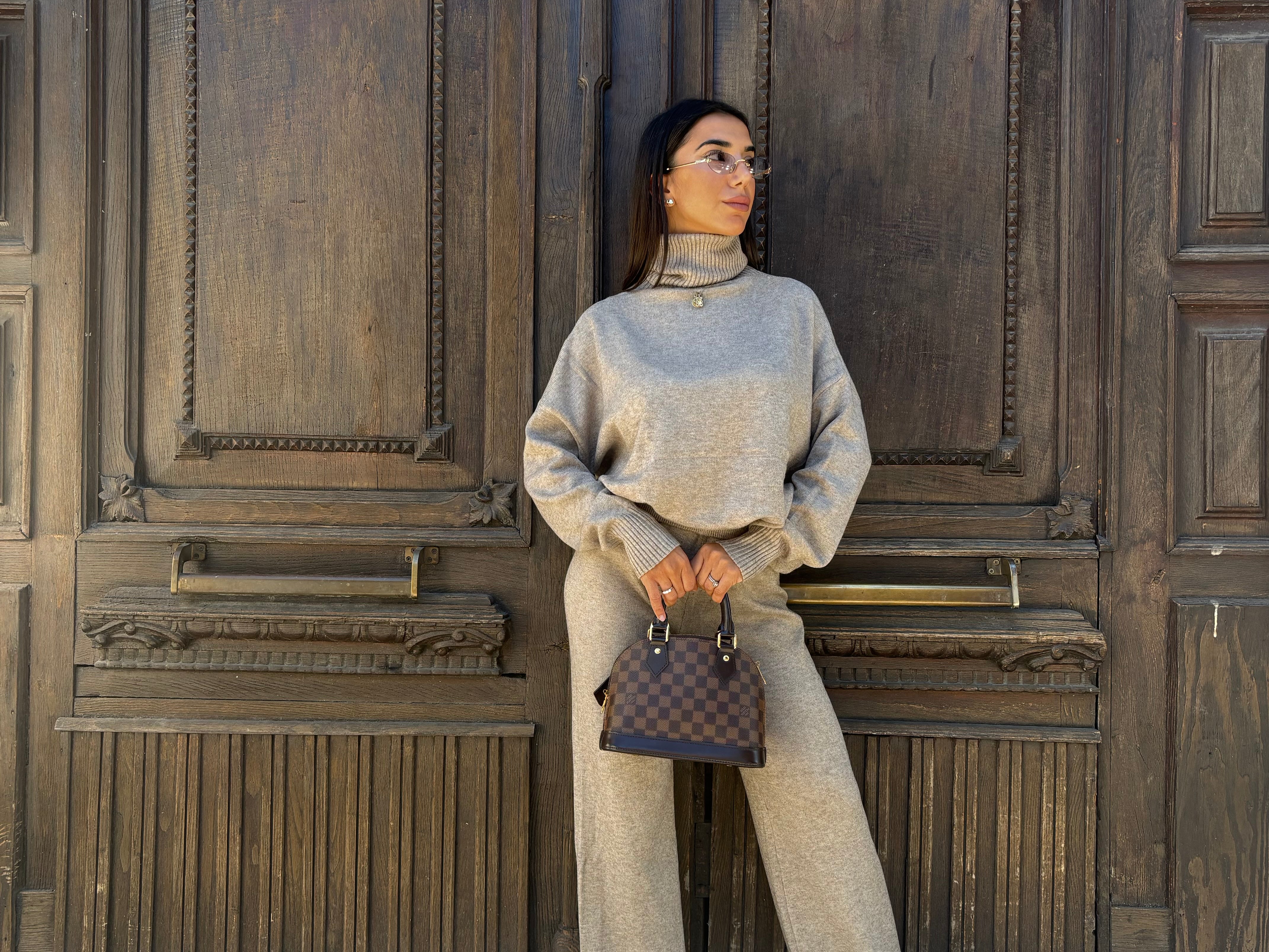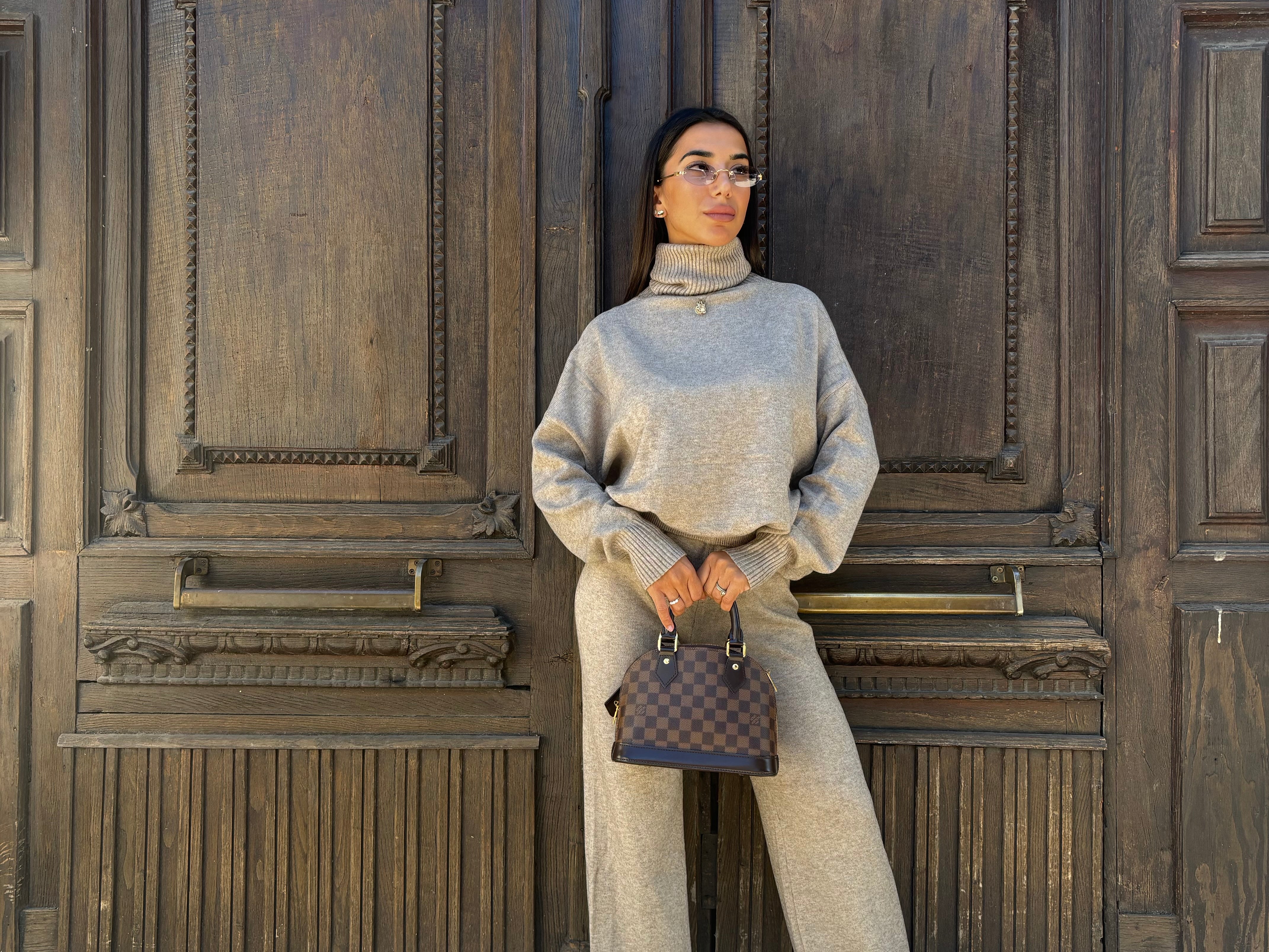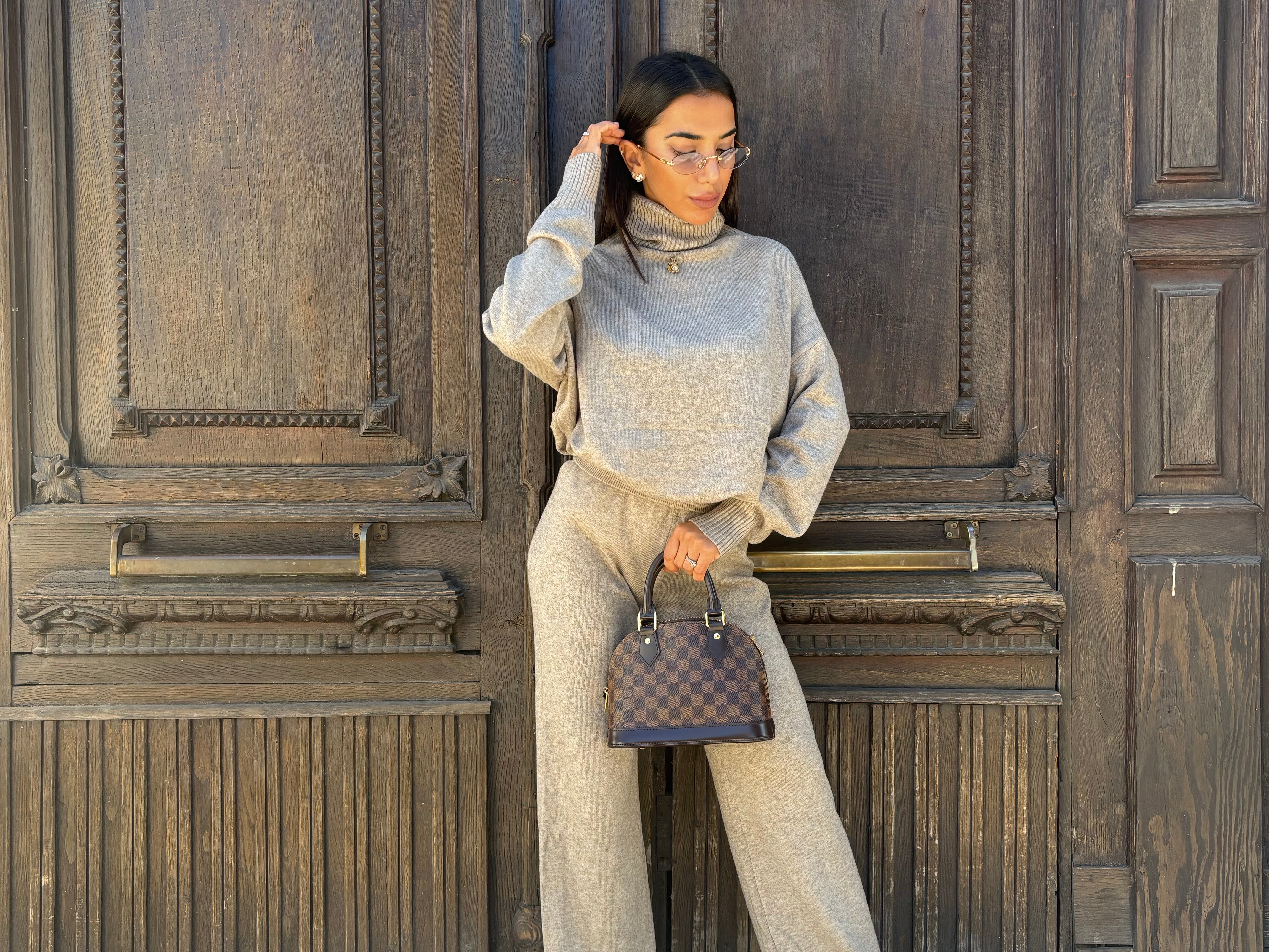 completo in lana rasata con elastico in vita e maglione a collo alto