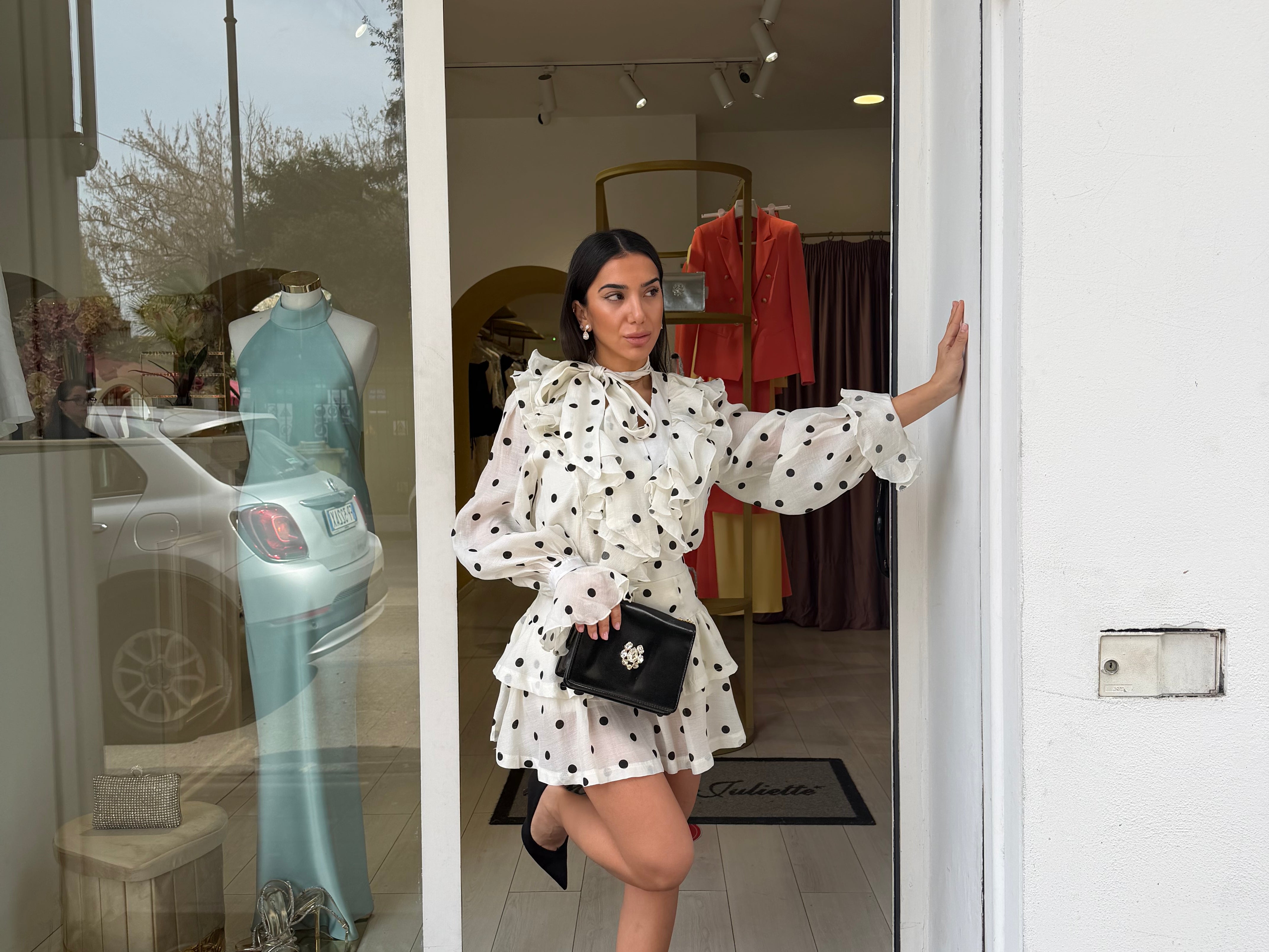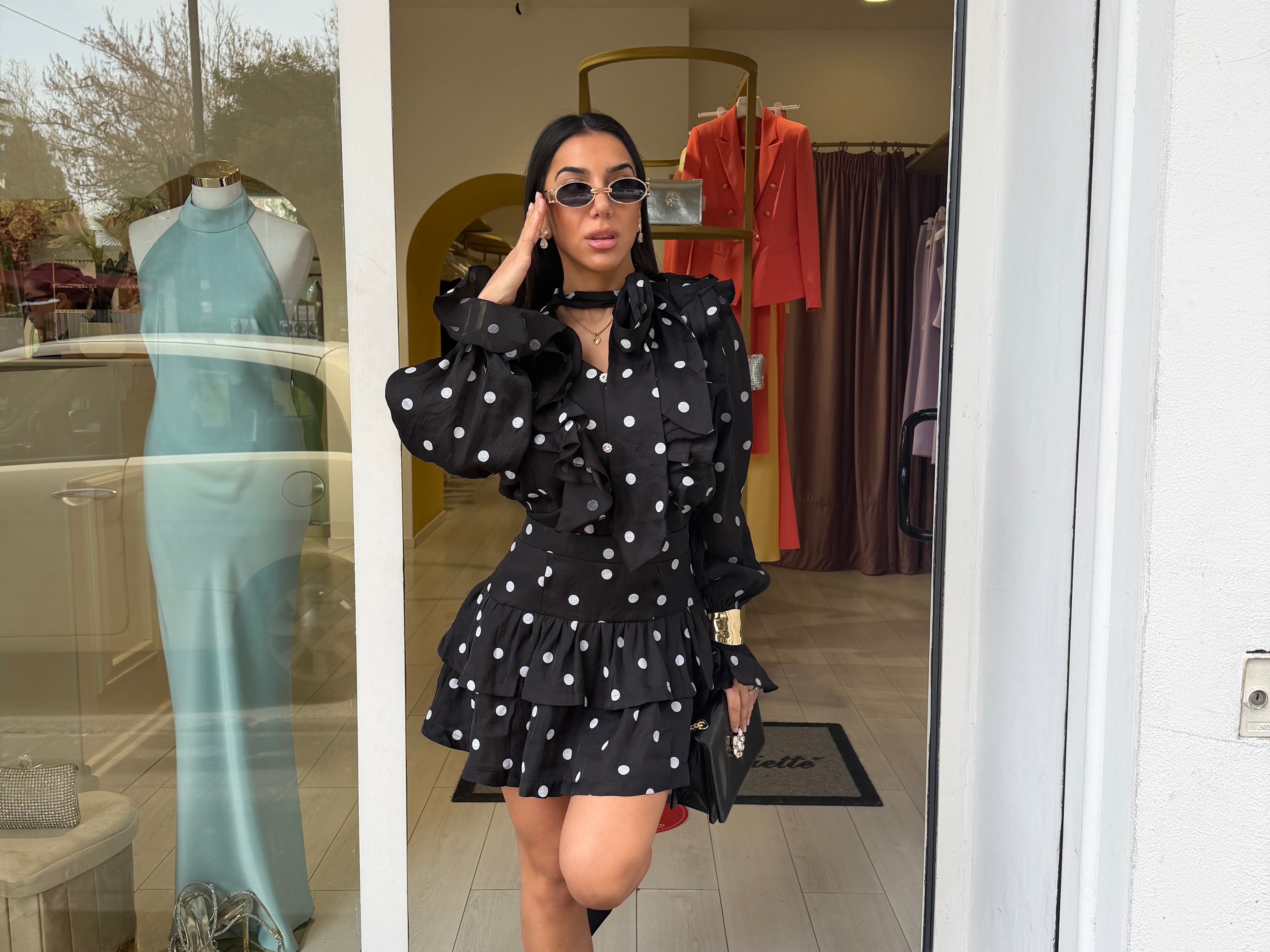 completo Paris composto da gonna a pois con blusa a pois un completo molto romantico adatto per i vostri eventi Easy chic la modella è alta uno 1 65.