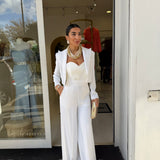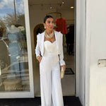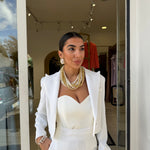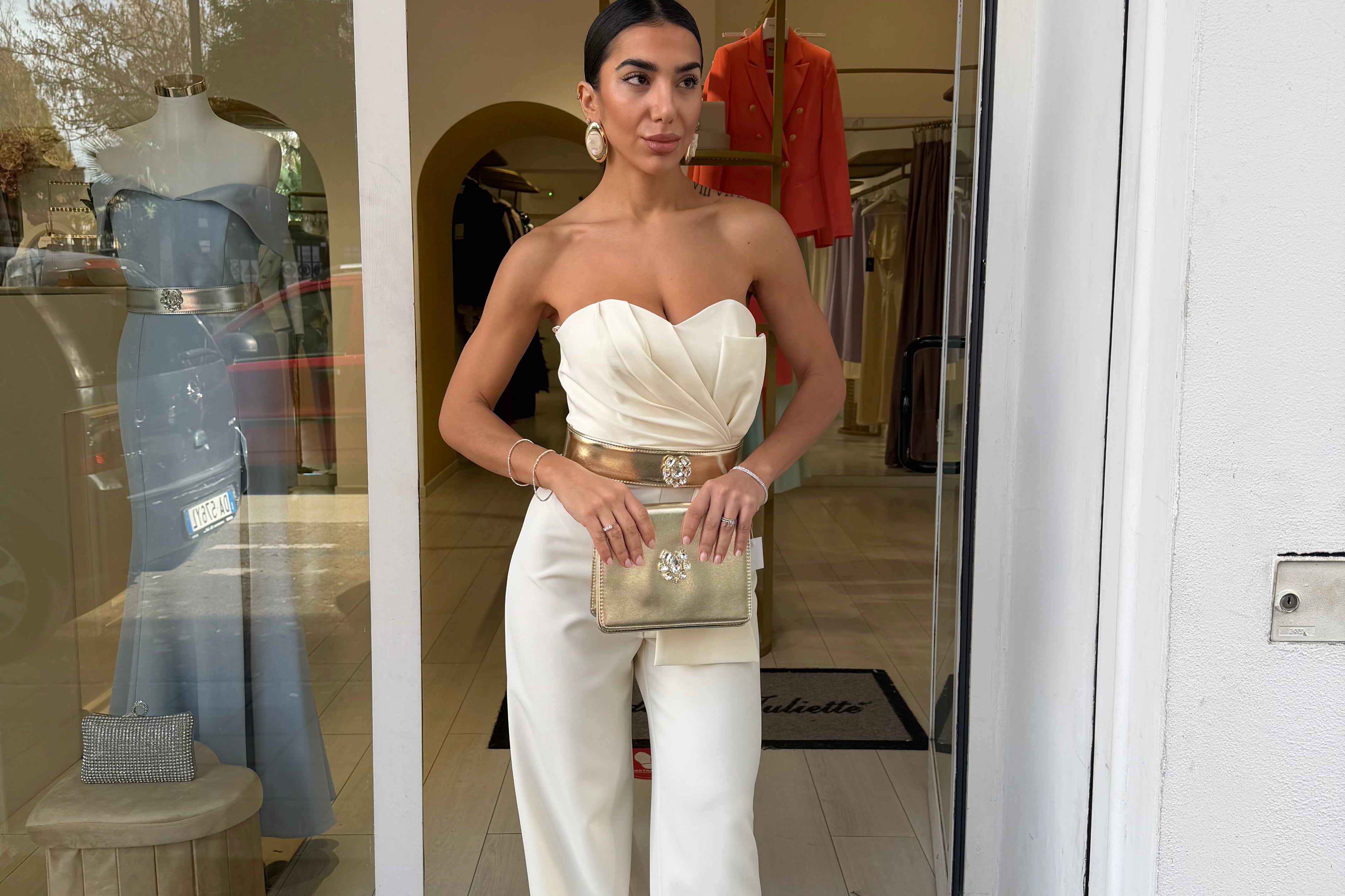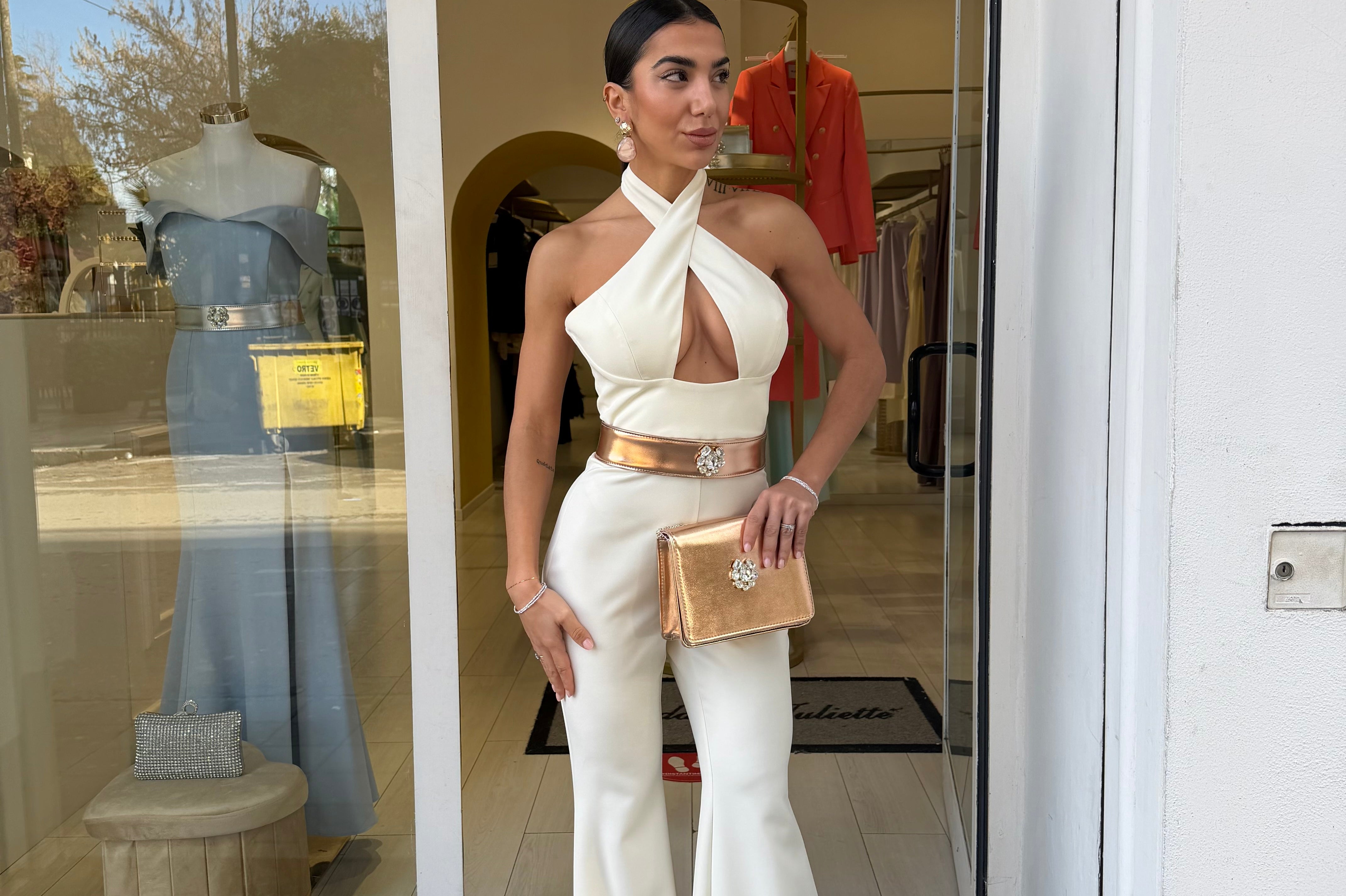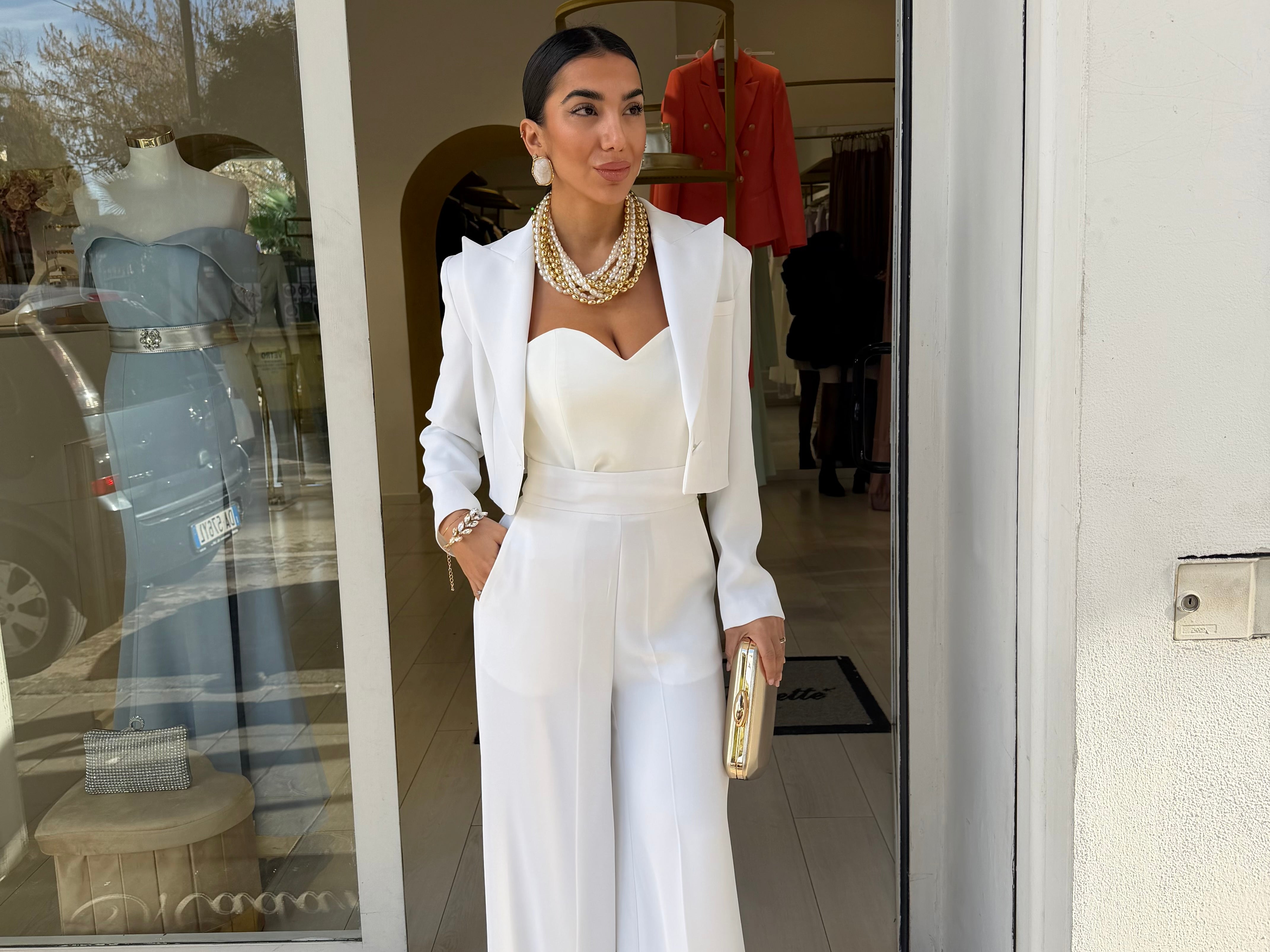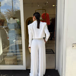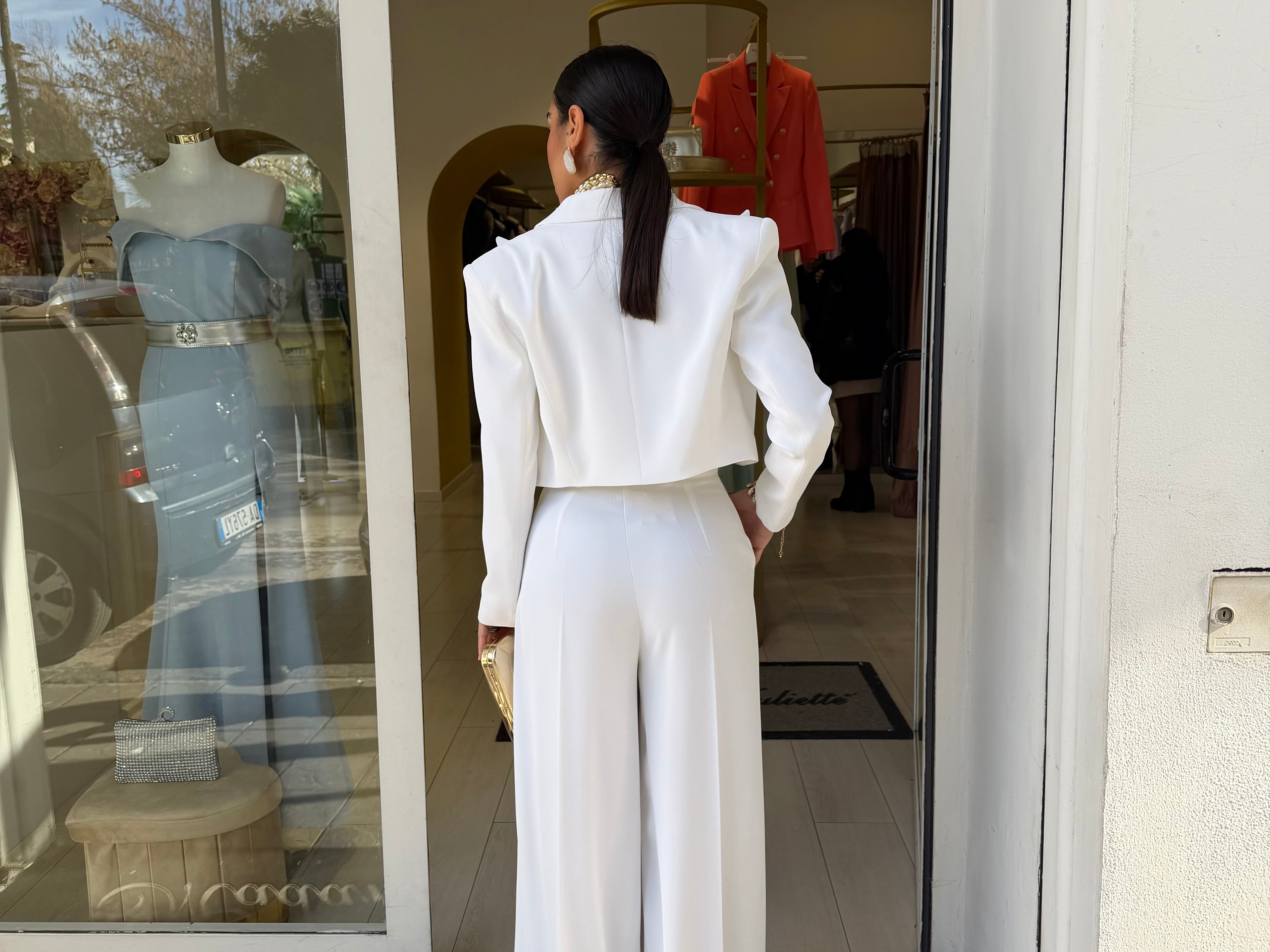 tailleur con giacca corta in vita che presenta un taglio strutturato con spalline pronunciate che definiscono la figura!